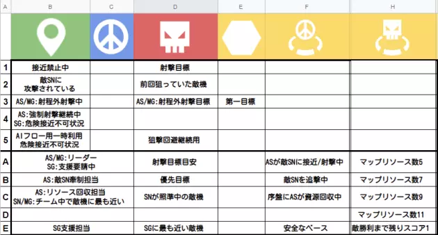 本来还想再写一点,但太累了就先到这里吧。 战略移动技巧集 ・资源收集时务必重视距离。无论敌人或友军是否存在,前往过远的资源点或基地都是在浪费时间,不要过度绕远路。另外,使用霰弹枪或突击步枪去拾取资源时,自身到资源点的距离以及最近友军基地到资源点的距离同样重要,因为拾取资源后移动速度会从1.2或2.0降至0.5。在收集过程中适当吸引敌人火力,要是还能形成包围就再好不过了。不过要为此选对资源点确实有点难…… ・把干扰敌人收集资源纳入战术选择,能让游戏局势更稳定。比如,当敌方基地里有携带资源的敌机,且距离你的霰弹枪或突击单位在射程内时,如果你正处于领先,就应该前往那个基地进行资源干扰。另外,当敌方狙击手瞄准我方狙击手时,如果我方狙击手正在瞄准其他敌人,就会在狙击对决中落败。虽然需要观察战况,但这种情况下最好让我方狙击手重新攻击敌方狙击手。【从那之后】说实话,从第16章左右开始,敌方队伍会变得非常强大,完全不知道该如何取胜。小打小闹几乎不会改变胜率,胡乱调整甚至可能导致战力下降。如果陷入僵局,差不多可以尝试挑战多人模式了。于是会出现各种各样的敌人,也能发现之前未曾显现的问题。 明明花了那么多心思去设计,却做出了出乎意料的蠢笨举动。 与战役模式不同,由于具有特色的敌人增多,他们的行动方式会很有参考价值。 继续游玩,不断改进,直到胜率跌破60%变得困难为止。 之后就在战役模式和多人模式之间反复切换。 不过从这里再往上提升并不容易。 总之要仔细观察输掉比赛时敌人的行动,从中寻找线索。 这款游戏没有随机要素,所以在某种意义上答案都在其中。基本行为应该已经完成了,所以请重点观察对手是如何考虑抢占资源的。 附录 计算需要多少秒才能摧毁一台机器人的DPS机枪,用这个时间来算出DPS。 版本更新后随机数可能会发生变化,数值可能会有少许差异。种类 远距离 中距离 近距离 霰弹枪 0 722 2167 突击步枪 220 765 1444 机关枪 255 1181 2167 狙击步枪 619 619 619 ■远距离 突击步枪 220/秒 59秒 49连发(265/连发) 机关枪 255/秒 51秒 6连发(2167/连发) 狙击步枪 619/秒 21秒 7发(1857/发) ■中距离 霰弹枪 722/秒 18秒 18发(722/发) 突击步枪 765/秒 17秒 14连发(929/连发) 机关枪 1181/秒 11秒 2连发(6500/连发) 狙击步枪 619/秒 21秒 7发(1857/发) ■近距离 霰弹枪 2167/秒 6秒 6发(2167/发) 突击步枪 1444/秒 9秒 8连发(1625/连发) 机关枪 2167/秒 6秒 1连发 狙击步枪 619/秒 21秒 7发(1857/发)直接朝着那架敌机飞去的话,会一边转弯一边接近,这样会浪费距离,还有可能接近到其他敌机。朝着敌机正在接近的基地飞去会更稳妥。如果是平局或者处于落后状态,就需要追加条件,确认是否比资源回收的优先级更高。 ・如果能包围敌方队伍,就能在战斗中占据优势。友机无论是接近还是后退,对所有敌机基本都有效,但被包围的一方即使接近,也只能缩短与部分敌人的距离,甚至后退时还有可能反而靠近敌人。要实现包围,可以采用一些方法,比如让霰弹枪机器人前往地图边缘的资源点,或者在敌方护盾消失无法前进时从左右方向展开。 组建强大的队伍: 每个人一开始都只能编写出较弱的AI。 我也是通过不断尝试和犯错,才逐渐有所进步。 游戏本身难度较高且内涵丰富,虽然是异步对战,但也会有感到艰难的时候。 我写下了一些在游玩时需要注意的事项。 另外,我目前的游戏时长约为190小时,如果有不懂的地方,随时可以问我。【最初的50小时左右】一开始要制作一个完整的AI应该是很困难的。请参考上述基本的AI流程项目,尝试一部分一部分地制作。即使是多人对战的顶尖玩家,也可能出现程序错误或在特定场景下做出错误行为。总之,通过游玩战役来观察AI的行为,反复修正问题点,提高AI的精度吧。虽然我没玩过淘汰战和统治战,但个人认为收藏模式是熟悉游戏的最佳选择。多人对战中每次战斗的敌人都会变化,所以不推荐。面对使用相同AI的敌人,你要不断改良自己的AI来提高完成度,从而逐步推进战役章节。 现阶段无需过多考虑战略及机器人之间的配合。请提高基本行为的精度,设计出能在正面交火中占据些许优势的AI。 队伍编成建议全部使用突击型机器人,或者混入一个狙击手。 战役中的敌方队伍经过精心设计,在同一章节中就有多种类型,比如全力抢夺中央资源的敌人、优先收集资源的敌人,以及不考虑资源收集只顾冲锋的敌人等,种类十分丰富。由于AI设计的原因,会出现不擅长应对的对手,因此胜负不稳定是很正常的情况。不过,通过打磨基础设计,你将能够稳定战胜一定水平的对手,所以请先持续进行改良。 【收集战役 第15章左右】通过不断游玩,基本动作会逐渐完善,能够做出恰当的状况判断,几乎不会再出现奇怪的行动。 但根据对手和地图的不同,有时也会遇到无论如何都无法取胜的困境。引入新类型的机器人、改变撤离时机、调整资源回收优先级……但对于已经达到这个阶段的玩家来说,这些做法很少能带来成果。 完成基本设计的玩家需要做到两点:一是考虑战略层面,二是打造能在特定场景中占据优势的AI。 首先说说战略,关键在于哪一方能抢占距离地图中央最近的资源。只要拿下它,再获取己方阵营一侧的资源就能达到过半数。 不过这一点敌人也心知肚明,因此中央区域的战斗会异常激