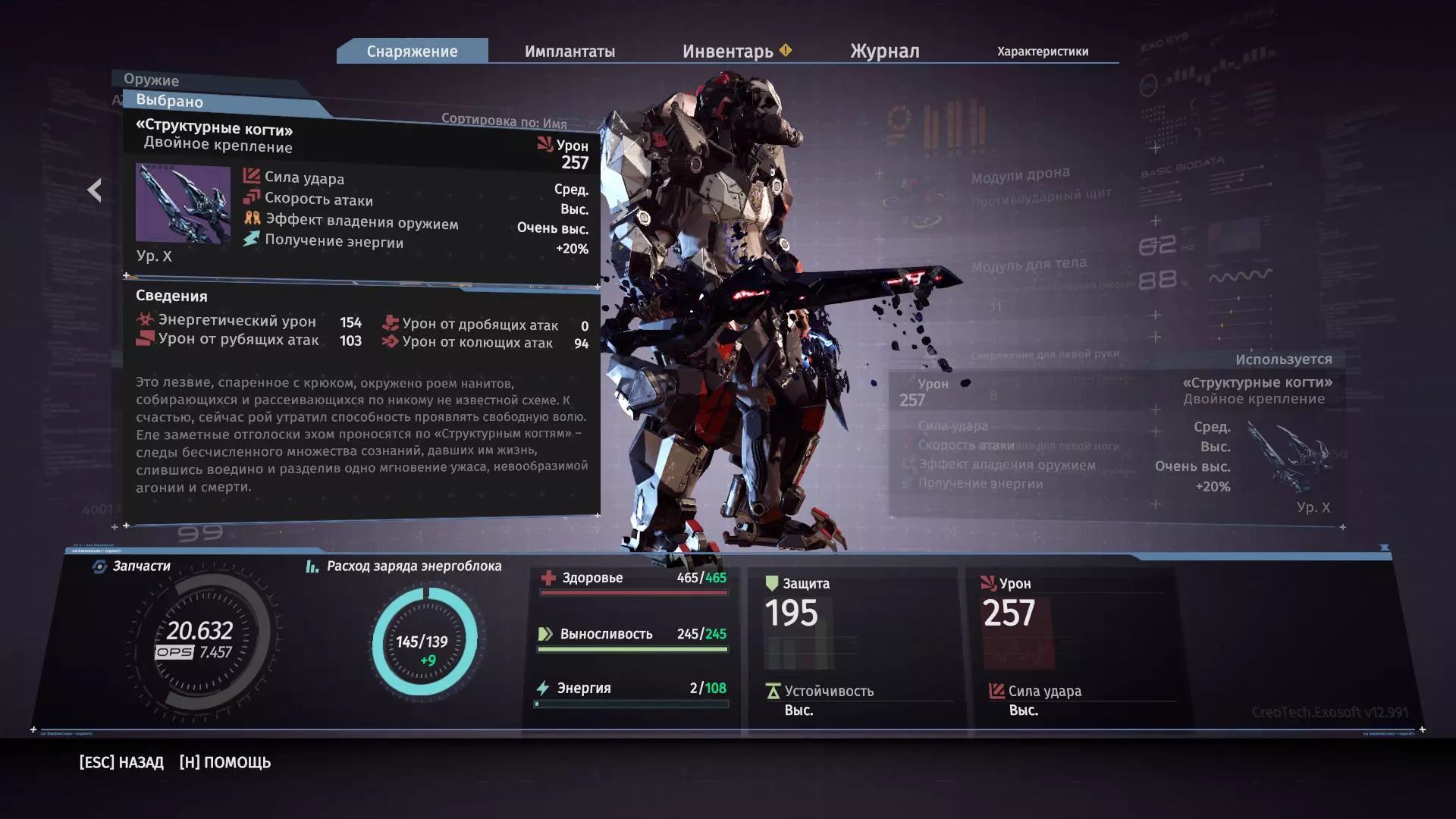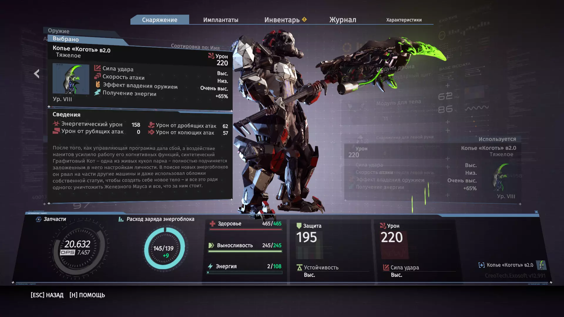 基础属性:基础伤害:29 攻击力度:中等 攻击速度:中等 武器掌握效果:极高 能量获取:+30% 获取方式:切断赫尔维格救援小队指挥官的右手。如果不这样做,击败 boss 后将获得标准救援长矛。 武器特性:提升伤害和攻击速度,尤其是攻击速度。 “利爪”长矛 v.2.0