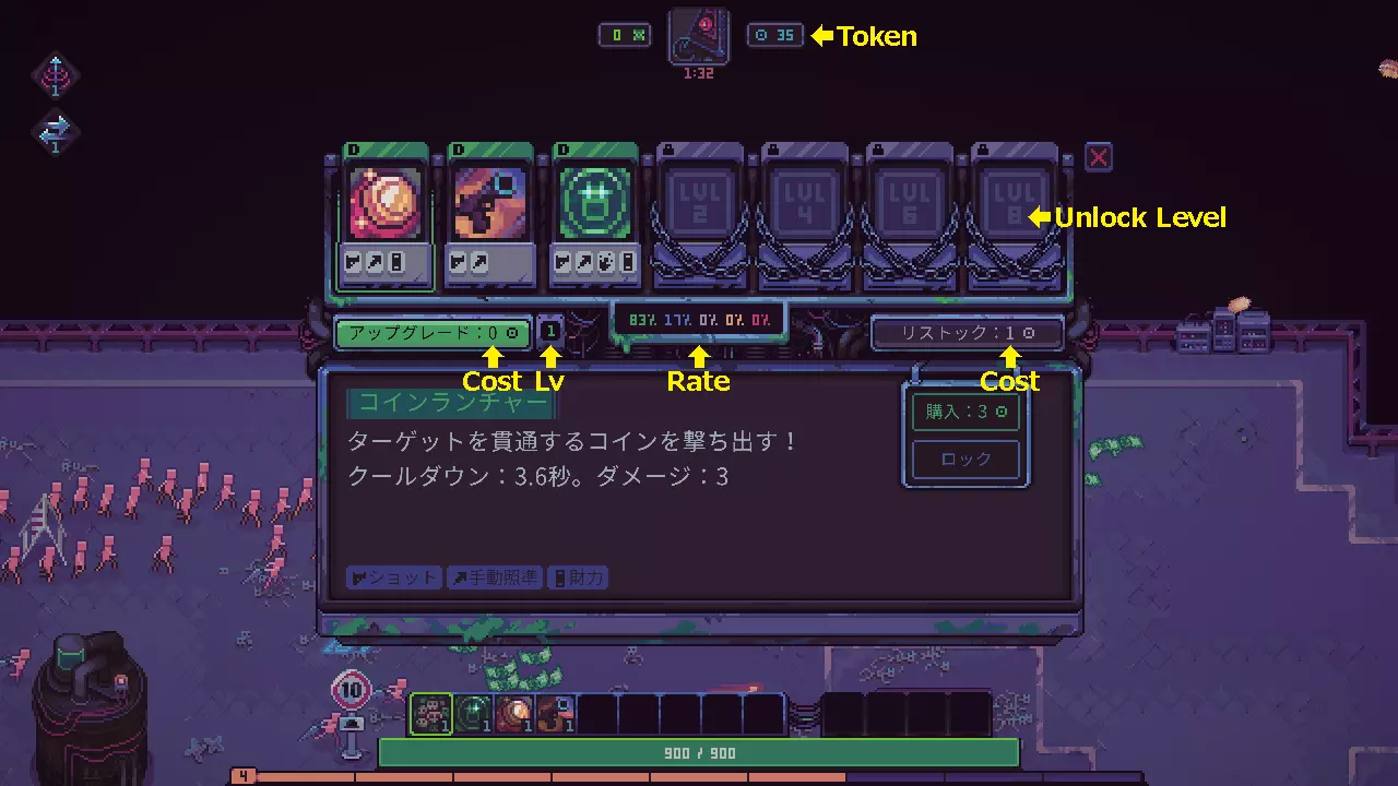 商店升级不用着急。 每次访问商店,升级成本都会降低。 商店库存较少时,更容易刷出想要的能力。 注意不要贸然升级商店,否则会导致商店库存不必要地增加。 建议将2个左右的低阶能力升到满级后再升级商店。 当商店等级达到5 - 7级并出现A和S级能力时,背包会变得紧张。 出售背包中的能力会增加商店库存,可能造成困扰。 当开始出现A和S级能力并需要出售能力时,再抓紧提升商店等级。关闭商店前应尽可能补充库存。 ★商店库存的机制 卡组中设置的普通能力会陈列在商店中。 各普通能力的库存上限为升级至最高等级所需的9个。 减少商店库存,能限定商店中陈列的普通能力。 以最少数量构建卡组中的普通能力,商店库存会更容易管理。 拥有最高等级的普通能力越多,商店库存越容易管理。 关卡攻略要点 不要在关卡内移动,在一个地方战斗。 最好持续猛烈攻击敌人。 【有毒史莱姆轨迹】其实非常强力,在一个点不停转圈是有效的方法。围绕史莱姆聚集敌人并歼灭,能轻松获得包括 bonus 在内的奖励。 想获得 bonus 和开启商店,总之就是击败敌人。 酸胶球会拖慢节奏,建议不要拾取。 普通能力要从低阶开始稳步提升(即使出现高阶也先无视)。 提升普通能力等级以触发隐藏能力并升至满级。 隐藏能力触发后,卖掉不需要的普通能力。 要好好收集 DNA。 ★不太好的行为 随意获取各种能力。 不提升能力等级。 不触发隐藏能力。 卡组参考 ★以低阶为基础构建