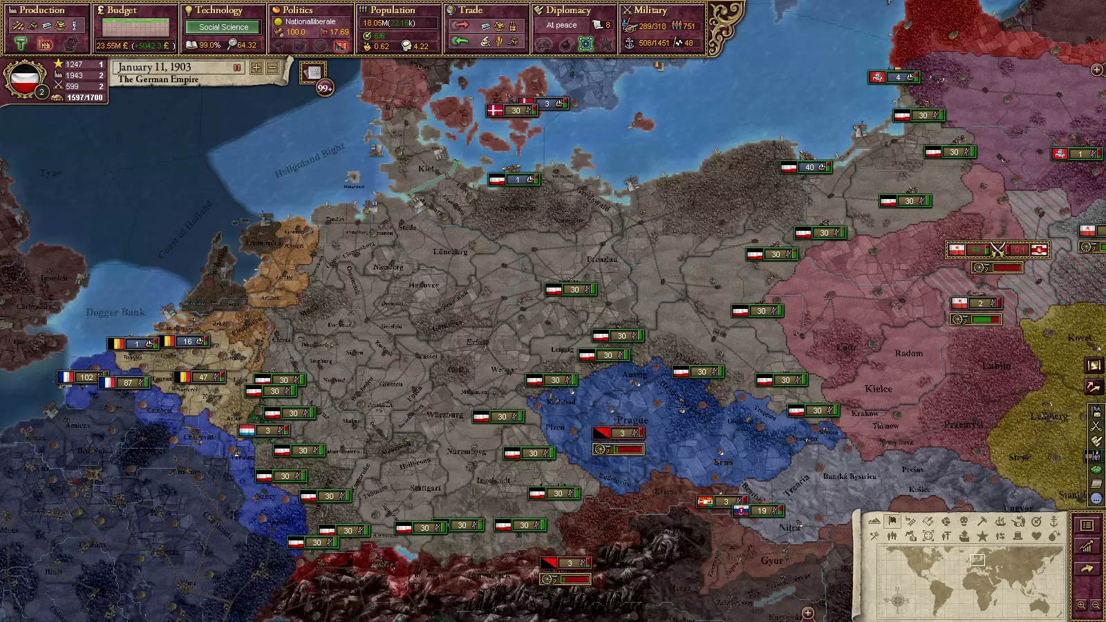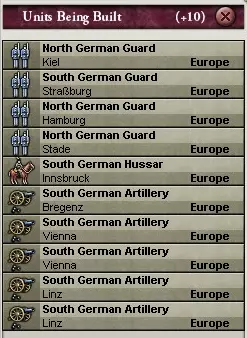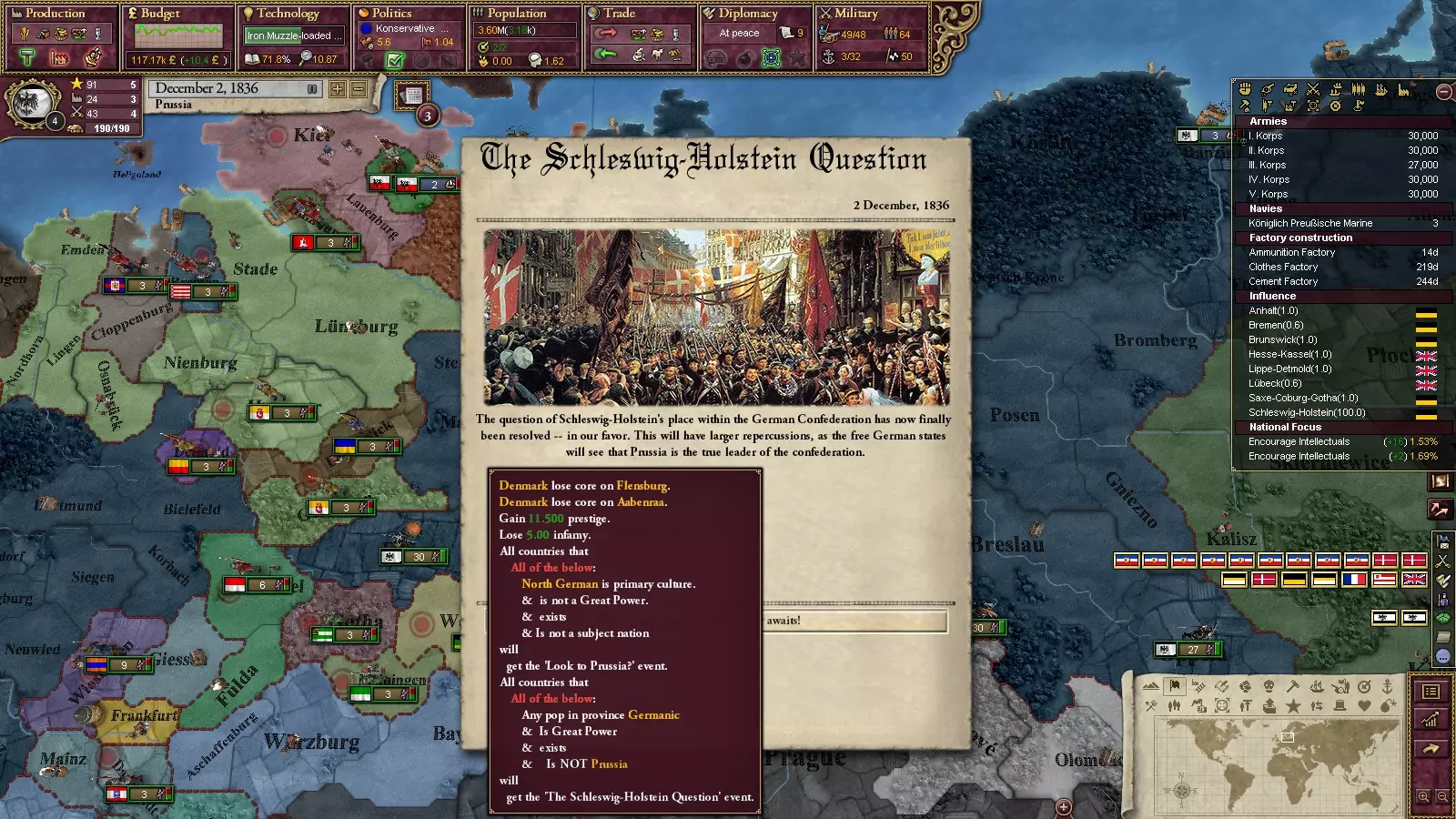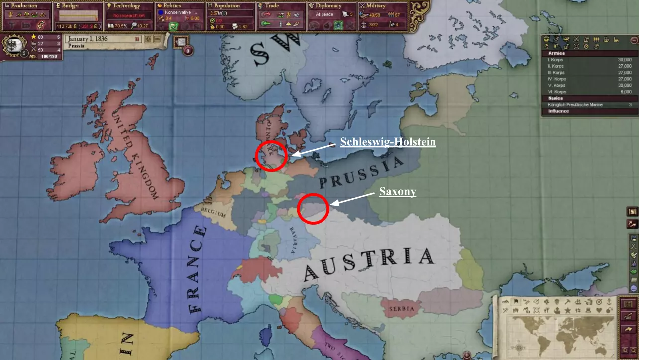 宣战后,你应当能够迅速击败丹麦并迫使他们释放其傀儡。随着石勒苏益格(Schleswig)落入我们的控制,萨克森便成为满足北德意志联邦成立条件的最后一个王国。占领石勒苏益格后不久,你会触发此事件。另外需要注意的是,在维多利亚女王加冕后,汉诺威会脱离英国的势力范围,届时你便可将其纳入版图。