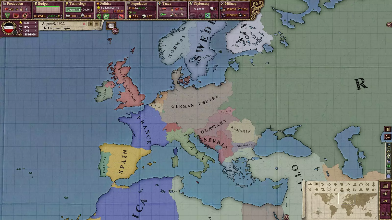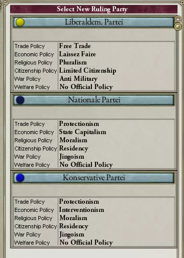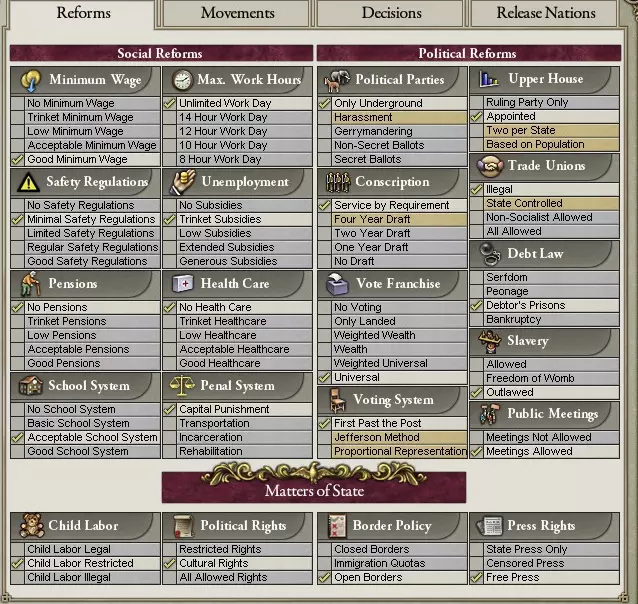 贸易政策: 决定你可以设定的最低和最高关税。高关税会增加企业获取资源的难度,而低关税则有助于企业获取资源以运营或建设工厂。 经济政策: 决定工厂成本、各社会阶层的最高税率、进口成本以及民众的经济自由度。你能否投资铁路?是否允许资本家存在?你的政党是否允许外国投资?这是目前为止最重要的政策,因为它决定了你的收入水平。目前最佳的经济政策是干预主义或自由放任,两者效果都很好,因为资本家会为你完成工作。最差的是计划经济和国家资本主义,祝你在每个地区都建造工厂愉快!资本家实际上是不被允许的。 战争政策: 战争政策很简单,包括和平主义、反军国主义、亲军国主义和沙文主义。这些政策决定了军事 funding 的水平,而军事 funding 水平又决定了你能拥有的最大军队数量。