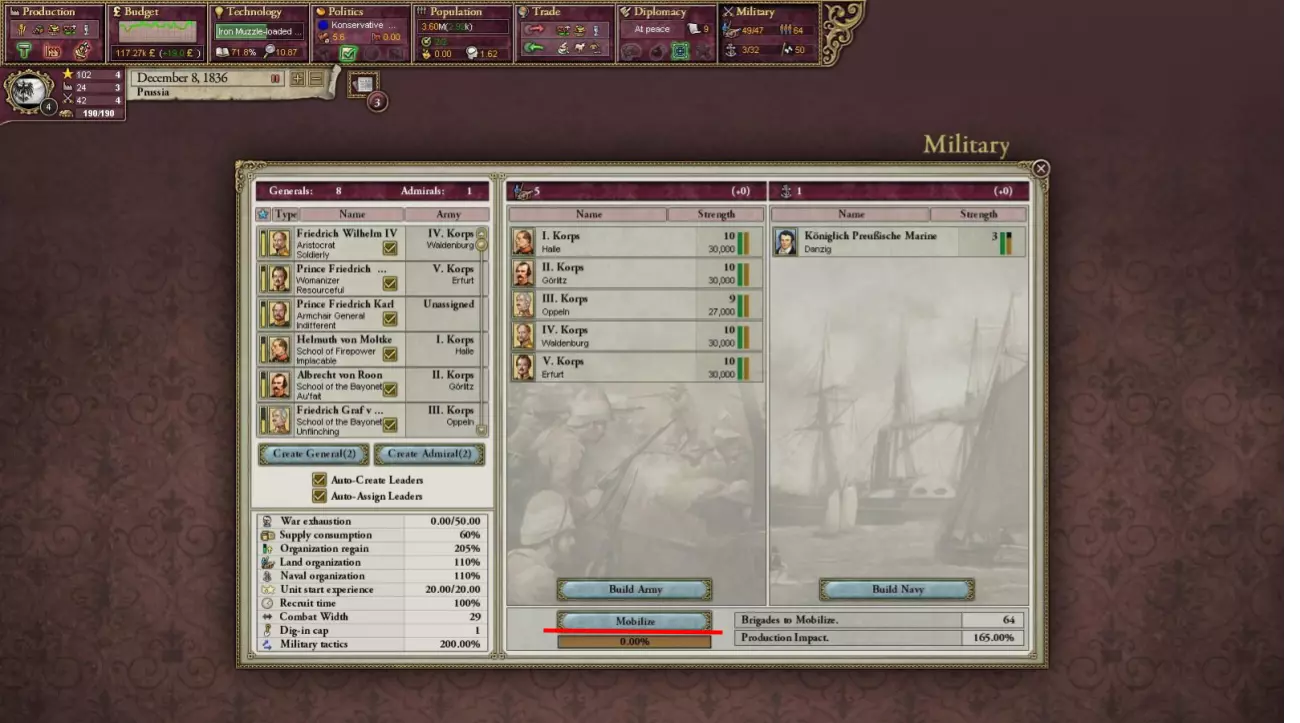 此事件的作用是让你获得对奥地利的宣战理由,以夺取其势力范围内的一个地区,在本案例中,我们将利用它从奥地利势力范围中夺取萨克森。在对奥地利开战前,有几点需要说明:首先,游戏开始时,你的军事力量与奥地利大致相当,但你与势力范围内国家的军队联合起来会让你占据优势,更不用说你初始的将领非常优秀。不要害怕与奥地利作战,击败他们的一个好方法是调动大规模集团军,这样你就不用担心输掉任何战斗,并能逐渐削弱他们的军队。另外,如果在游戏刚开始就能直接获得一个列强盟友,那会很不错。我不能保证他们会提供帮助,但盟友多总是好的。好了,回到指南。宣战前,确保你已经集结了军队,最重要的是【动员】。