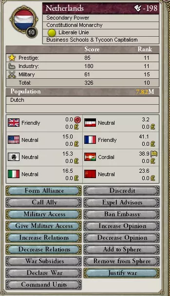 游玩前的重要细节! 游玩《维多利亚2》时,尤其是在进行多轮游戏时,要特别留意任何可能直接影响你的事件。例如,如果你选择扮演大清,就必须警惕像鸦片战争这类无法避免的事件。留意那些后续会影响你的事件非常重要,这样你才能做好相应规划。 要有一定的克制,军事统治是一个漫长但值得的过程。任何不必要的贪婪都可能导致最终的失败。务必注意你想要宣战对象的同盟关系,同时也要关注你的恶名值——每次你对他国进行战争理由宣战时都会积累这个数值。获得的恶名值取决于宣战理由和随机数生成,但如果你一旦超过25点恶名值,世界上许多列强将会迅速宣战以遏制你的侵略行为,所以要克制住征服所有邻国的强烈欲望。 不必过于担心政治方面的问题,你之后会发现它并没有看起来那么复杂。 最重要的是,享受游戏的乐趣!这款游戏中会发生很多疯狂的事情,尽情沉浸其中吧,比如像这样的情况。