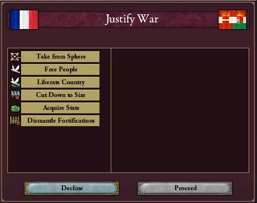 现在你已经对自己的国家有了一定了解,是时候发动战争了!这绝对是游戏中最精彩的部分。那么如何宣战呢?如果你玩过Paradox的游戏,应该知道操作方法;但如果你是新手,其实也很简单。你只需右键点击你想要宣战的国家,选择【正当化战争】,然后就会看到多个选项。这些选项会根据你所针对的国家、拥有的科技以及拥有的核心领土而有所不同。每次正当化战争时,你只能选择一个带有代价的要求,也就是可能会获得恶名值。通常会显示正当化该战争目标可能获得的最大恶名值。注意,我说的是“最大”——有时候你获得的恶名值会低于最大值,有时候差不多,如果你运气特别好的话,甚至可能一点都不会获得。不过我不建议通过频繁存档来刷无恶名,而是应该期望获得最大恶名值。你不会想超过25点恶名,因为你已经知道超过后的后果。当你的宣战理由准备完成后,直接宣战并将部队移动到相邻的敌方地块。在敌方领土时,你会看到一个占领进度条,当它达到100%时,该省份将归你控制,然后你可以继续进攻下一个地块。遇到敌方单位时,只需遵循本指南前面提到的部队编制,与他们的任何战斗都应该是小菜一碟。如果战斗开始变得不利,你总是可以投入更多部队,毕竟人多力量大。只要你持续向战场投入部队,最终可能会取得胜利。宣战理由: 选择特定宣战理由时,情况会有所不同。大多数宣战理由基本没什么用处,比如【偿还债务】或【拆除防御工事】。如果你想大幅扩张领土,首先要使用【获取省份】宣战理由,最好针对你最想要的地区进行正当化,然后在战争期间通过外交界面添加更多【获取省份】的战争目标。需要注意的是,如果你在正当化战争时足够幸运没有获得恶名,最多可以添加三个【获取省份】战争目标而不达到最大恶名值。这就是为什么我建议你在拥有庞大且强大的军队时进行大部分省份获取,这样即使触怒了其他列强,你也不会被他们击败。另外两个最重要的宣战理由可能是【纳入势力范围】和游戏后期的【输出意识形态】(仅适用于拥有极端主义意识形态的国家,即共产主义、法西斯主义)。我认为共和国也可以输出民主制度。选择【纳入势力范围】这一宣战理由可以绕过外交壁垒,在AI在影响力方面表现得很棘手时非常有用。