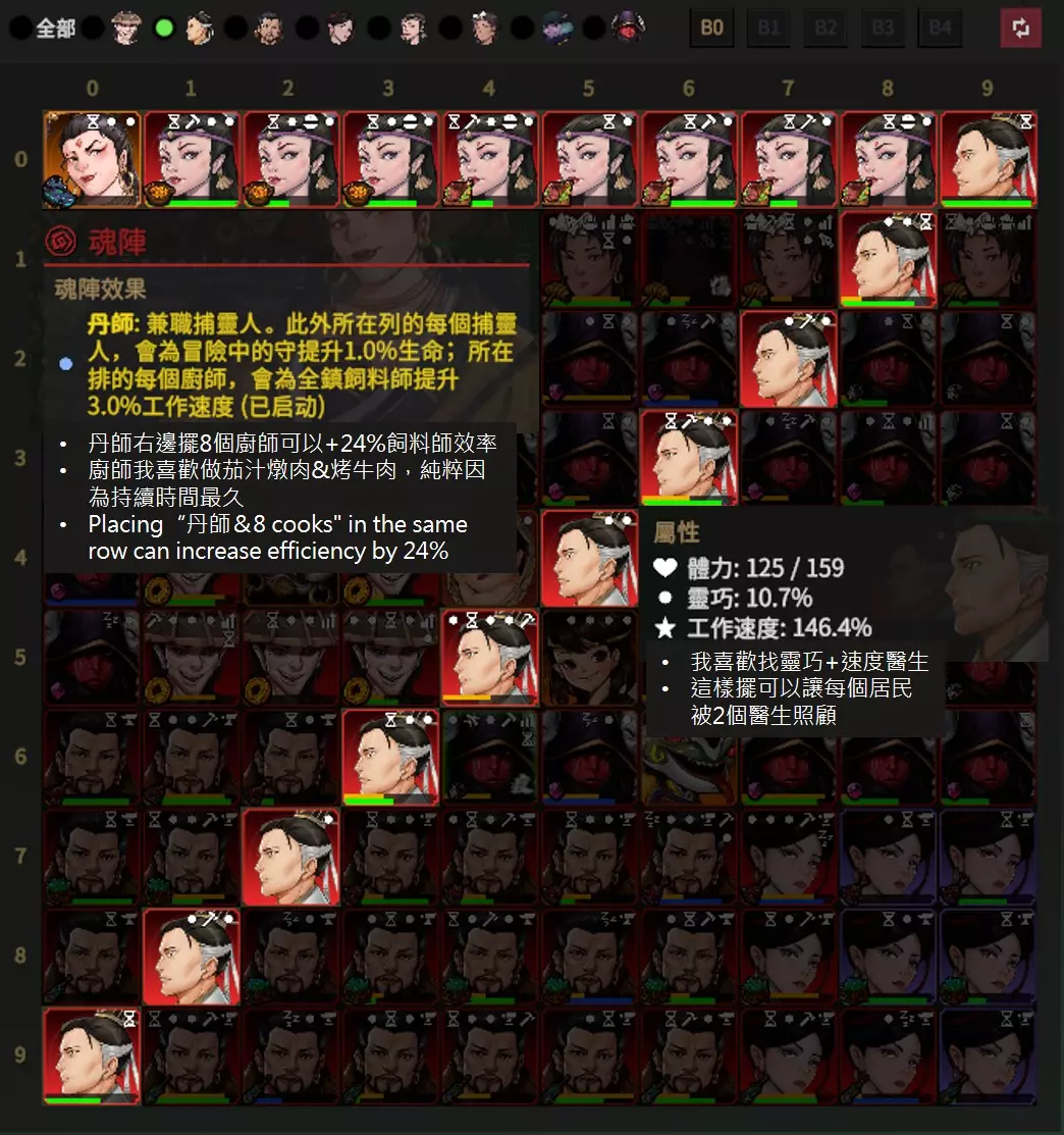 丹师右边摆放8个厨师可以提升24%的饲料师效率。 我喜欢让厨师制作茄汁炖肉和烤牛肉,纯粹是因为这两种食物的持续时间最长。 我倾向于选择灵巧和速度属性较高的医生。 按照我的方式摆放医生,每个居民可以被2个医生照顾,但实际上医生经常处于发呆状态。 隐藏宠物