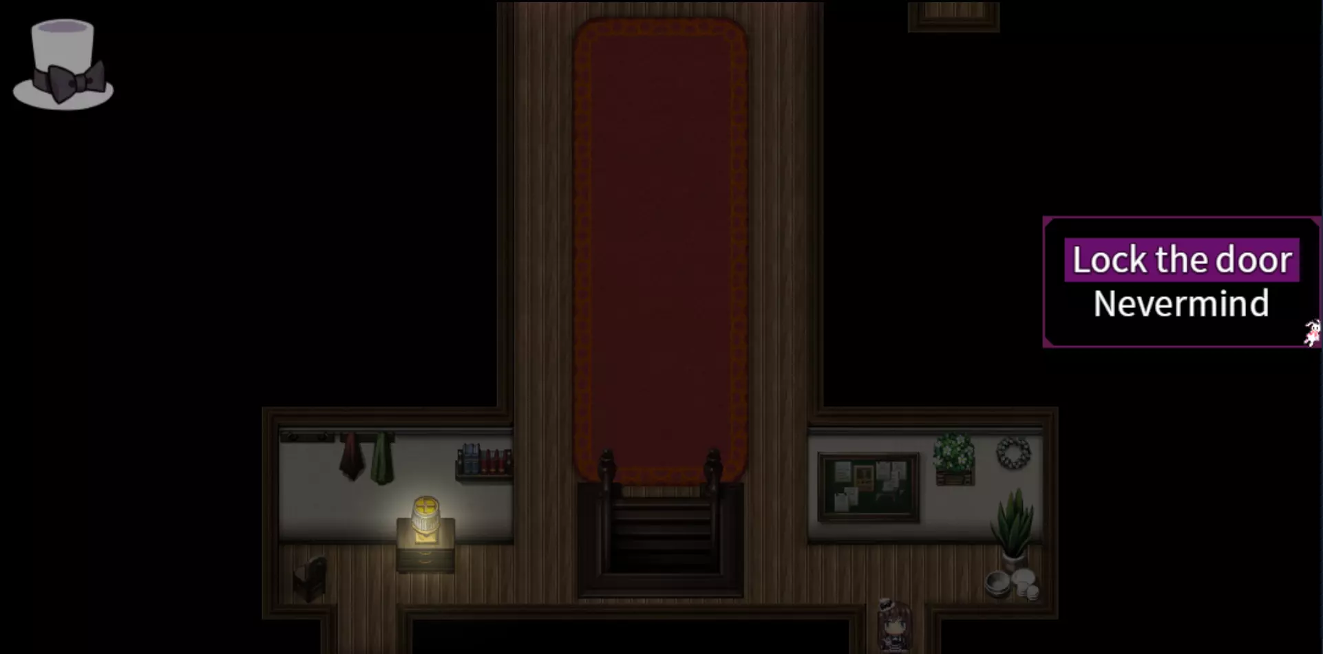生命的意义 | 攻略 ❥ 读取(存档 #2) ❥ 确保你操控的是尤里,向左前往有柱子的走廊。 ❥ 向下走到右下角的卧室,靠近门(不要进入卧室) ❥ 打开物品栏,使用【小钥匙】锁门 ❥ 切换到另外两个位面,使用【小钥匙】锁门 确保在所有三个位面中,卧室门都已锁好!否则将无法解锁Extra End成就!