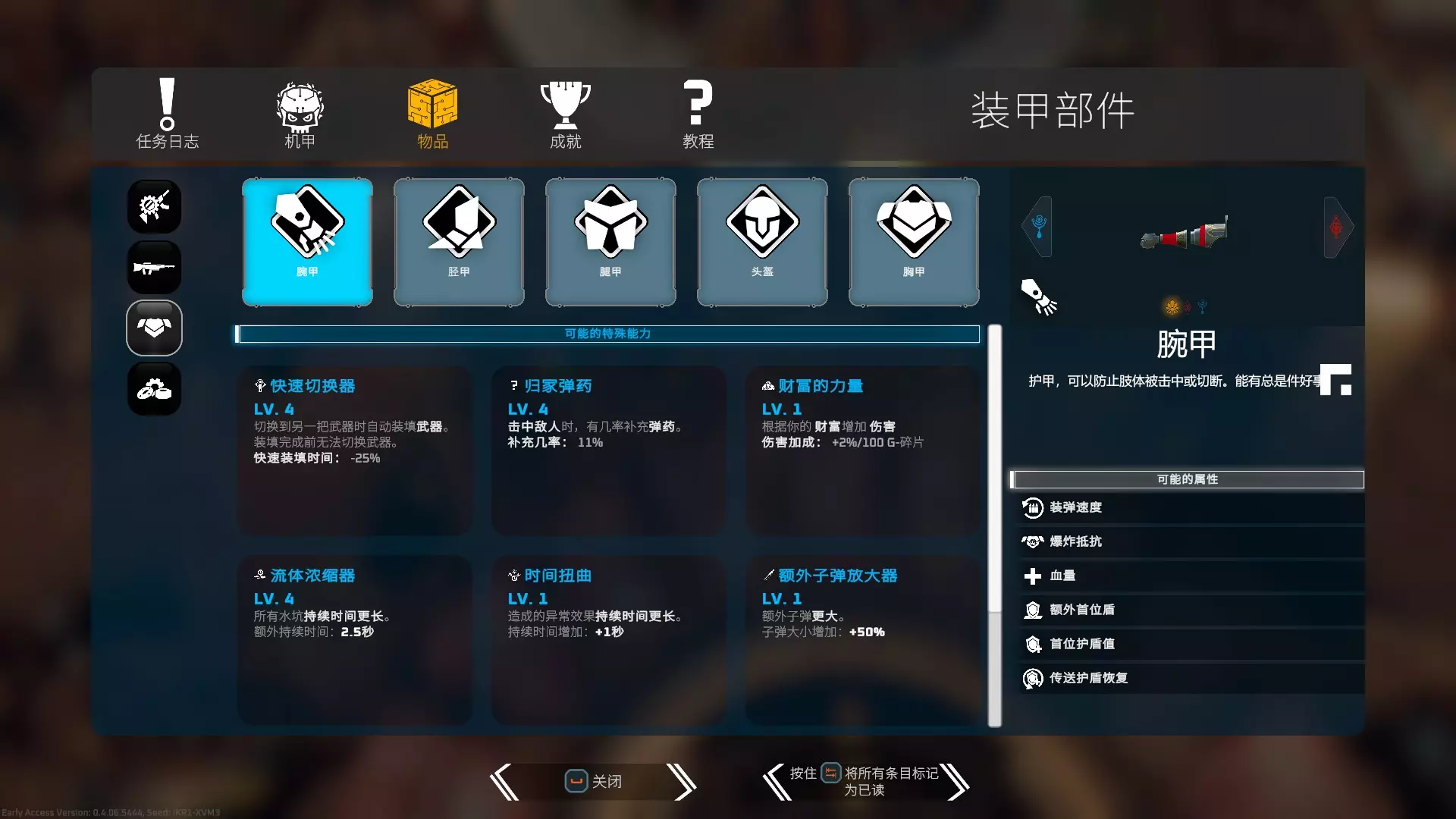基于这点,在护甲属性上的选择应该优先选择【传送护盾恢复】和【额外末位盾】。 【传送护盾恢复】在护甲中高于一切词条,它可以让你在使用轮盘进入下一层时多回复一层护甲,这意味着你有更多的容错空间。比如原本10点护盾进入下一层后会回到10点,而加了【传送护盾恢复】后就能恢复到10+10点。 【额外末位盾】往往会直接在末位护盾层的数值上叠高,假设末位护盾叠到30点,那么你在每个房间就有承受29点伤害的容错空间。 【额外首位盾】却往往会直接给你增加一个额外的护盾层数,而不是在你原有首层盾的数值上相加。比如你原本是10-10-10的护盾,选择额外一层护盾+5后,就会变成5-10-10-10。当消耗完所有护盾后,使用轮盘时就只会回复这5点的首层护盾,这样非常吃亏。 基于这些护甲属性的优先度:传送护盾恢复>末位盾>随机盾>首位盾>血量。 其他属性可根据自己的BD选择。 武器的选择:游戏内目前共有11种武器。