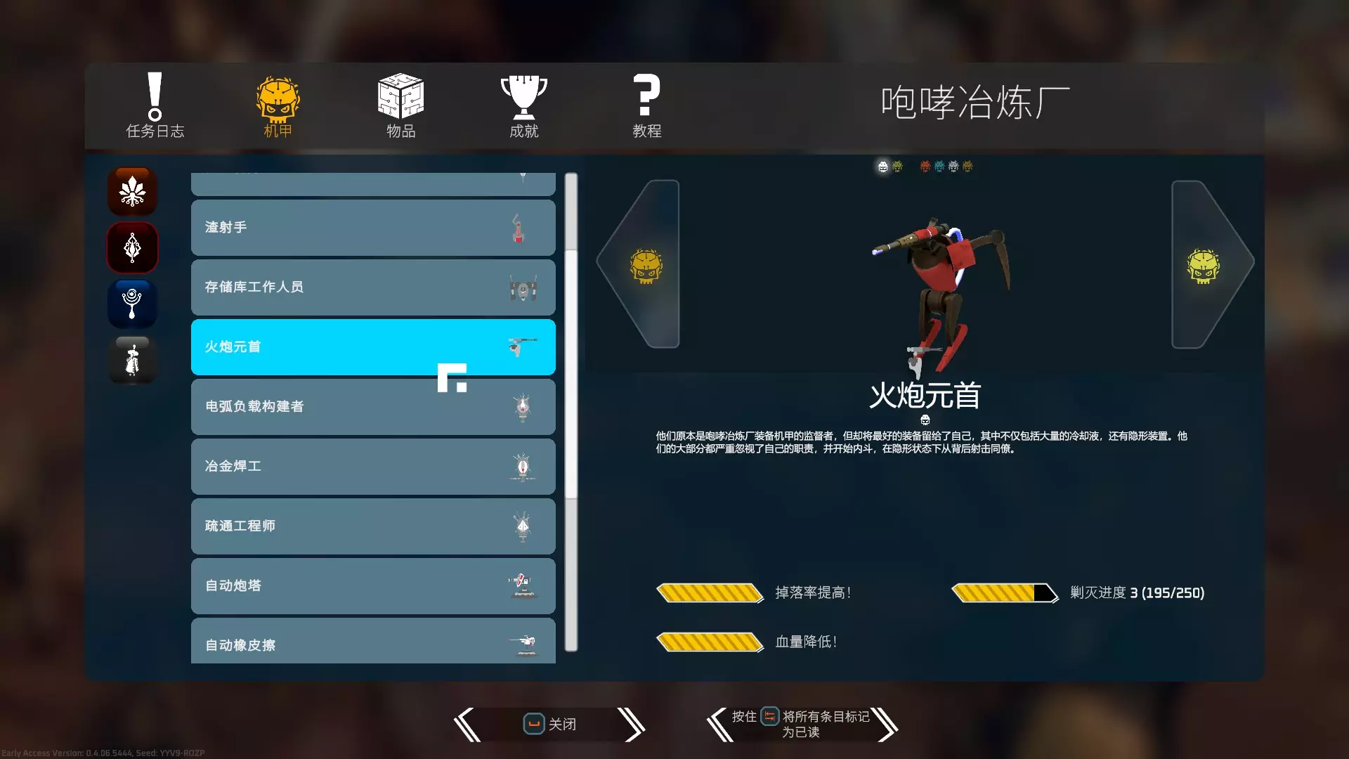 分别为双发燧发枪(双管猎枪)、愤怒中继器(冲锋枪)、电弧爆破枪(散弹枪)、碳纤维爆弹枪(十字弩)、合金溶蚀者(狙击枪)、离子驱动步枪(三连发步枪)、无人机(从自身向四周扩散子弹)、膨胀步枪(射速偏慢的步枪)、火焰炮、快速群发发射器(加特林)、自适应光子步枪(滋崩)。由于我目前主要使用角色为愤怒人,为了更好地适配愤怒人的技能,我倾向于选择离子驱动步枪>膨胀步枪>电弧爆破枪。离子驱动步枪高射速、伤害适中,弹速快,可以快速清理单体敌人,弹匣容量大。膨胀步枪可以装载更多的插件,后期射速也还可以,缺点是弹速偏慢、弹匣容量小。电弧爆破枪表现中规中矩,贴脸时伤害较高,但自身容易受伤。 这三把枪在各种地形下都比较适用。 愤怒人的冲锋枪默认等级偏低,同等级情况下伤害也比不上离子驱动步枪。 其他武器中,自适应光子步枪和快速群发发射器前摇较长,装填时间也太久,不适合在狭小狭长的房间内战斗。 无人机攻击过于分散,无法快速清理单个敌人。 双发燧发枪使用较少,暂不做评价。 十字弩(效果抽象) 狙击枪(表现还行) 选择步枪和散弹枪能较全面地适配插件,额外子弹、元素、爆炸、暴击等插件效果都不错。 狙击枪弹匣容量小,选择额外子弹和暴击类插件的收益较低。插件的选择(个人经验) 这部分应该各人有各人的玩法。 我倾向于所有的插件都为提高输出而服务,那些迷惑、减伤、破坏子弹等插件实际使用效果属实差强人意。 我比较喜欢走暴击路线,因为暴击类插件出现的频率较高。在暴击的基础上可以选择暴击飞刀或者暴击起爆这些插件来增加自己的范围伤害。 插件没什么好说的,根据使用的武器和人物技能来专精一个方向即可。 元素方向选择一两个让子弹附带元素伤害就可以了,目前想走元素流的插件分配有些散,不那么容易成型。 考虑到护甲提供的一些属性,目前全局的元素优先度为水伤>电伤>火伤。 爆炸类插件其实效果也不错,但产生的特效容易杂乱混淆。敌人和BOSS的应对方法 三个地图各自都有一些棘手的敌人 接下来讲讲一些敌人的应对方法 咆哮冶炼厂——隐形狗
