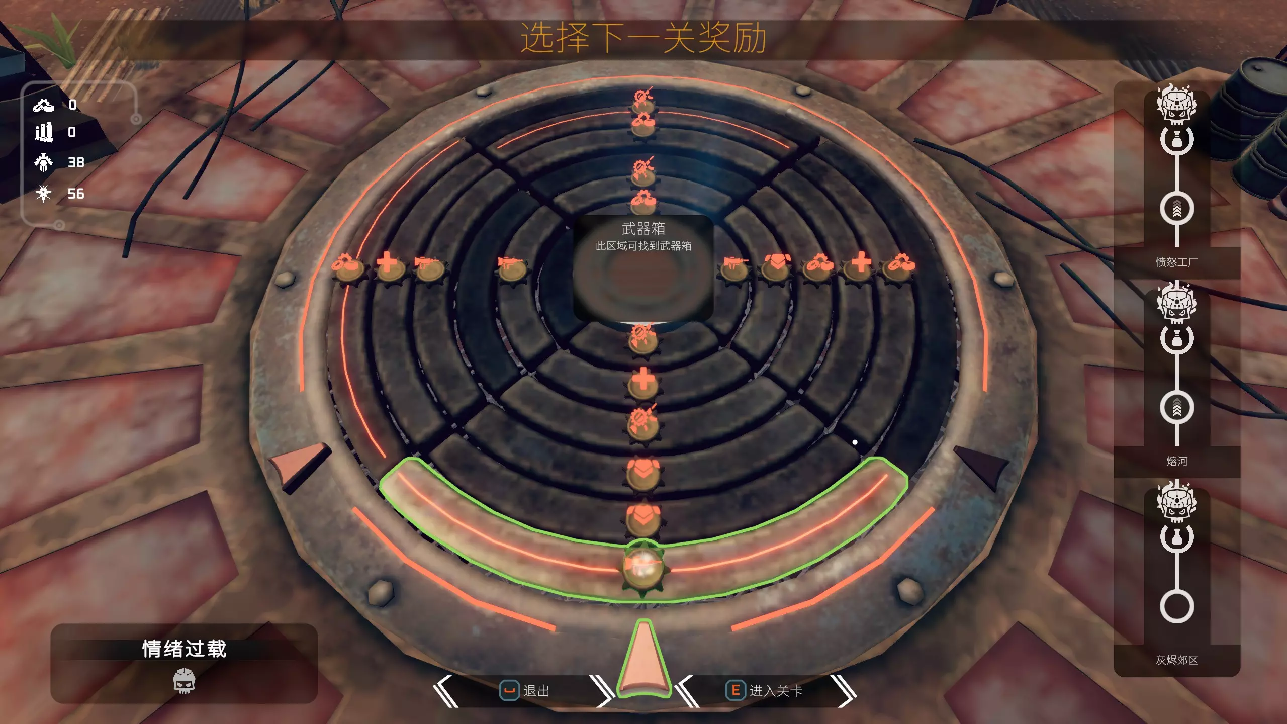 天骄帝国整体小兵数量多,BOSS难度偏简单;冶炼咆哮厂小兵数量少,BOSS难度高;寂静废墟小兵数量多,BOSS难度也高。 当玩家解锁冶炼咆哮厂后,可以将其作为出发地图。为什么不选择天骄帝国作为出发地图呢?个人认为帝国—熔炉—废墟这条路线,由于熔炉中间的两个BOSS难度较高,若无法秒杀,容易损失大量护甲和血量。为了保证生存,可能会减少每层的增益选择,这样在最后进入废墟时会相对吃力。 选择熔炉—帝国—废墟这条路线虽然前期难度较高,但只要选择恰当的武器通过后,后续两张地图基本不存在生存压力。 轮盘的选择(通用):每张地图都会以六层递进的方式呈现。