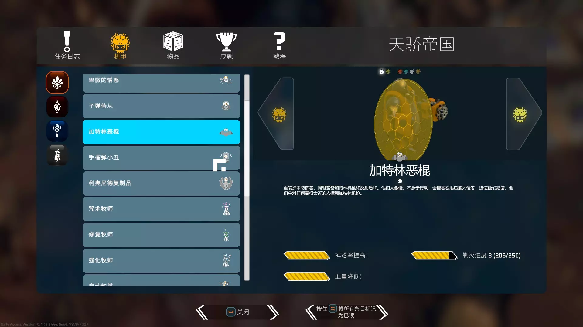 初始首层可以向左、中、右三个方向选择,选择后轮盘会将所选的该层置中,后续在该层继续向左、中、右三个方向选择。因此可以提前规划轮盘的增益选择,避免增益浪费,提高增益性价比。 目前每层可选的增益分别为: [1]回血——生成一个一次性补满血量的治疗舱 [2]插件——生成一个插件宝箱房间 [3]武器——生成一个武器宝箱房间 [4]护甲——生成一个护甲宝箱房间 [5]碎片——生成一个碎片宝箱房间 前期不建议选择层级插件增益,前期宝箱的插件等级太低,提供的强化效果实在有限。我个人倾向于选择武器+碎片的方式出发,首层获得2-3级的武器可以作为主武器一直使用,也可以回收变成碎片方便后续默认武器的升级。2层的碎片加上boss掉落的碎片,能让我在第三层的增幅器上将武器提升2-3级,这会极大提高前期的输出能力。 这样一来,3-6层基本就可以围绕2碎片+1护甲的搭配前进了。 后续其他地图的层级选择就可以随意一些了。个人层级增益优先级:碎片>护甲>武器(回收换碎片)>插件>回血 回血可以在遇到BOSS层时选择,因为BOSS层会出现商店,商店内可能会出现血量护甲置换器,因此可以赌一波回血和置换器的搭配,这样在完成所有房间后,进入BOSS房间前,就可以将所有的血量置换成护甲,再回到治疗舱将血量补满! 在面对比较棘手的BOSS层时往往有奇效。 地图探索及战斗的逻辑 地图探索我倾向以小房间——策略生成器——大房间的顺序进行探索 正方形的小房间一般是宝箱或者商店 以小房间优先可以更早装备上强化的物件去提高清怪的效率 发现商店也可以提前对整层地图探索进行规划。商店中有时会出现【护甲血量置换器】,如果提前发现,就能利用它来回复护甲和血量。 假设原本护盾值为20 - 20,发现商店时护盾值是15 - 0,此时可以用血量置换为20 - 5,这样剩余的15点护盾就能通过击败房间敌人来回复。 同样,在击败BOSS进入下一层前,如果末位盾还有剩余,就可以返回商店将末位盾置换成血量,再利用轮盘回复末位盾。 搭配【传送护盾恢复】的词条效果会更好,这样可以置换出更多的血量,让轮盘回复两个末位盾。 清怪方面,我的习惯是先打喽啰再打精英。游戏内机制设定,大部分敌人在被击败后,会立即清除其产生的弹幕。游戏中喽啰的移动意向更强,更容易近身产生威胁,其弹幕速度快、覆盖密集且呈细长状,躲避容错率较低,需要优先清理以腾出自身走位空间。 精英怪的移动意向较弱,产生的弹幕虽体积较大,但基本存在可躲避的缝隙,且可利用掩体进行躲避,因此优先处理度靠后。 护甲的选择(通用——生存的核心) 游戏中护甲的优先级远高于血量。 假设当前三层护盾值为7-7-7,游戏机制设定:在击败每个房间的所有敌人后,若某一层护甲仍有剩余护甲量,则该层护甲值会回满。护甲层消耗完则会直接损失生命值。例如,若护甲值为7-7-1,消耗后可恢复至7-7-7;若护甲值为7-6-0,消耗后则只能恢复至7-7。使用轮盘进入下一层时会回复一层护盾。一旦护甲消耗殆尽,损失的血量就只能通过治疗舱或商店中的治疗胶囊来恢复。这一机制意味着游戏中【末位盾】才是你生存的第一保障。