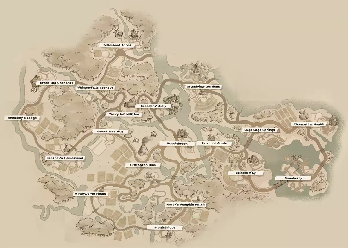 作者正在制作《Cozy Caravan》0.3.4版本的全地图,当前为空白状态,后续会标记出植物生长位置与角色地点,图中已标注出Fellowood Acres、Toffee Top Orchards等区域。