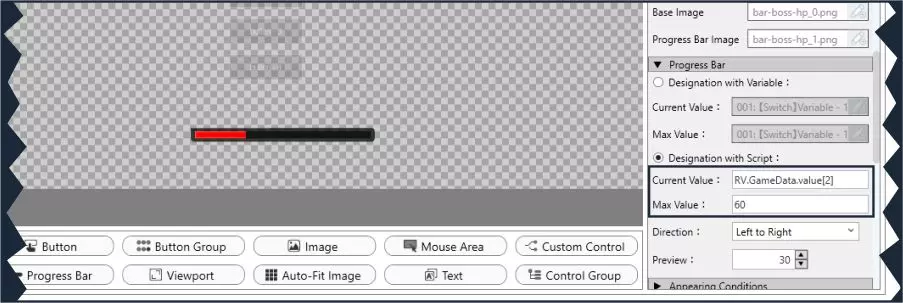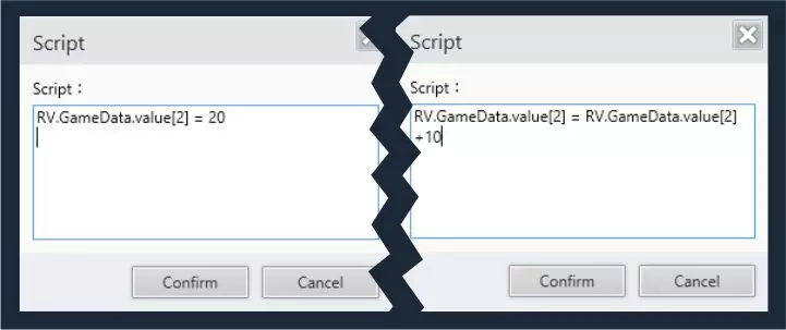 (重要的是要将新值放在引号之间) 这种基本用法当然可以通过【变量控制】轻松实现。 当需要更高级的用法时,使用脚本会更有用,例如为变量分配其他非常规值,如鼠标的“x”和“y”坐标,或在单行代码中进行更复杂的算术运算(例如RV.GameData.value[2]=RV.GameData.value[2]*5/2+25)。此外,还可用于JavaScript中更高级的脚本或代码。参考指南:脚本与代码小汇编 在UI编辑器中使用元素时,利用脚本来处理变量也十分有用。例如进度条,若其最大值固定,默认情况下需要两个变量来赋值,一个用于当前值,另一个用于最大值。而通过脚本指定的话,只需一个当前值变量并可对其进行修改,最大值则可直接赋予任意数值。