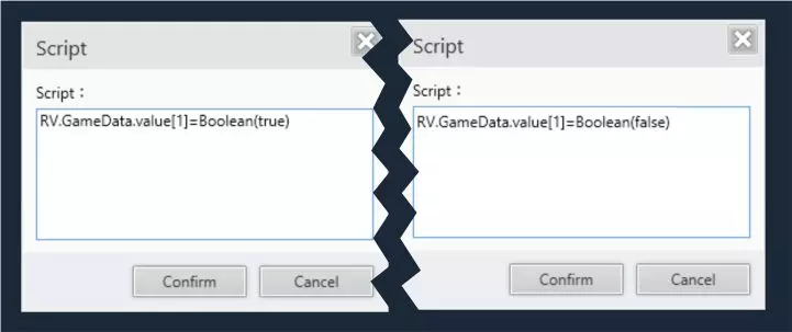 我们可以通过以下方式使用脚本: 在“编辑”→“内容”→“逻辑”→“脚本”中,针对每一集的内容使用脚本。 或者在UI编辑器中,通过元素(如按钮)的触发器,在“内容”→“双击添加”→“其他”→“脚本”中使用脚本。 使用脚本更改变量值 我们的变量默认分配了以下值: 001:【开关】开关 = 关闭 002:【数字】数字 = 10 003:【字符串】字符串 = 约翰 基本用法 开关变量: 要将其值更改为“开启”,我们编写: RV.GameData.value[1]=Boolean(true) 要更改为“关闭”,则编写: RV.GameData.value[1]=Boolean(false)