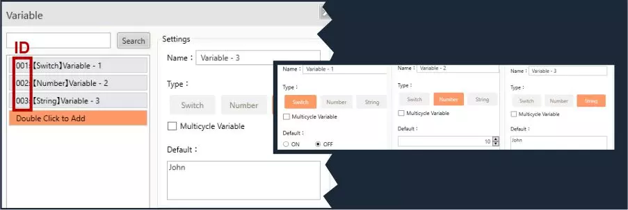 这是一份面向非程序员的iFVN脚本变量基础使用参考。在某些情况下,它有助于节省或减少游戏中使用的变量数量,实现更高效或更高级的变量运用。 变量简介 在iFVN中,我们可使用3种类型的变量: 开关 数字 字符串 我们主要用它们来存储游戏过程中的信息或玩家做出的选择。此外,由于变量可以被修改,并且能与条件和触发器进行比较以实现多种目的,因此它们非常实用。 开关变量是一种二进制变量,它能提供两种可能的结果:“真”或“假”。在iFVN中,对应的状态为【开启】或【关闭】。数字变量是最实用的变量之一,正如其名,它可以存储任何数值;之后可以通过加法、减法、除法对其进行修改;或者在需要时通过条件进行比较。 最后是字符串变量,它可以存储任何文本,无论是单个字符、词语、名称、语句,甚至是数字(但此时数字是以文本形式存在,而非数值)。 当我们在字符串变量中使用数字时,它与数字变量并不相同,因为该值无法通过条件中的“控制变量”进行加减或除法等修改。并且它们只能与另一个字符串变量或字符串值进行比较。通过脚本使用变量 首先,我们需要已有或创建任意类型(开关、数字或字符串)的变量,并知晓其用于识别的唯一ID(例如:001:、005:、012:)。 但我们只需ID中不带前导零的最后几位数字(例如:1、2、15、22等)。 我们的变量可能如下所示: 001:【开关】switch 002:【数字】number 003:【字符串】string