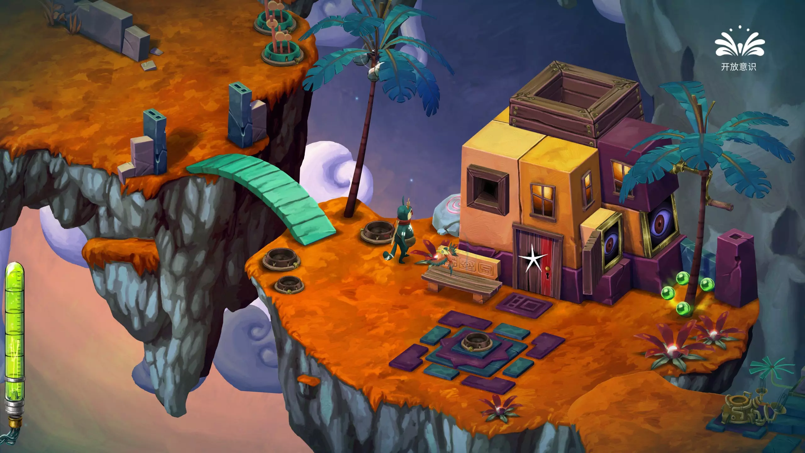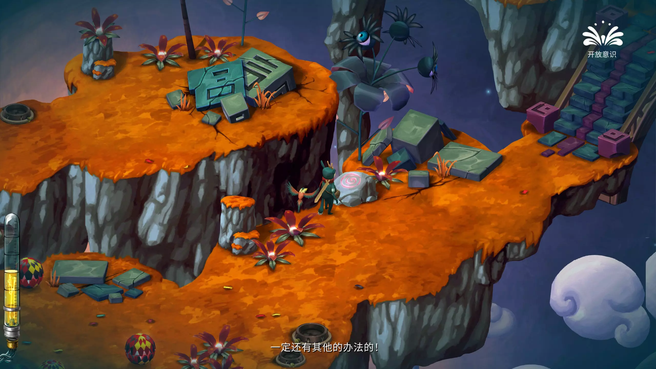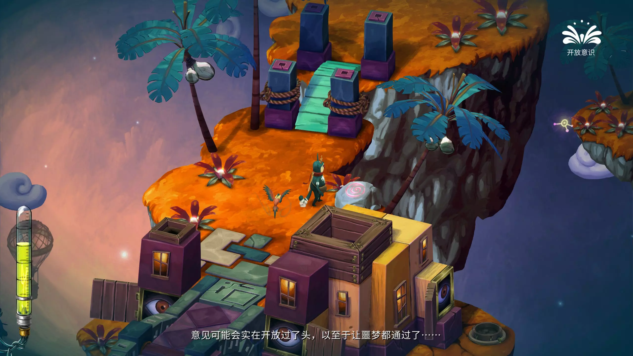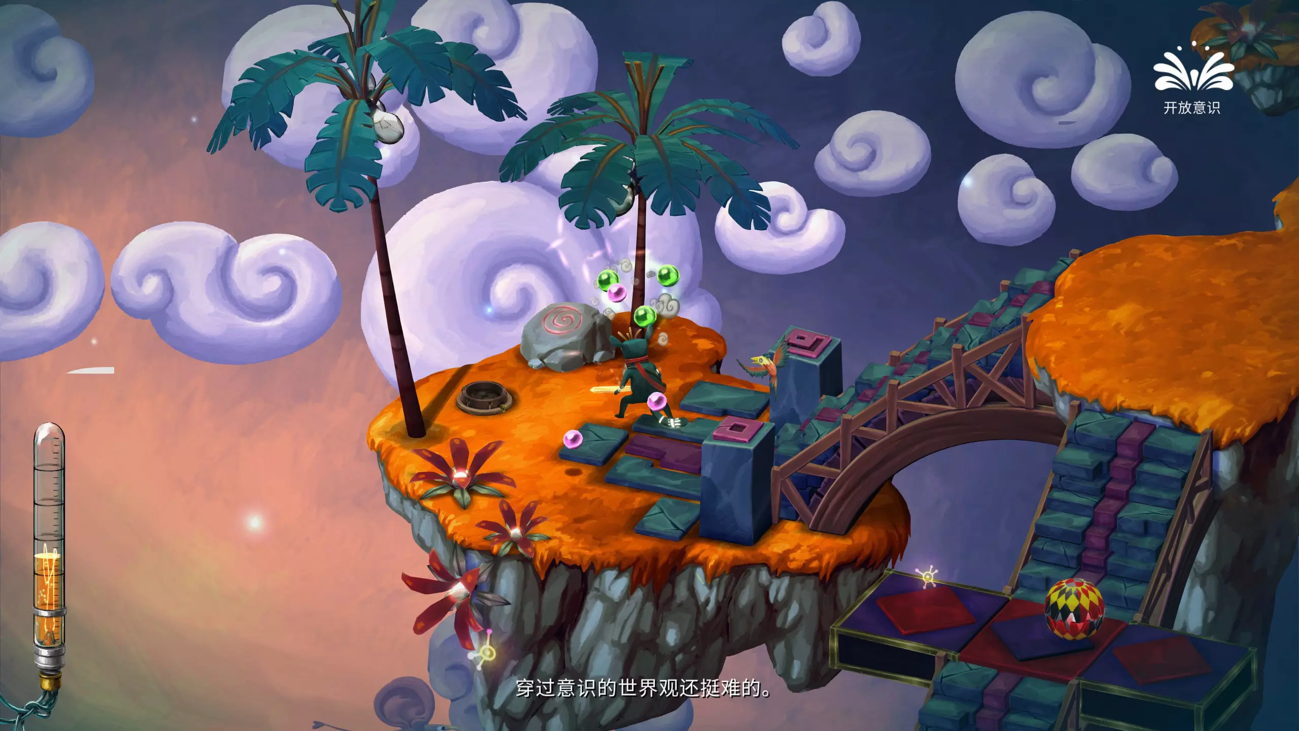 哎哟,疼!被一个椰子球击中头部 遇到意识转换器的时候,切换成开放意识,攻击椰子树,使椰子掉落砸到主角脑袋即可。