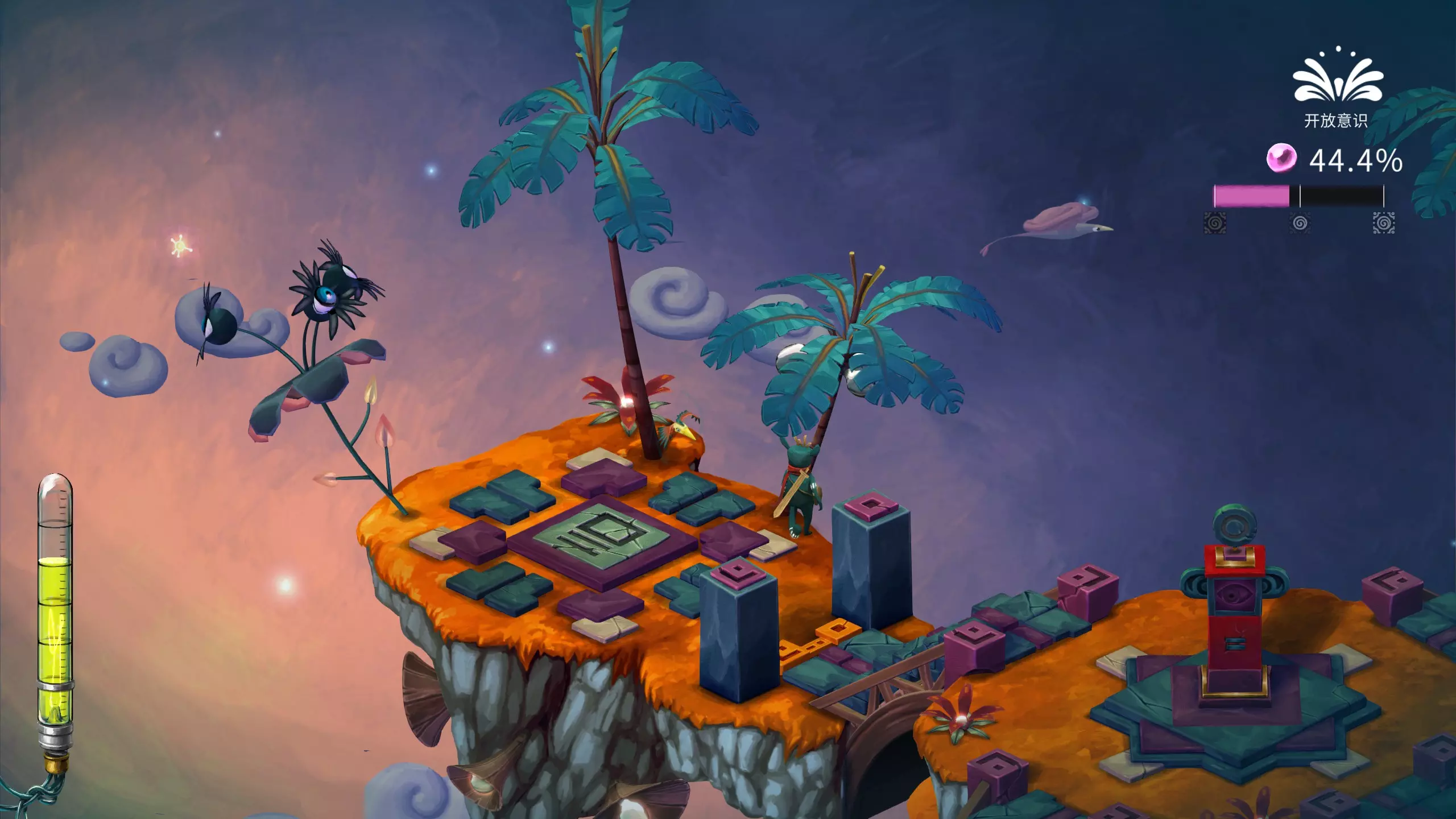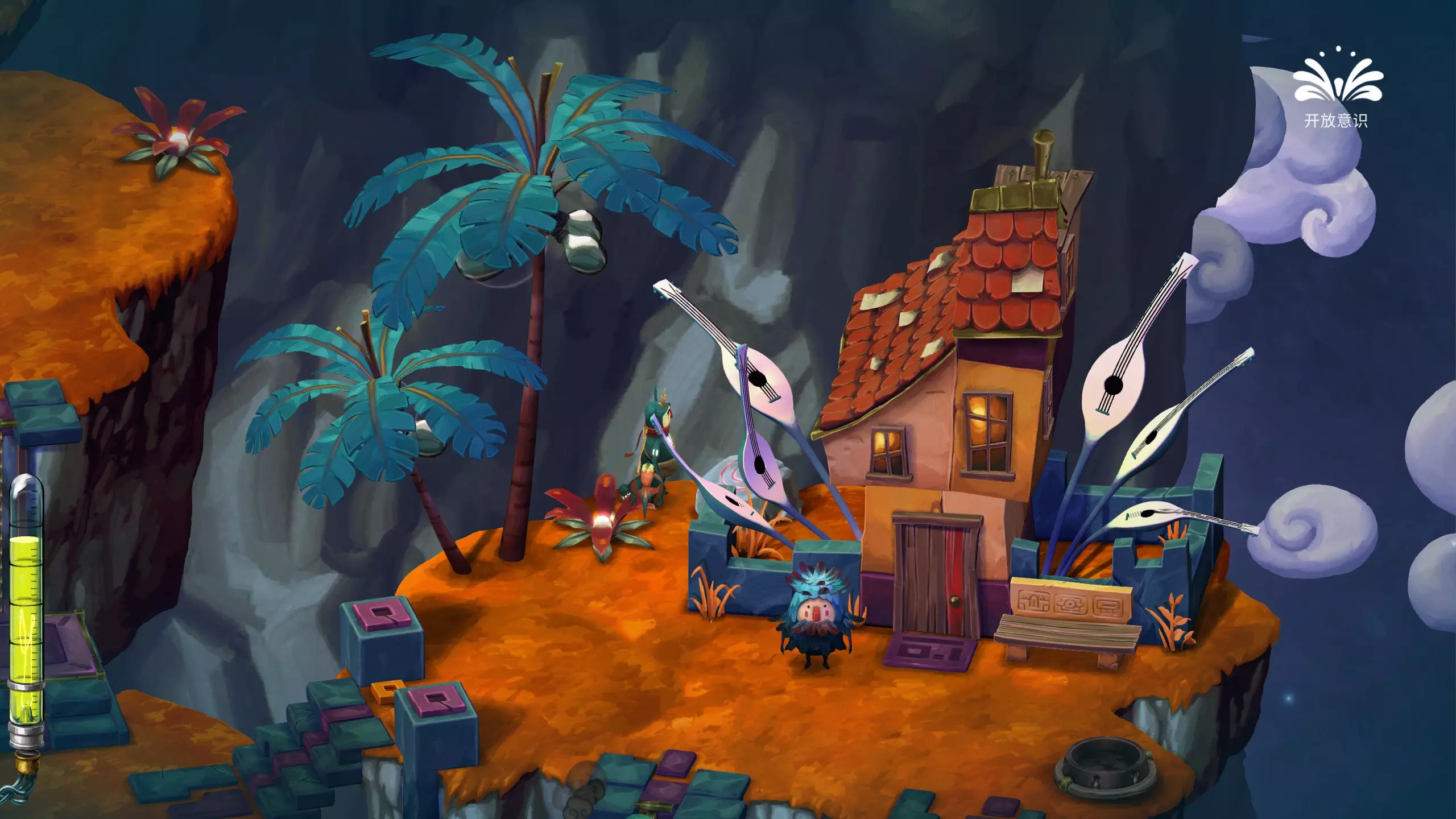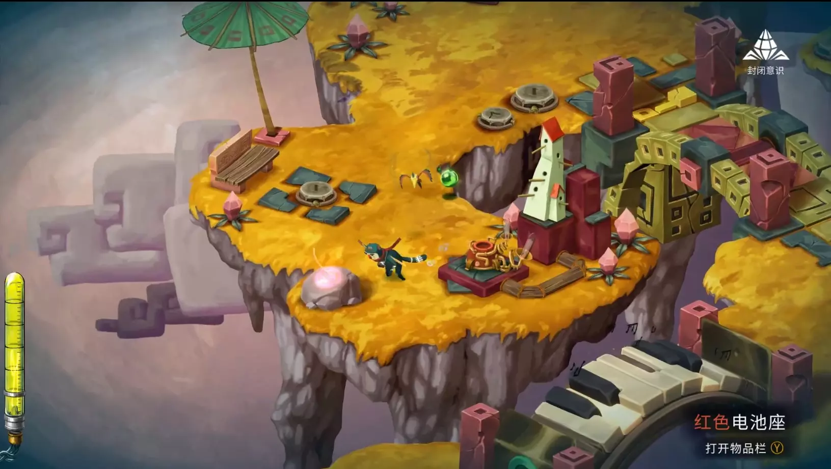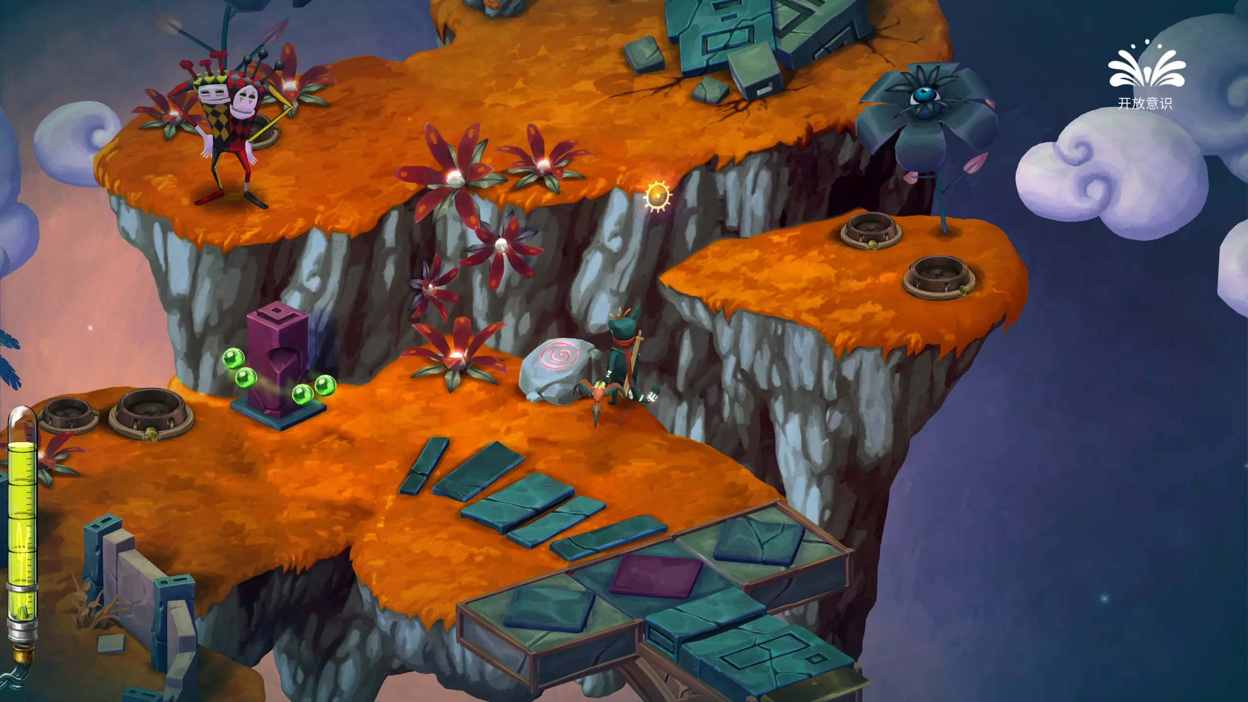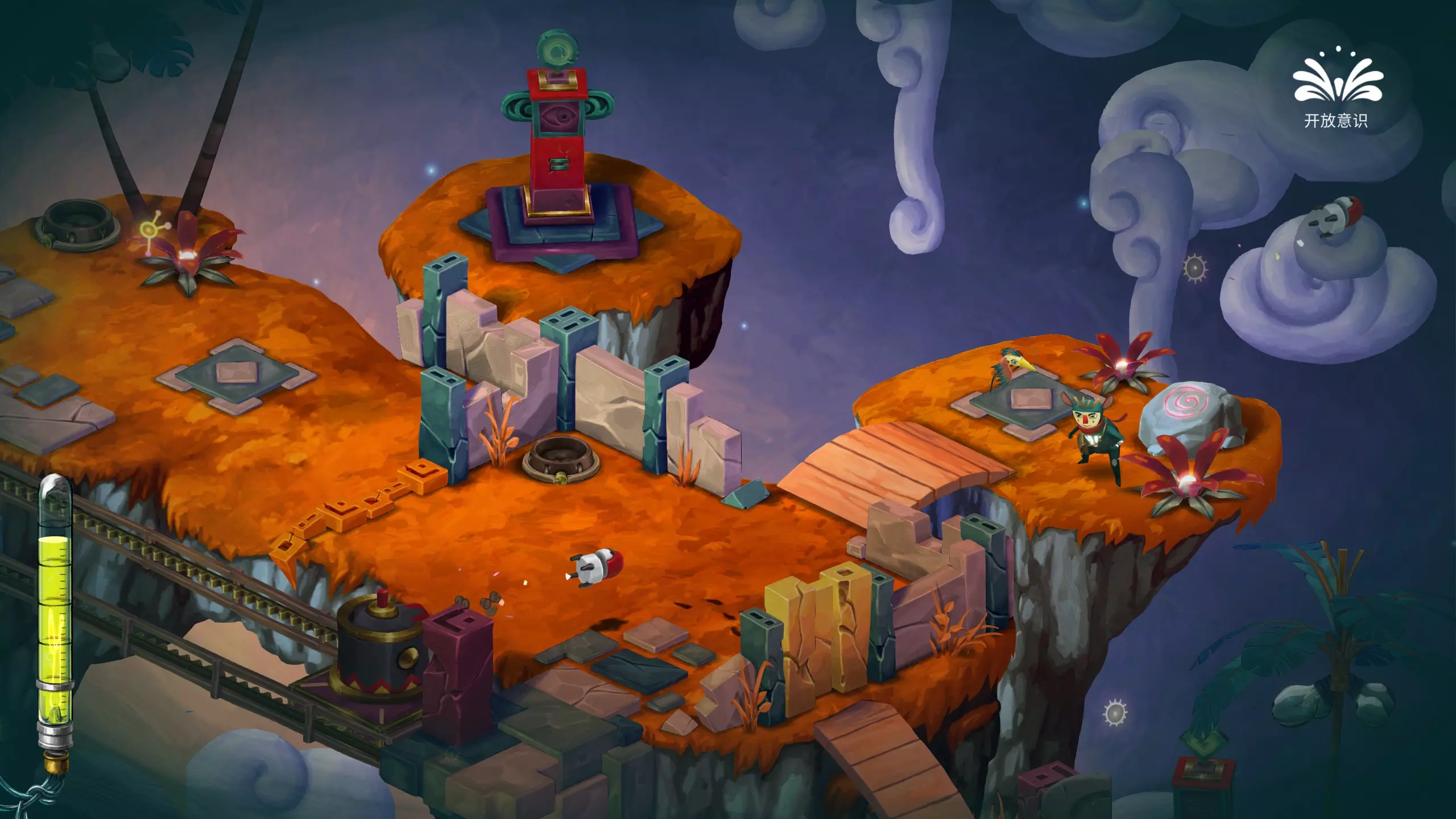 哎哟,疼!被一个椰子球击中头部 遇到意识转换器的时候,切换成开放意识,攻击椰子树,使椰子掉落砸到主角脑袋即可。