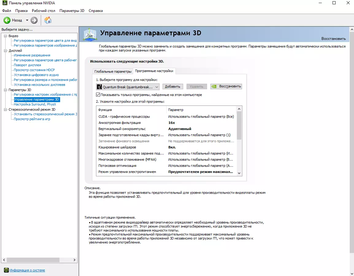 3. 然后进入3D设置管理选项,这里会有“全局设置”和“程序设置”两个标签页,我们需要选择第二个标签页,在其中选择我们的游戏【量子破碎】设置安装 CUDA - 图形处理器 - 使用全局参数(全部) 各向异性过滤 - 8倍(可设为16倍) 垂直同步 - 自适应 虚拟现实预渲染帧数 - 使用全局参数(1) 环境光遮蔽 - 不支持 着色器缓存 - 开启预渲染最大帧数 - 使用全局参数 多帧采样抗锯齿(MFAA) - 使用全局参数(关闭) 流式优化 - 使用全局参数(自动) 电源管理模式 - 首选最高性能模式 快速近似抗锯齿(FXAA) - 使用全局参数(关闭)抗锯齿伽马校正 - 使用全局参数(开启) 抗锯齿参数 - 使用全局参数(无) 抗锯齿透明度 - 使用全局参数(关闭) 抗锯齿模式 - 使用全局参数(关闭) 三重缓冲 - 使用全局参数(关闭) 多显示器加速 - 单显示器性能模式 纹理过滤(各向异性优化)- 关闭 纹理过滤质量 - 使用全局参数 - 质量(若帧率较低则需选择性能) 纹理过滤负LOD偏移 - 绑定 纹理过滤三线性优化 - 使用全局参数(开启)