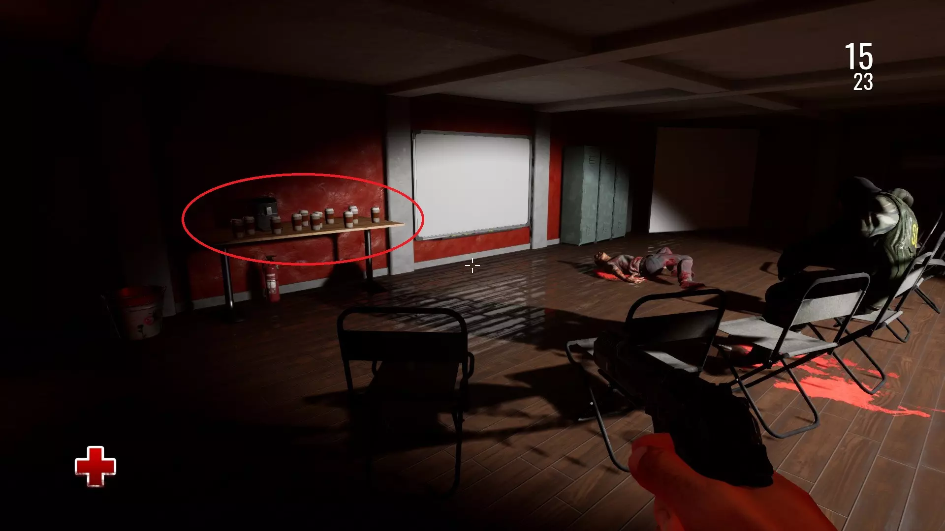 咖啡师 清理阿尔克教室茶水桌上的咖啡杯。 第三章:战斗或逃跑。在有坐着的SG士兵尸体和旁边躺着的僵尸尸体的房间里,左边桌子上有12个咖啡杯。把它们都扔到地上。