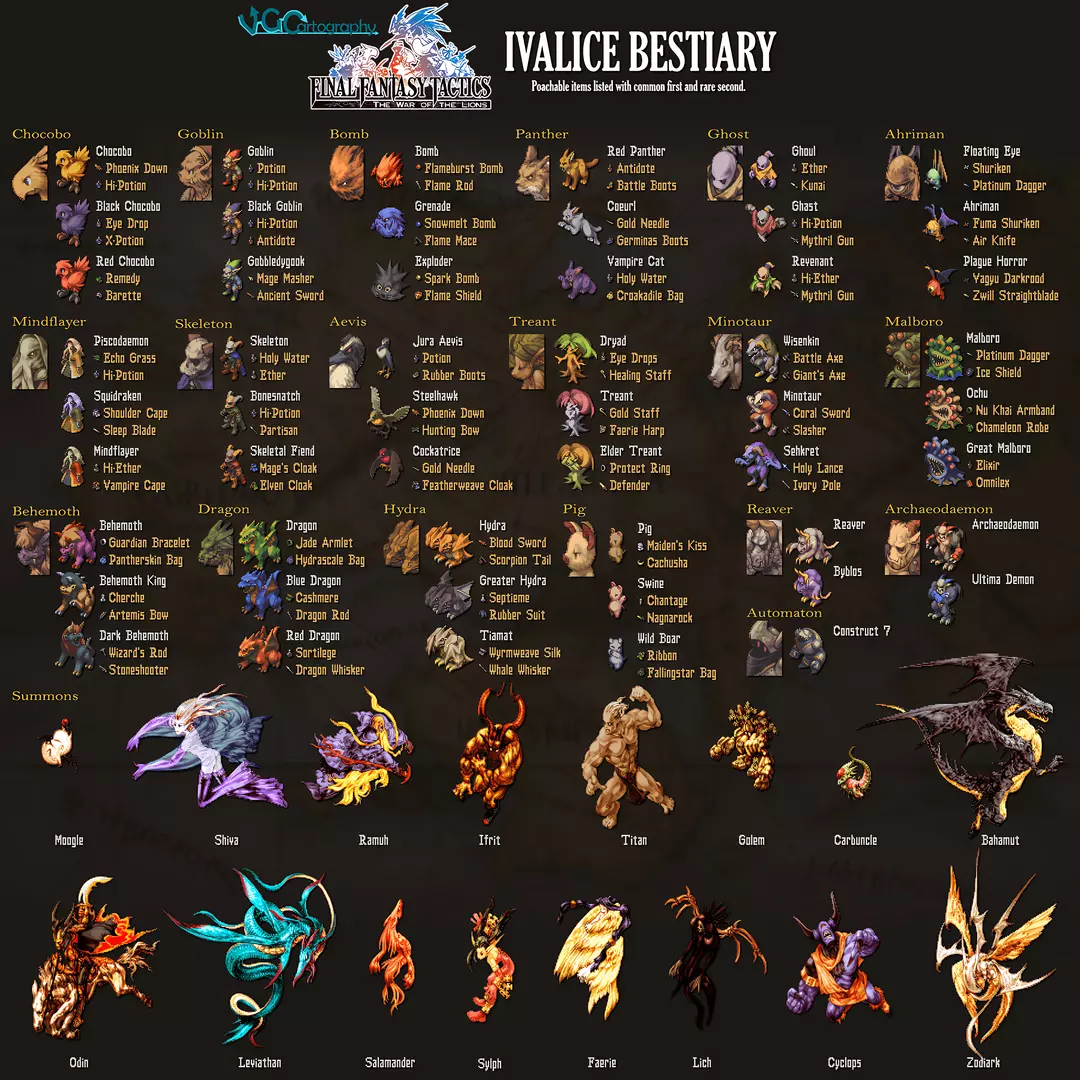 “猎人工坊”是伊瓦利斯部分城镇中的特殊地点。这些地点仅出现在贸易城市:多尔特、瓦利利斯港以及萨尔·吉多斯贸易城。“猎人工坊”仅在第三章开始出现,且只有当拉姆萨队伍中某单位装备了【偷窃技能】中的“猎取”能力时才能进入。在这里,所有被猎取的怪物都会转化为可购买的道具。猎取道具的价格通常远低于装备店中的同类商品,稀有道具也可通过这种方式购买。所有出售给“猎人工坊”的道具都会保留在其库存中,并且可以以原售价再次购买。γ-() ~怪物~ 无害:陆行鸟、哥布林、炸弹、黑豹 中等:夺心魔、骷髅、幽灵、亚希魔 严重:鹰身女妖、野猪、树精、牛头怪 危险:魔花、贝希摩斯、龙、九头蛇 γ-()[] 此处的地点——尤其是较低等级的怪物——更容易在早期发现,因此你可以在第三章初期就能收集到这些皮毛。第四章后,早期游戏地点会新增一系列战斗,届时某些种类的高级怪物会更容易被找到。629 64 18 74 9 远古树人 847 53 19 78 9 牛头怪家族 名称 HP MP PA MA Sp ----------------- --- -- -- -- 智慧种 740 1 24 78 11 牛头怪 877 2 31 78 11 塞赫雷特 828 3 35 78 13 玛尔博家族 名称 HP MP PA MA Sp ----------------- --- -- -- -- 玛尔博 760 5 21 24 10 大蕈怪 630 5 22 29 9 巨型玛尔博 786 3 20 27 9 贝希摩斯家族 名称 HP MP PA MA Sp ----------------- --- -- -- -- 贝希摩斯 887 43 28 82 12 贝希摩斯王 950 50 32 78 13 暗黑贝希摩斯 999 57 45 84 13 龙族 名称 HP MP PA MA Sp ----------------- --- -- -- -- 龙 729 26 27 78 12 蓝龙 740 39 26 82 13 红龙 861 41 30 89 14 九头蛇家族 名称 HP MP PA MA Sp ----------------- --- -- -- -- 九头蛇 745 17 27 22 13 巨型九头蛇 932 57 30 24 14 提亚马特 999 32 38 30 14 特殊家族名称 HP MP PA MA Sp ----------------- --- -- -- -- 自动人偶 866 1 34 1 11 蛇夫座 362 154 7 21 8 ----------------- --- -- -- -- 拜布罗斯 712 125 20 22 11 掠夺者 767 137 21 22 10 ----------------- --- -- -- -- 古恶魔 608 186 26 26 10 终极恶魔 612 184 27 24 10 δ - () ~随机遇敌~ 除了在游戏进程中遇到的主线剧情战斗外,当你在地图上移动时还会遇到随机战斗。 随机战斗发生在地图上的绿点处。当你移动到绿点上或经过绿点时,大约有30%(十分之三)的几率会触发随机战斗。随机战斗规则 战斗机制与剧情战斗基本相同,但存在以下几点差异: - 无需派遣拉姆萨。 - 无法通过随机战斗获得战斗成就。 - 额外硬币的获取方式与剧情战斗相同。 - 队伍中的 guest 不会参与随机战斗。 - 剧情战斗的敌人以人类为主,而随机战斗的敌人以怪物为主。 - 在第二章到达利昂内尔城堡前,最多可派遣4名角色;到达利昂内尔城堡后,直至游戏结束,派遣上限提升至5名角色。 - 剧情战斗中,即使我方等级提升,敌人等级通常也保持固定;但在随机战斗中,敌人等级会基于我方等级生成。敌人等级与能力 在随机战斗中,敌人的经验等级基于你自身的等级! 具体来说,它由你队伍中等级最高的角色决定——即使该角色未部署在当前活跃小队中!这个角色的等级越高,敌人就越强。(个别敌人的经验等级可能高于或低于这个“最高等级”,但正是这个“最高等级”决定了敌方队伍的整体强度。) 大多数普通敌人使用的装备直接由其经验等级决定。 (即使在剧情战斗中也是如此!) 例如,一名31级的普通武士总会装备村正。 敌人的技能似乎是半随机的。他们的能力通常与其职业相匹配,但有时也会出现不太实用的组合,比如拥有跳跃技能的召唤士。 地点与敌方队伍 地图上的不同地点会出现不同种类的随机战斗敌人。 此外,进入地点的方向也会影响遇到的敌人种类。 例如,从艾格罗斯向南进入曼达利亚平原,有几率遇到魔花螳螂。但如果从加里兰或强盗巢穴进入曼达利亚平原,魔花螳螂则不会出现。 进入方向还会决定队伍在地图上的起始位置。 比如,从西边进入芬纳斯溪,队伍会从河的上游开始;但从东边进入,队伍则会从河的下游开始。以下是各地点会出现的怪物和人类敌人类型,以及它们平均出现频率的大致估计: 常见:平均出现概率为50%或更高。 不常见:25%-49%。 稀有:8%-24%。 非常稀有:低于8%。 当然,这些都只是平均值,因此有时你可能遇不到某种特定敌人,有时则可能遇到不止一个。例如,如果黑陆行鸟在某个区域属于不常见敌人,平均每2到4场战斗会遇到1只黑陆行鸟(出现概率为25%到50%)。但在某场战斗中,你可能一只黑陆行鸟都遇不到,也可能遇到2只甚至3只。 随着游戏的推进,每个地点会出现更多种类的敌人。在第一章中,你通常只会遇到有限种类的基础怪物,一些更高级的怪物和人类敌人则极为罕见。 第二章开始时,高级怪物和人类敌人会变得更为常见,而到了第四章开始,还会新增更多敌人。 在少数地点,你偶尔会遇到友好的【 guest character 】,他们会在随机战斗中提供帮助。这些角色也包含在列表中。大多数 guest character 不会加入你的队伍,但有少数会在战斗结束后加入,这一点我也已注明。 拥有特殊职业或敌方专属职业的剧情角色不会出现在随机战斗中。请注意,以下怪物/职业在随机战斗中绝不会出现: 野猪 吟游诗人 舞者 模仿士 暗黑骑士 洋葱骑士 【午夜深渊的随机战斗】 午夜深渊中的战斗本质上属于随机战斗,上述所有规则同样适用。(例外情况是首次进入第10层“终点”时触发的剧情战斗。) 从菜单中选择特定楼层后,必定会进入战斗。(与大地图不同,这里不存在不遇敌的情况。) 仅在地图上移