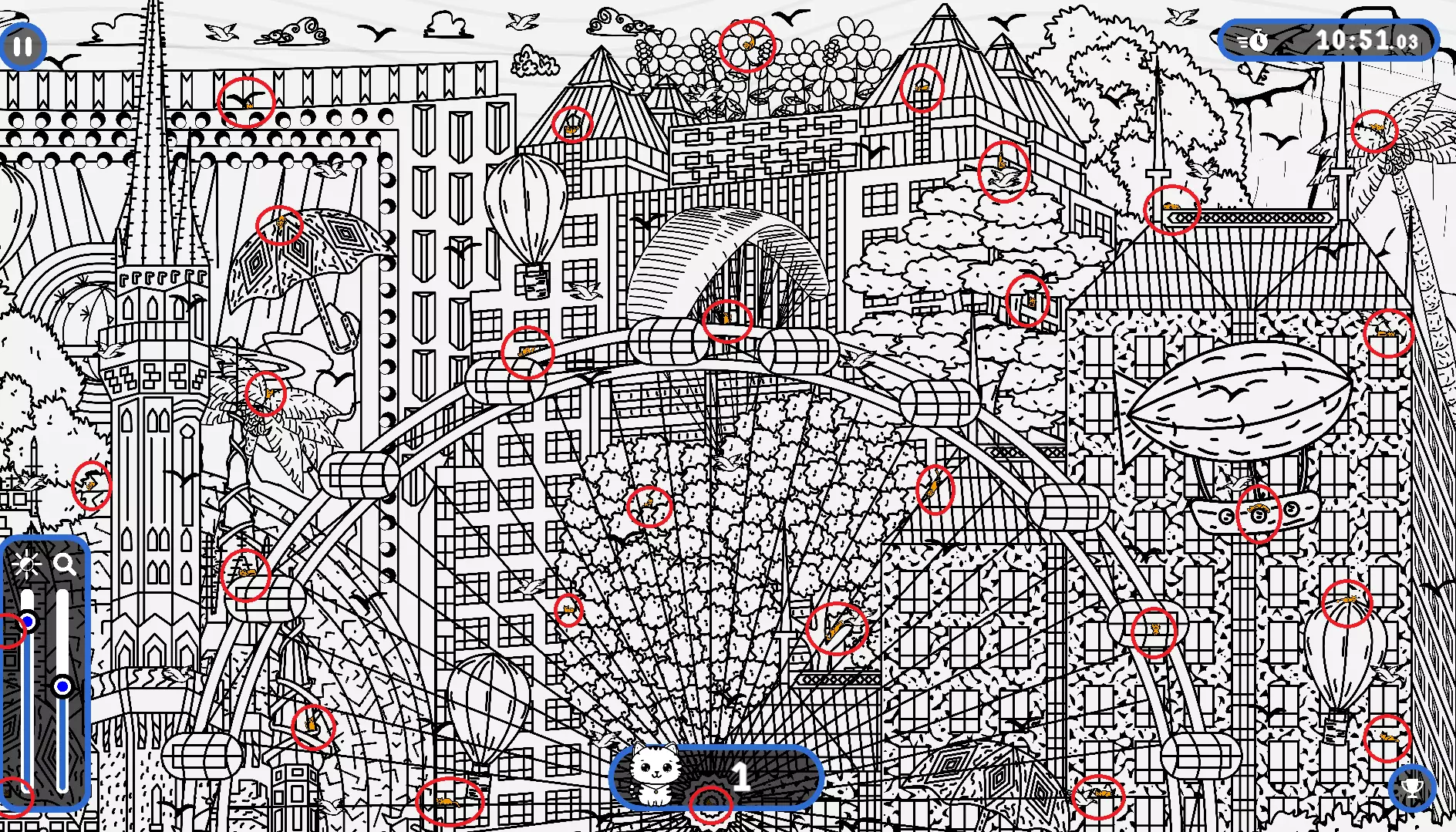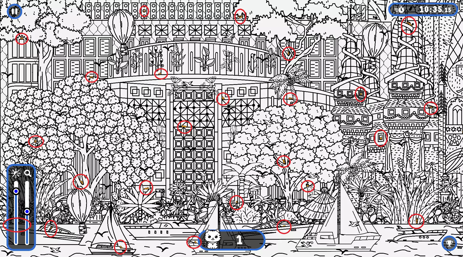 大家好, 本指南旨在帮助你找到所有隐藏的猫咪。有些猫咪很难被发现,所以如果你在寻找遗漏的猫咪以完成游戏,欢迎使用本指南或参考一下。保证能达成100%成就! 祝玩得开心! 猫咪的所有位置 注意: 1) 最后一只猫咪在绿色圆圈内。 2) 请注意,有些猫咪隐藏在用户界面和计数条后面。它们也被圈出来了。 左侧