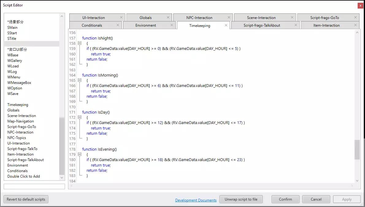 在iFVN编辑器中使用脚本 现在我们为大多数常见的时间单位设置了单独的变量。但这还不够完善,因为iFVN只能通过点击变量列表来显式测试每个变量的特定值或范围,这种方式很快就会变得繁琐,而且容易出错。如果我们能在Javascript代码中编写布尔函数,然后通过脚本选项调用这些函数,情况会好得多。