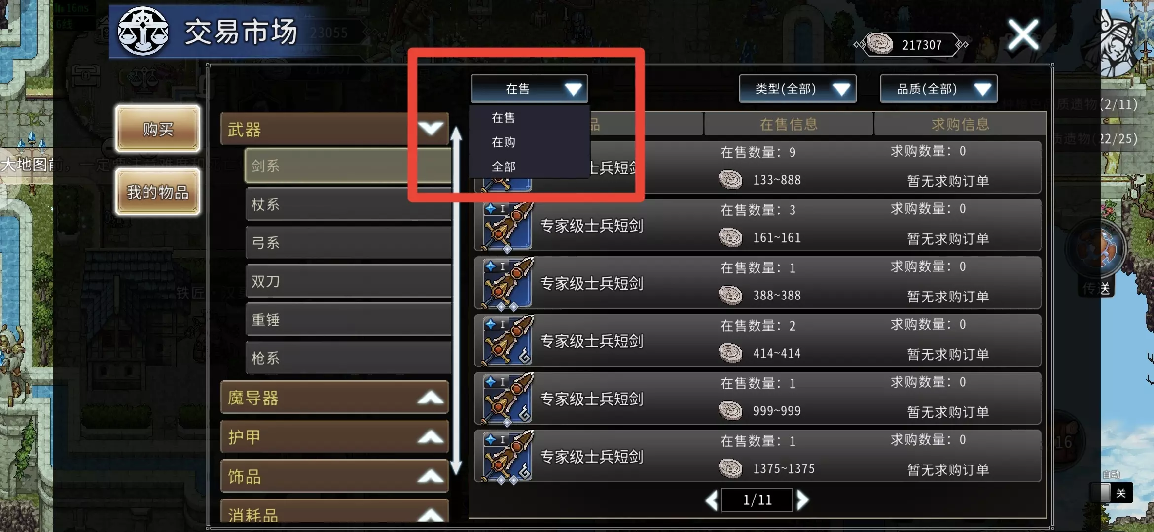 Q18.如何挂求购订单? A18.首先打开交易市场,然后将左上角的【在售】改为【全部】。