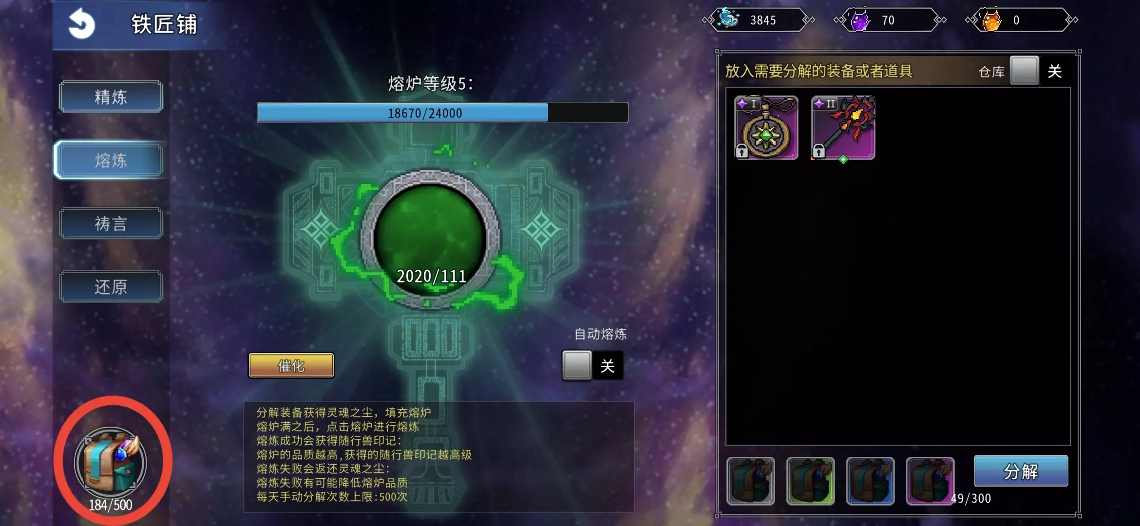 Q11.宠物印记是什么?怎么获得? A11.宠物印记在铁匠铺熔炼可获得,用于给宠物佩戴来解锁宠物给角色提供的加成。铁匠铺熔炼界面,点击左下角背包即可查看持有的所有印记。