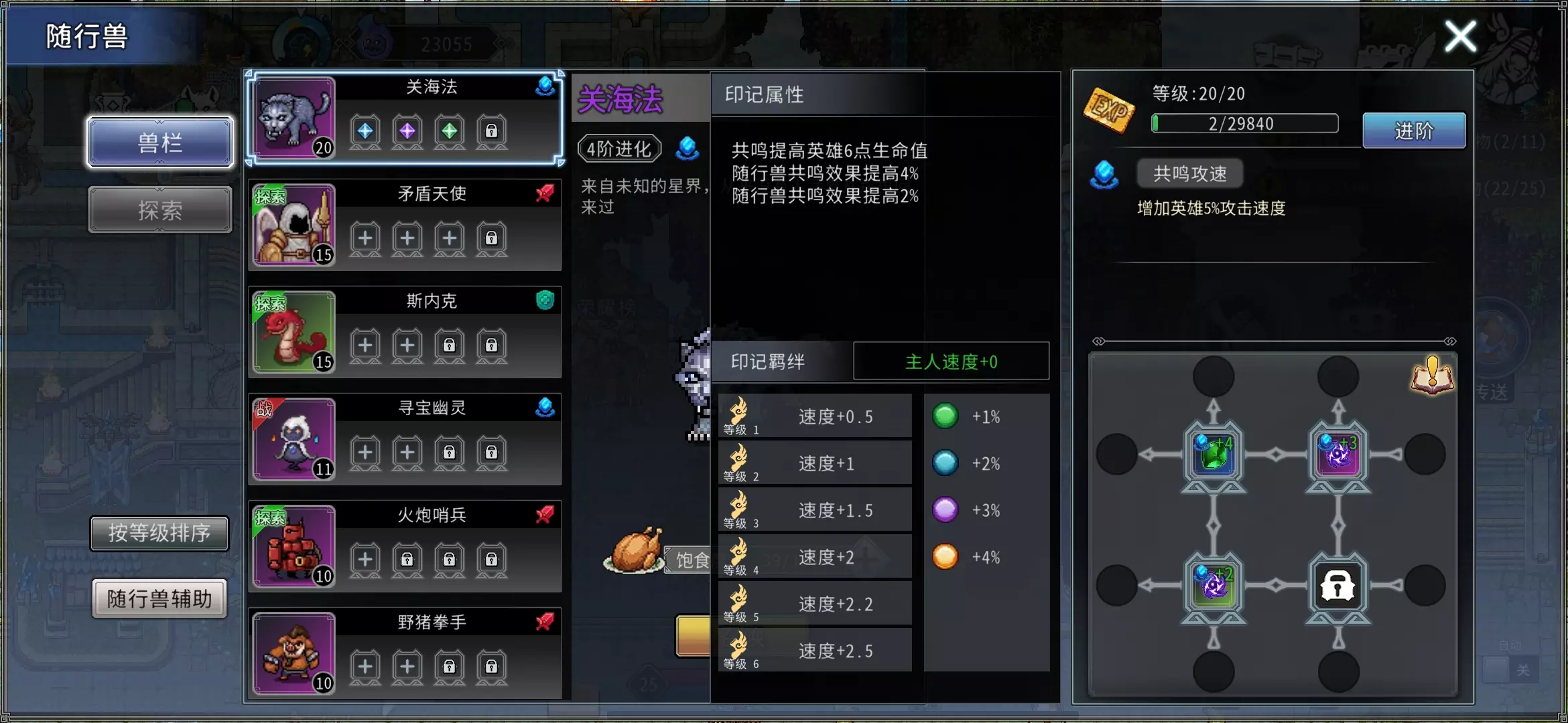 相同品质等级的印记可以触发羁绊效果,4级印记增加2+2=4点速度,橙色品质增加4×4%=0.16点速度,所以目前共计增加4.16点速度。