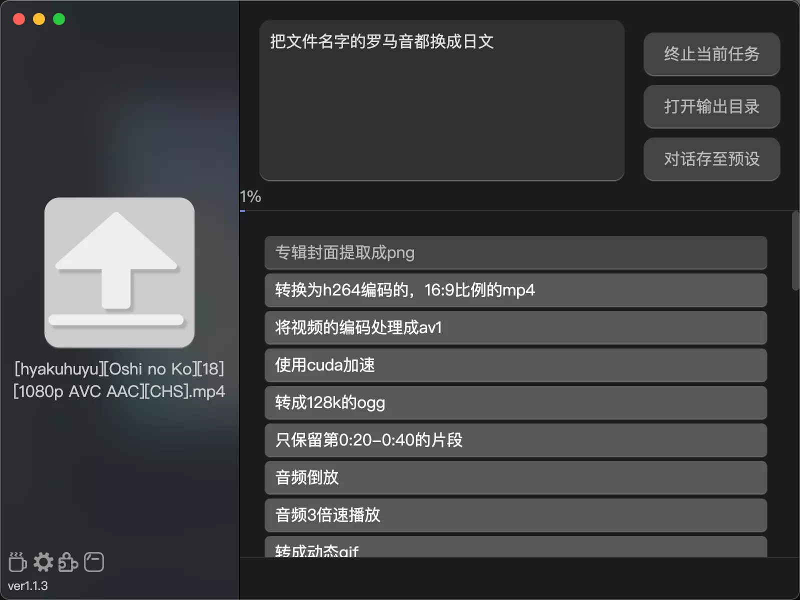 字面意思,上传多个文件后,就可以通过对话进行各种批量重命名操作。由于是AI驱动,所以像“把每个文件名的英文都翻译成中文并逐个从01开始加序号”这种要求也能实现。又或者是“去掉每个文件名中的歌手名部分,只保留歌曲名,歌手名在文件名开头,横线之后的是歌曲名”。再或者是“把每个文件的罗马音都翻译成日文”。请多多尝试。另外,使用批处理进行单纯的重命名操作时,请务必在末尾加上“使用-copy”,否则程序会在重命名的同时进行转码,造成不必要的性能开销。(ps:这个攻略的图片也是全部用Kurisu裁剪的,它的咒语是“裁剪图片,横向只保留中间1/2部分,纵向只保留从上到下第一列的部分(距离顶部150px),宽度195x的正方形”)。 然后目前Kurisu用的人真的好少,不过算了,没人用那我就自己用了。 Kurisu的奇怪用法