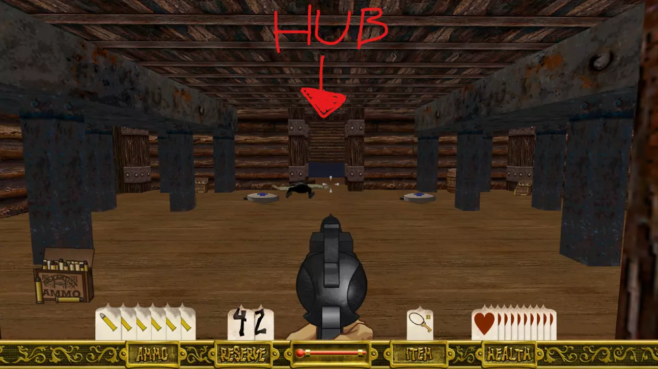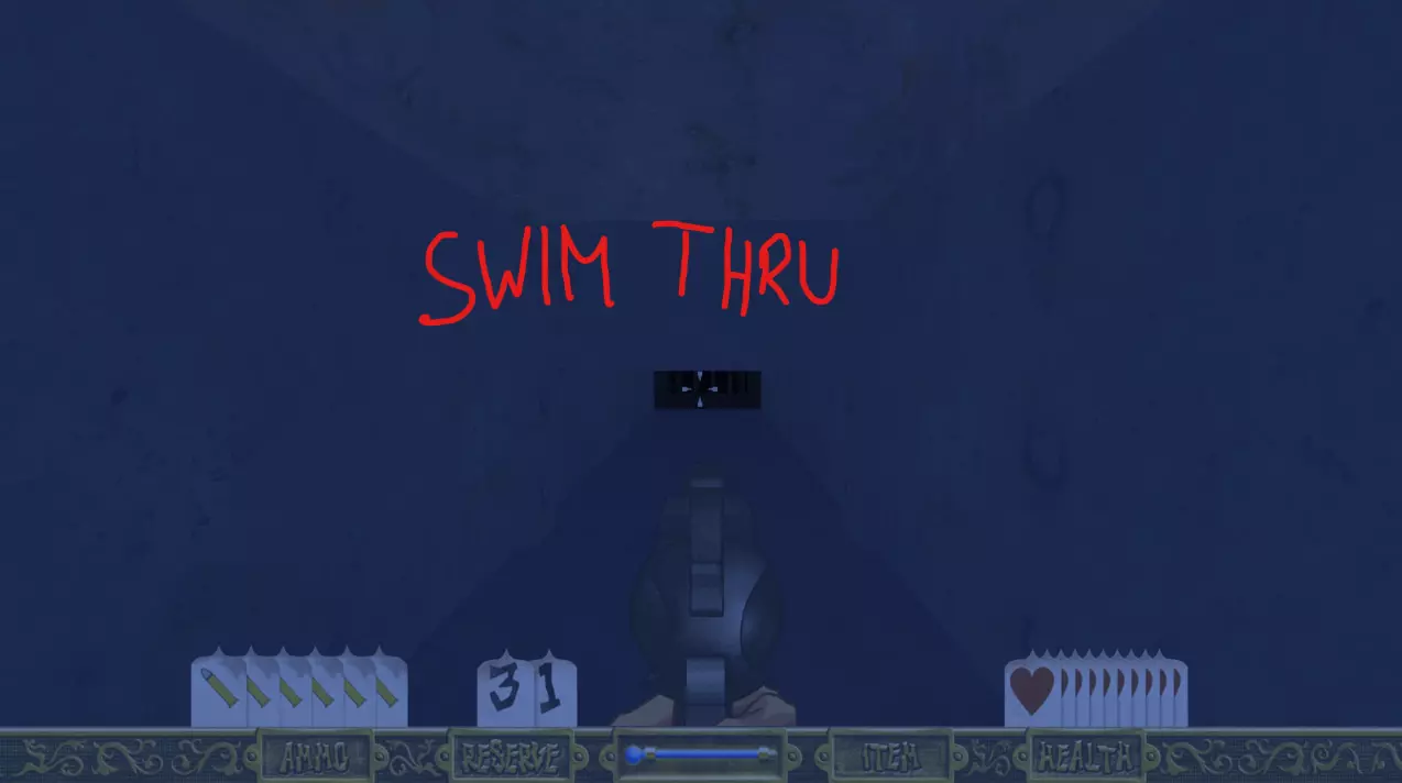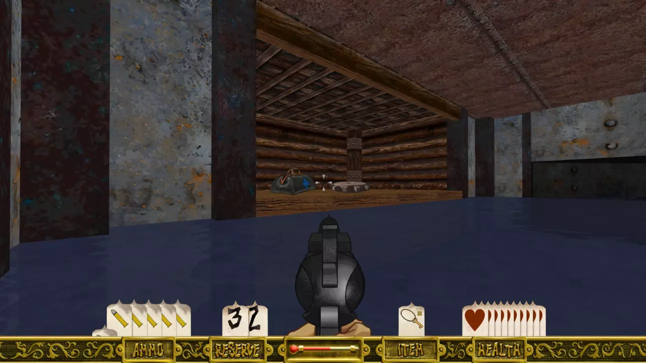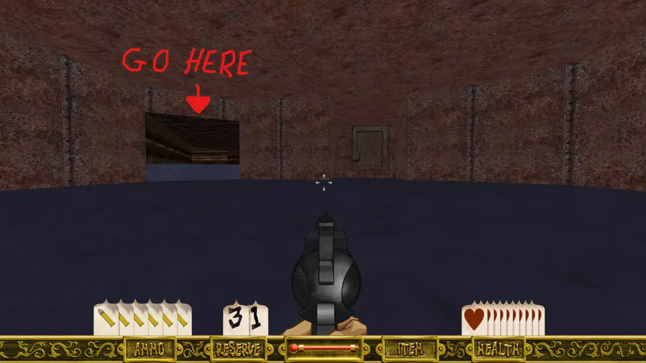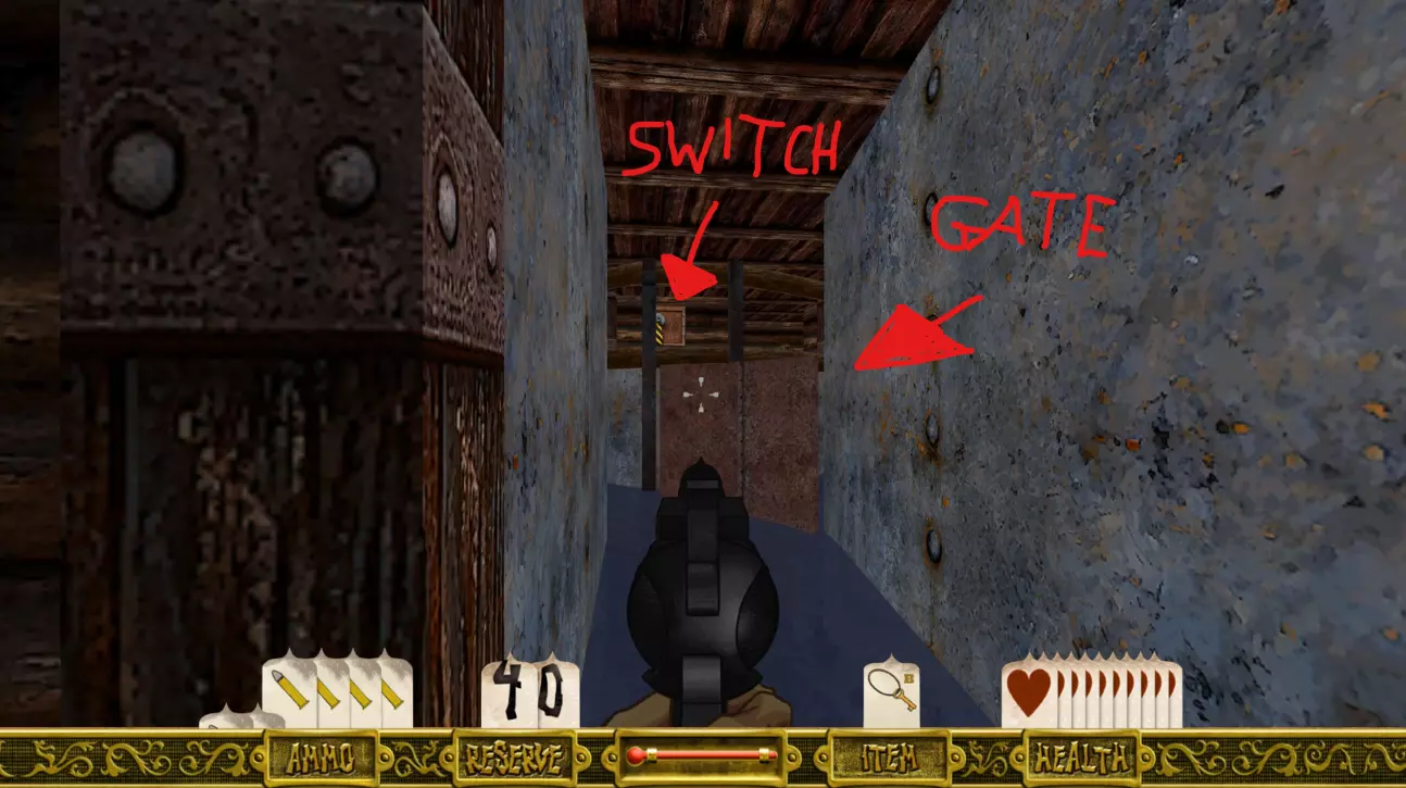 沿着走廊前进,逐个清理房间,你会遇到几个红色按钮(一个在左侧房间,一个在右侧房间)。按下右侧的按钮会打开通往隔壁房间的门,你可以透过铁栅栏看到里面。房间里装满了弹药和生命值道具。 左侧的按钮会打开走廊尽头的门。准备好后穿过那扇门。 走廊会继续延伸一段距离,左侧有一扇门需要铁钥匙才能打开。记住这扇门,稍后会用到。 径直往前走会到达第一个有水的区域,这是本关卡中你需要频繁返回的最重要部分,算是一个中心枢纽。(留意你身后右侧那扇“纹丝不动”的门,它稍后会打开。)