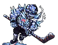 执行者,等级9 冻伤 生命值:420,耐力:40 攻击力:48,防御力:12,球技:20,公牛防御:12,敏捷:15,运气:10 物品:曲棍球棍(100%),护胸甲(25%),曲棍球头盔(25%) 弱点:【火焰】 抗性:【寒冷】