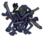剧毒弗莱德,5级绘画 生命值:120,耐力:60 攻击力:20,防御力:1,球:20,公牛防御:2,敏捷:20,运气:10 弱点:【火焰】【酸】 免疫:【粉碎】 备注:不会死亡。在其首次行动时分裂为绿色弗莱德(上)、绿色弗莱德(左)和绿色弗莱德(右)