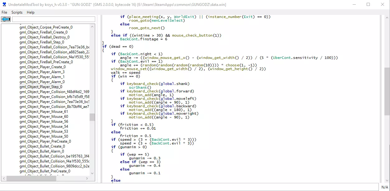 本指南将帮助你解决按住开火键时无法转向,以及按空格键使用短刀会导致灵敏度异常的问题。 自行操作步骤: 1. 如果你想自己动手操作,且不想冒感染病毒的风险(这可以理解),可以按以下步骤进行。 2. 在网上搜索并从github下载UndertaleModTool(一款GameMaker引擎的编辑工具)。打开代码部分下的此脚本,并删除标记出的行(这也能修复刀子转向的bug)