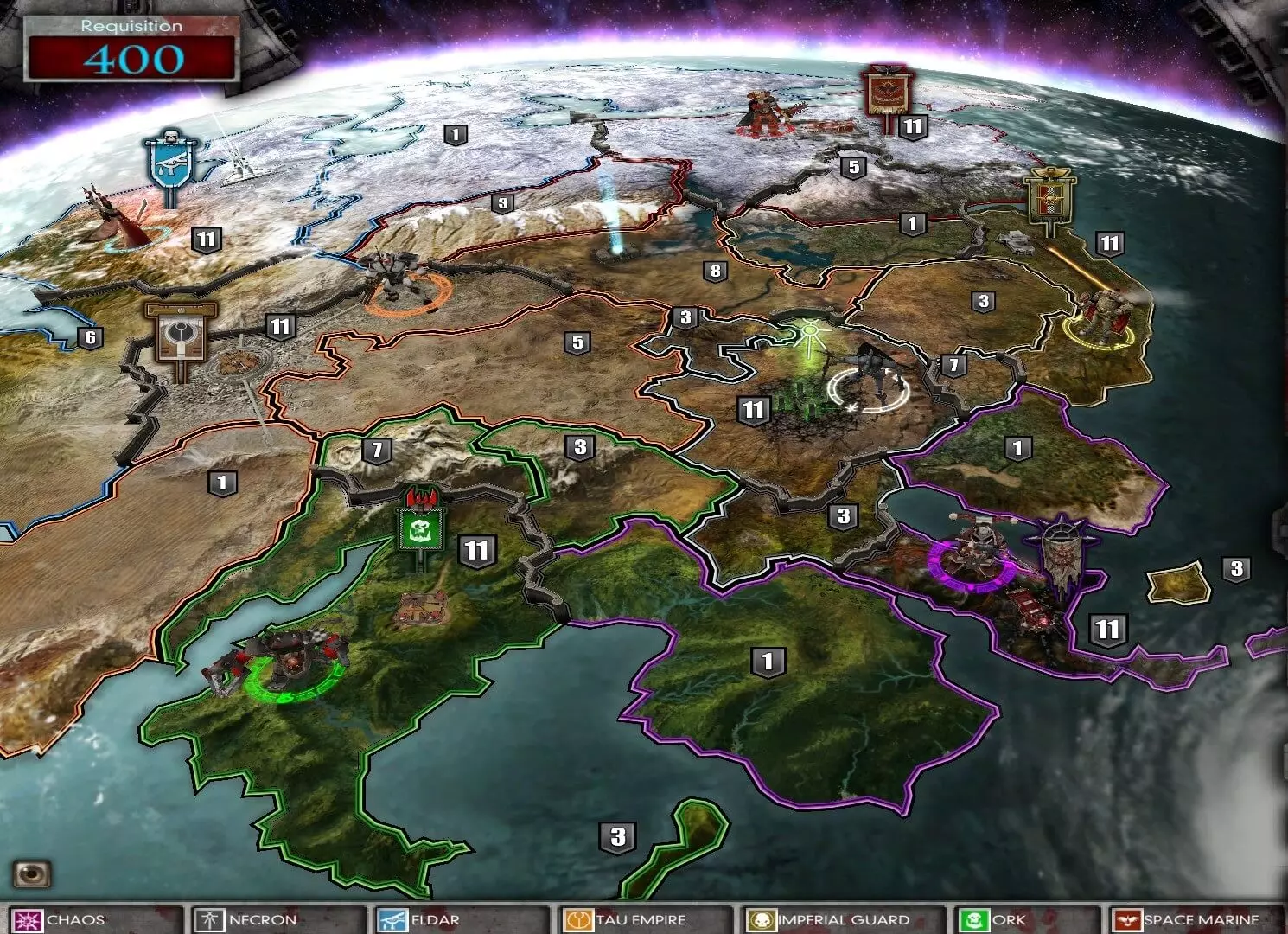 螯钳,其机械结构占据了兽人装甲的相当一部分。戈尔古茨以不同方式使用螯钳。由于未知原因,戈尔古茨不再使用他的喷吐武器。因此,他的左手没有任何武器。戈尔古兹的祭品 克鲁尔领主——世界吞噬者领主 英德里克·博雷尔——血鸦战团连长 奥雷萨卡指挥官——钛族殖民舰队指挥官 菲拉埃弗斯·卡伦——阿尔法军团领主 考拉夫 Necron领主 来自黑心乌尔特瓦 Kabal 的灵视者凯丽丝及其指挥官阿洪·塔瑞拉 塞莱娜·阿格纳修女——圣玫瑰修会修女长 指挥考拉夫解放者第252团的文斯·斯塔布斯将军碎颅领主沃恩五世 沃恩五世是高格兹首次现身的星球,最初属于帝国,但被混沌战帮“世界吞噬者”在混沌领主克鲁尔的率领下攻占。 绿皮兽人(欧克)与混沌星际战士为争夺这颗星球展开激战。就在此时,高格兹联合了星球上的所有兽人,集结起一场“ waaagh! ”( waaagh! )。联合之后,兽人向混沌基地发起了进攻。战斗中,混沌势力摧毁了戈尔古茨能量护盾的能量源,几乎杀死了这个兽人,但帝国卫队突然发起了攻击。混沌领主和兽人军阀决定进攻帝国卫队的基地。克鲁尔正面发动攻击并突破了防御工事,而兽人则通过下水道潜入,摧毁了卡迪安第412团的侦察基地。戈尔古茨与克鲁尔达成临时休战协议,共同对抗敌人。在联盟击溃播种者后,战斗打响,戈古茨击败了克鲁尔,并将其颅骨装饰在了兽人图腾上。在战胜混沌领主后,戈古茨离开了洛恩五号行星。 克罗努斯 在洛恩五号行星战败后,戈古茨在钛帝国边境的星球上大肆劫掠。他收到了来自克罗努斯的求救信号,于是决定袭击这个脆弱的目标。混沌、帝国、灵族和 Necron(太空死灵)的军队都已入侵钛族殖民地,如今各方为争夺这颗星球而战。当兽人舰队从亚空间(Warp)驶出,抵达行星轨道时,帝国与钛族的舰队正在激战。他们未能阻止兽人舰船坠入大气层。戈尔古茨匪帮在绿湾登陆,并收服了当地的兽人。