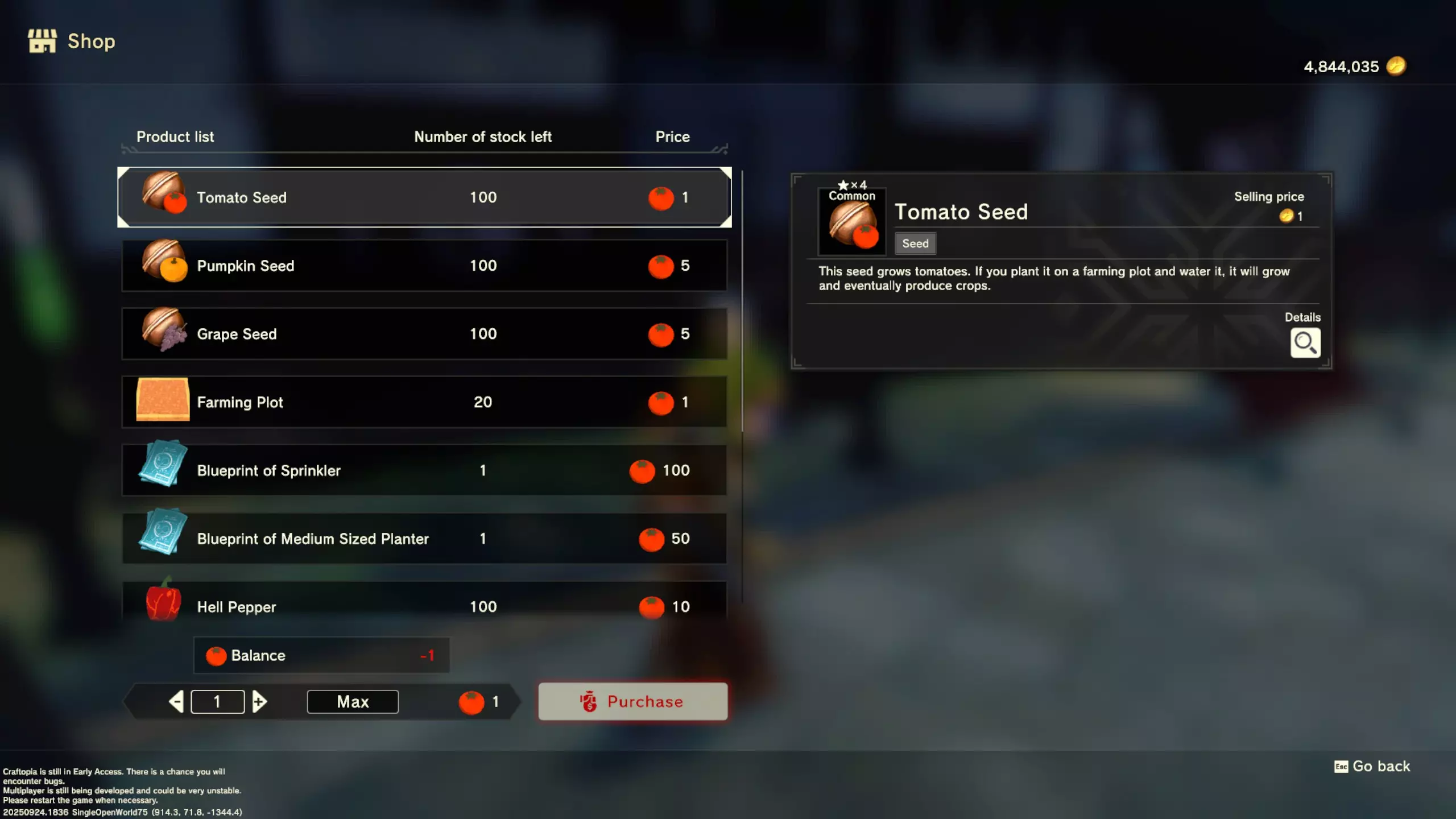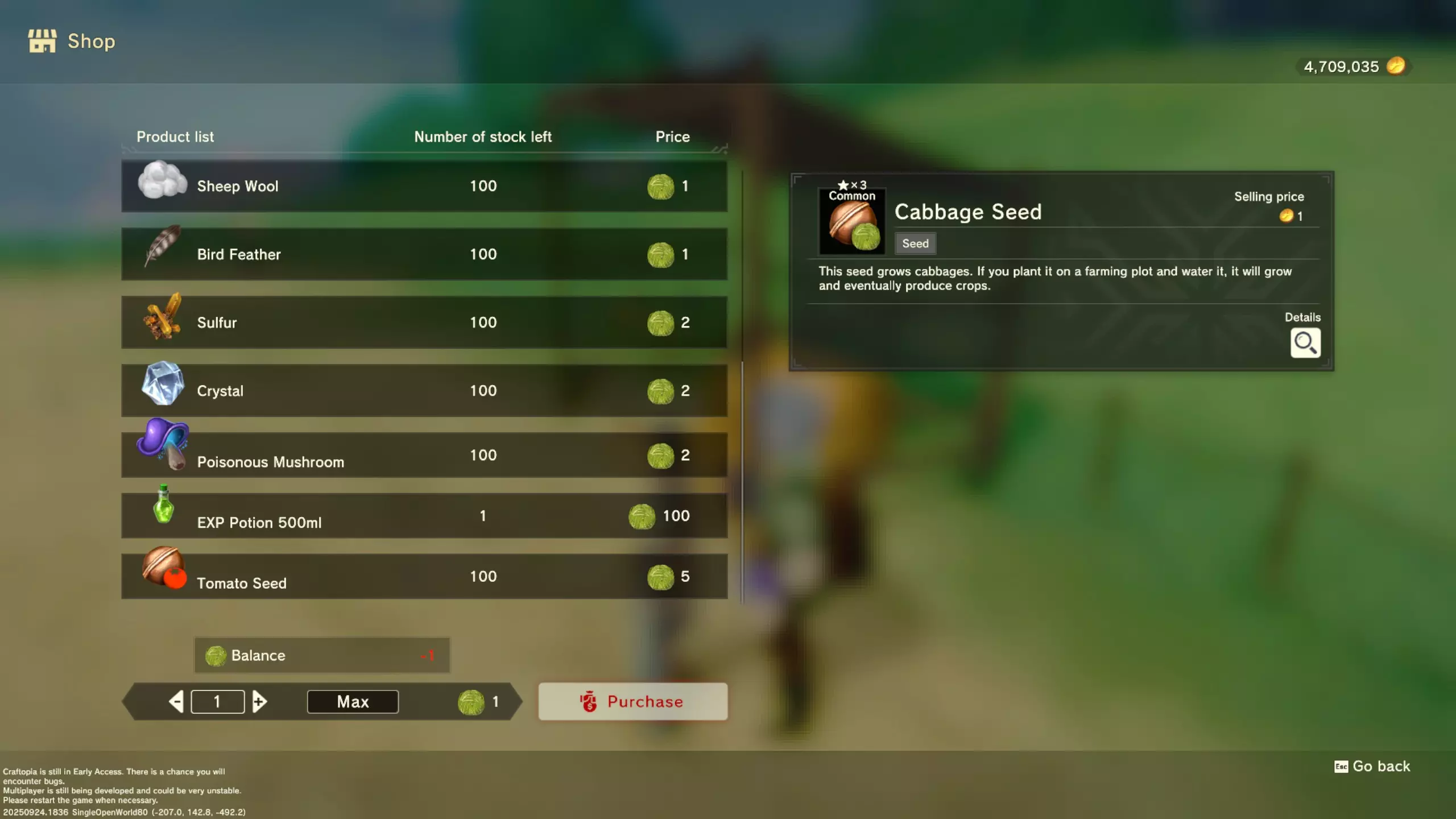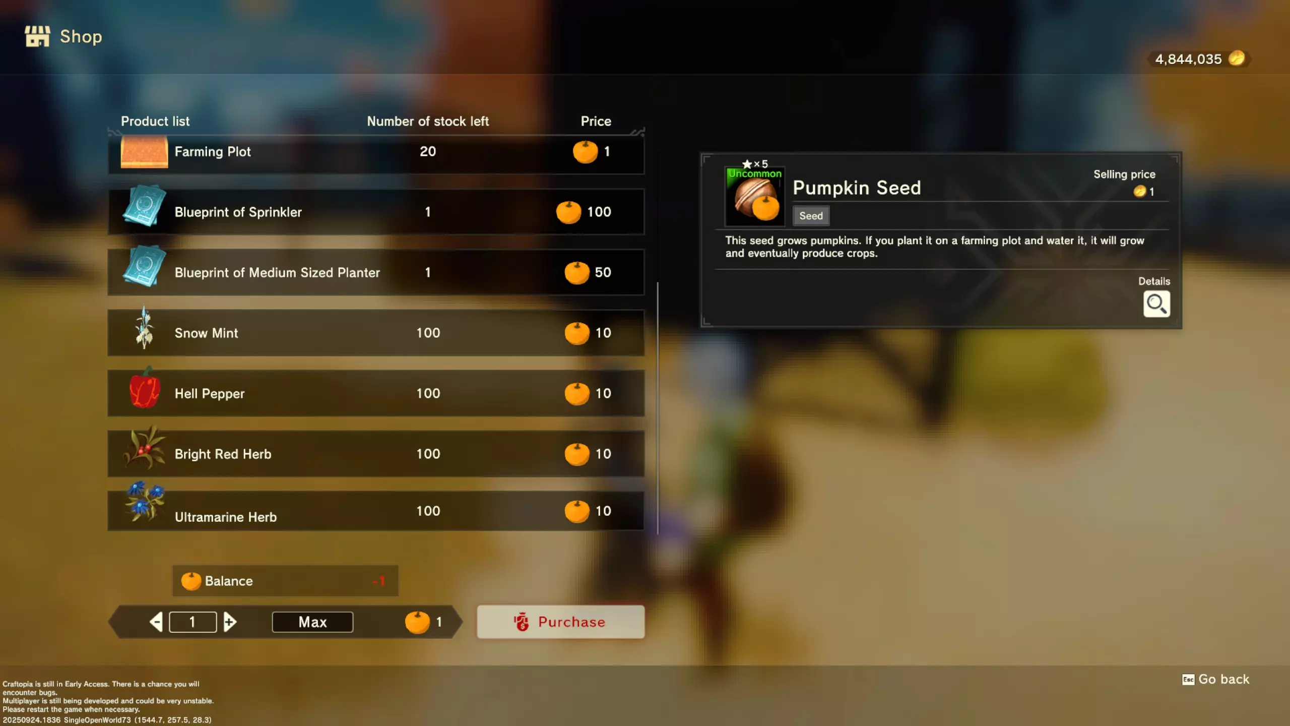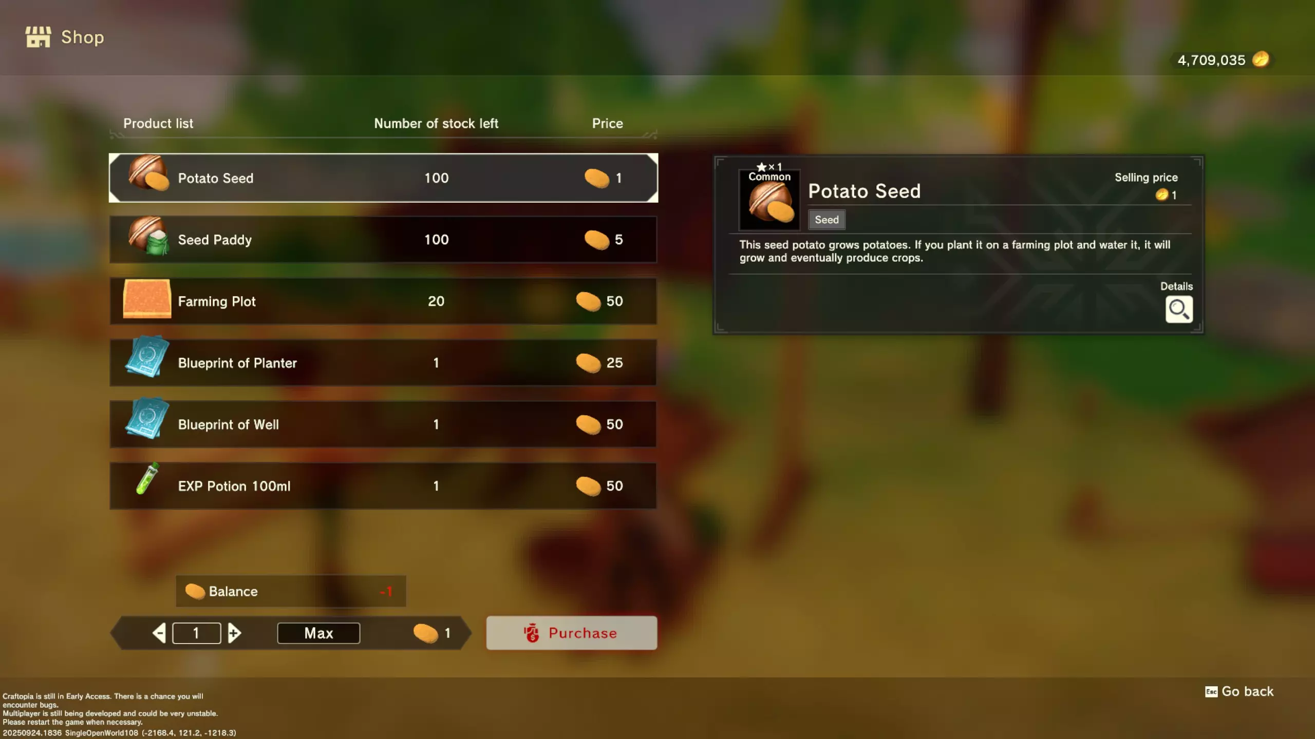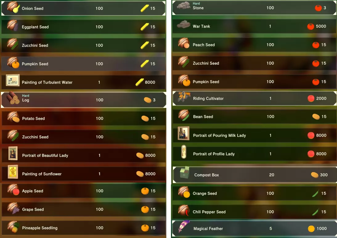更大版本在此 物品名称# 库存 作物成本 土豆种子 100 15 豆类种子 100 15 苹果种子 100 15 南瓜种子 100 15 葡萄种子 100 15 辣椒种子 100 15 桃子种子 100 15 橙子种子 100 15 西葫芦种子 100 15 茄子种子 100 15 洋葱种子 100 15 菠萝种子 100 15 湍流之水画作 1 8000 美丽女士肖像 1 8000 倒牛奶女士肖像 1 8000 向日葵画作 1 8000 侧面女士肖像 1 8000 魔法羽毛 5 1000 战争坦克 1 5000 骑乘式耕耘机 1 2000 堆肥箱 20 300 硬木原木 100 3 硬石 100 3 目前我从未见过有卷心菜种子、番茄种子和水稻种子出售。 全部文字说明 如果出于某种原因你希望查看所有文字说明,那么下面这部分就是为你准备的。但我只想说,图片能让这一切变得简单得多。你真的要试图让我相信你知道什么是刺剑吗?但当我给你看这把剑的图片时,它就在那里。知识储备完成!不管怎样……我还在研究这个。这需要大量的写作和格式调整……我可能会完成这部分,也可能不会。 吉扎高原村 土豆商人 物品名称 库存数量 土豆价格 土豆种子 100 1 水稻种子 100 5 耕地 20 50 播种机蓝图 1 25 水井蓝图 1 50 100级经验药水 1 50 黄金商人 物品名称 库存数量 黄金价格 原木 100 10 石头 100 10 旧抹布 100 50 树枝箭 100 10 宽剑 1 100 细剑 1 500 拐杖 1 500 木刀 1 500 双手剑 1 500 干草叉 1 500 面包 100 25 烤鱼 100 100 牛排 100 100 小型生命药水 100 100 木箭 100 20 土豆种子 100 50 悬浮滑板 1 700 传送药水 100 100 灯笼 1 500