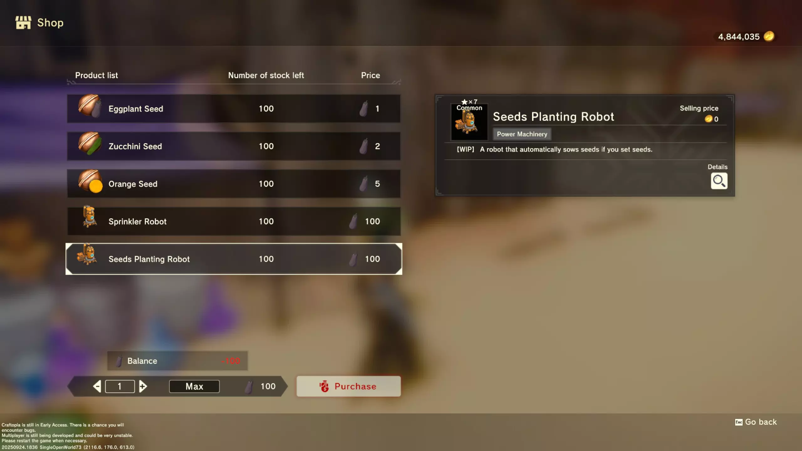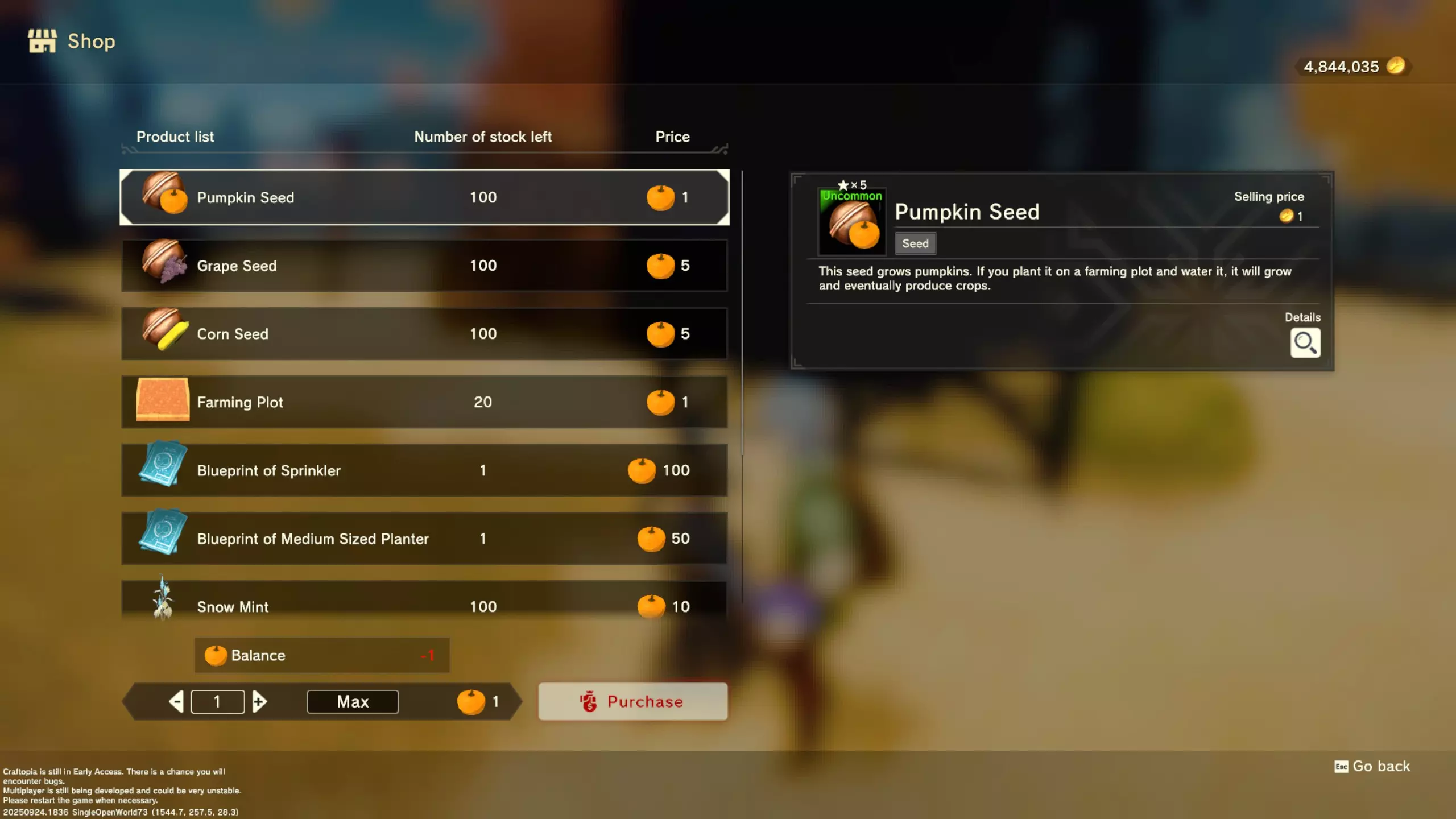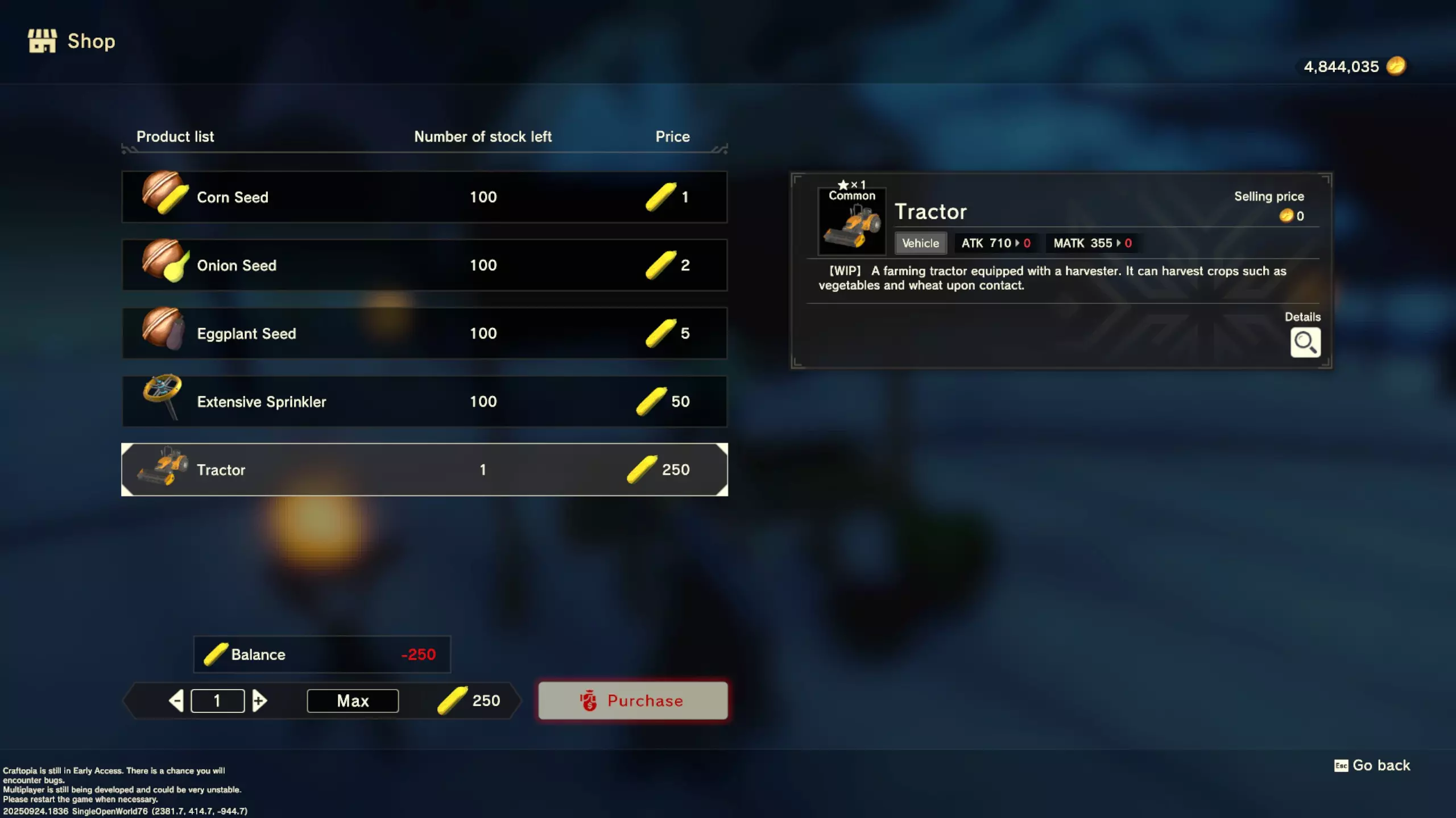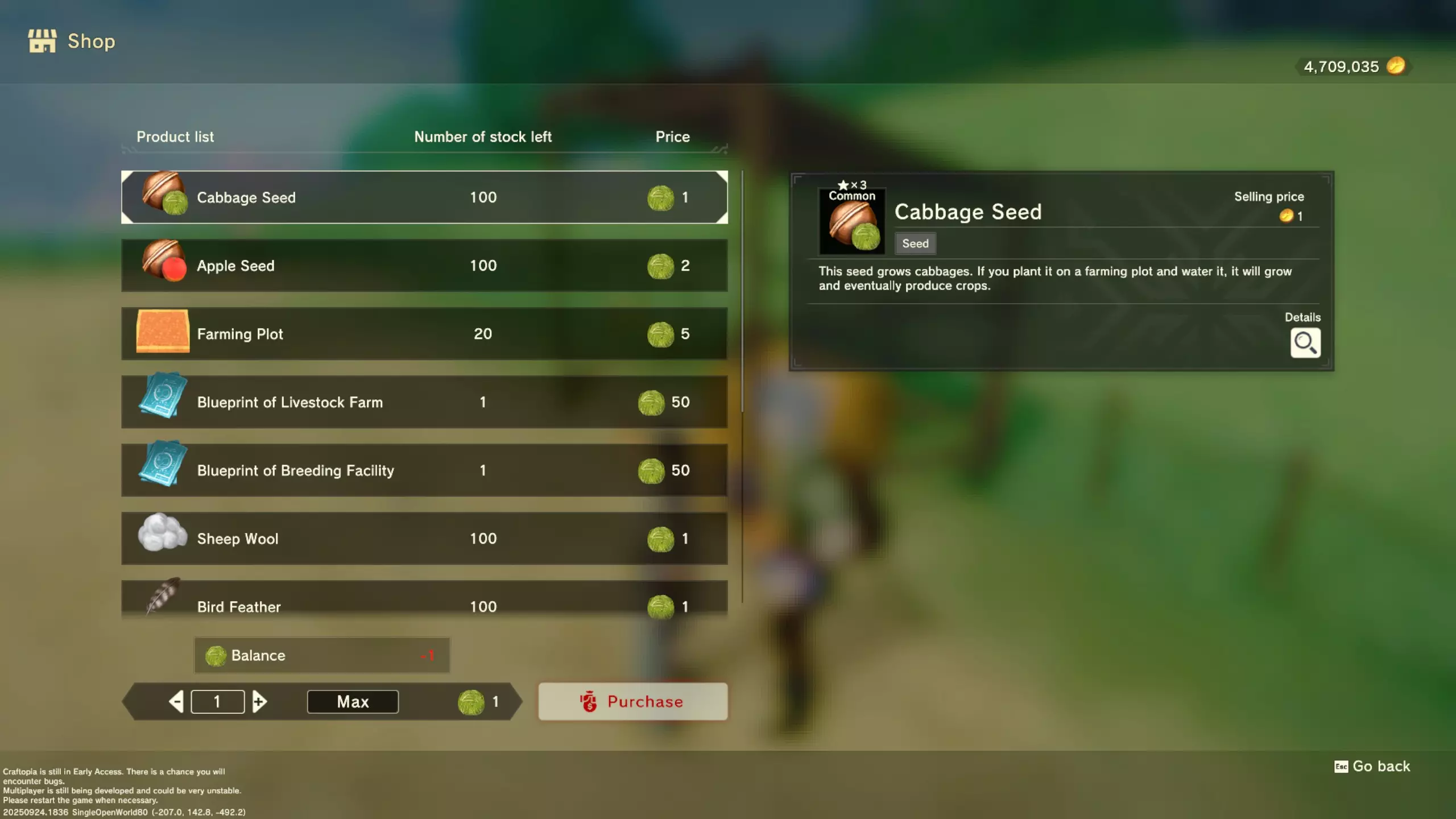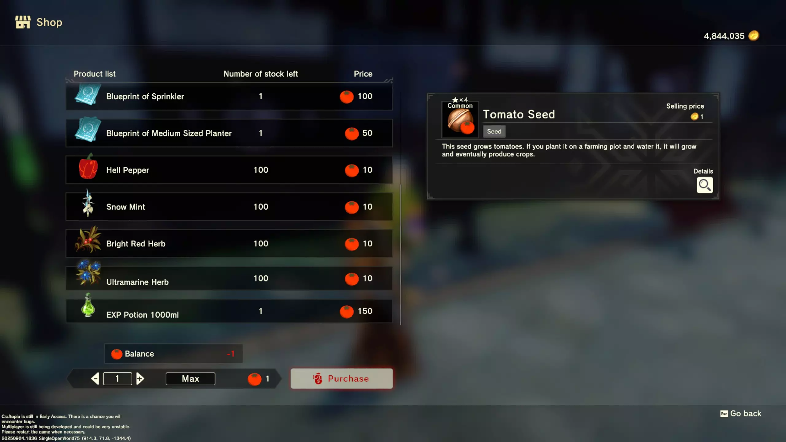 更大版本在此 物品名称# 库存 作物成本 土豆种子 100 15 豆类种子 100 15 苹果种子 100 15 南瓜种子 100 15 葡萄种子 100 15 辣椒种子 100 15 桃子种子 100 15 橙子种子 100 15 西葫芦种子 100 15 茄子种子 100 15 洋葱种子 100 15 菠萝种子 100 15 湍流之水画作 1 8000 美丽女士肖像 1 8000 倒牛奶女士肖像 1 8000 向日葵画作 1 8000 侧面女士肖像 1 8000 魔法羽毛 5 1000 战争坦克 1 5000 骑乘式耕耘机 1 2000 堆肥箱 20 300 硬木原木 100 3 硬石 100 3 目前我从未见过有卷心菜种子、番茄种子和水稻种子出售。 全部文字说明 如果出于某种原因你希望查看所有文字说明,那么下面这部分就是为你准备的。但我只想说,图片能让这一切变得简单得多。你真的要试图让我相信你知道什么是刺剑吗?但当我给你看这把剑的图片时,它就在那里。知识储备完成!不管怎样……我还在研究这个。这需要大量的写作和格式调整……我可能会完成这部分,也可能不会。 吉扎高原村 土豆商人 物品名称 库存数量 土豆价格 土豆种子 100 1 水稻种子 100 5 耕地 20 50 播种机蓝图 1 25 水井蓝图 1 50 100级经验药水 1 50 黄金商人 物品名称 库存数量 黄金价格 原木 100 10 石头 100 10 旧抹布 100 50 树枝箭 100 10 宽剑 1 100 细剑 1 500 拐杖 1 500 木刀 1 500 双手剑 1 500 干草叉 1 500 面包 100 25 烤鱼 100 100 牛排 100 100 小型生命药水 100 100 木箭 100 20 土豆种子 100 50 悬浮滑板 1 700 传送药水 100 100 灯笼 1 500