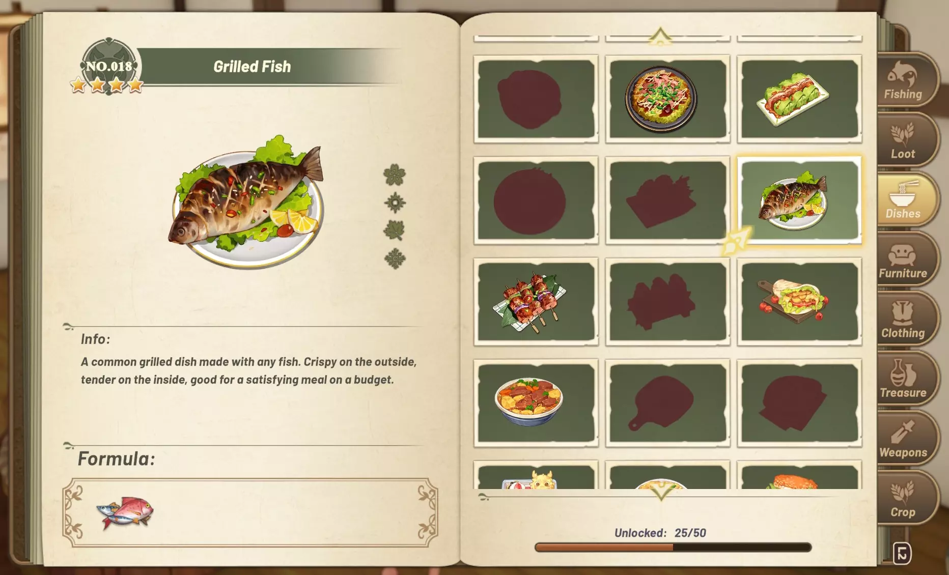 如果在这种情况下需要操作某些内容,我会切换到使用鼠标。 遗憾的是,当连接控制器时,游戏不太接受鼠标和键盘输入。(例如,只要游戏处于前台运行状态,鼠标光标往往会被锁定在屏幕中央。)你可能需要暂时拔掉控制器,之后再重新插上。 委托板截止时间 游戏初期,你会接触到委托板,上面有各位居民发布的想要完成的任务。委托板上未标记【重要】的任务,从接受之时起都有3天的时间限制。其中一些【非重要】任务如果能完成,可能会带来非常丰厚的奖励。如果接受限时任务后时间耗尽会怎样?任务会从任务列表中消失。除此之外呢?不会有任何影响。没有惩罚,也不会有人对你不满。(显然,接取委托板任务并非承诺,更像是私人的“自我提醒”。)除非有同时接取支线任务数量的限制——我还没遇到过这种情况——否则没有理由不接取所有你哪怕只是有点兴趣的委托板任务。 当然,未来这可能会改变,但我希望不会! 学习食谱的另一种方法 购买或以其他方式获得食物后,该食物会显示在【统计】->【手册】->【菜肴】中。如果你查看那里的食物列表,会显示出对应的食谱(如果有的话)!至少亲手制作一次料理后,它才会出现在快速烹饪列表中。