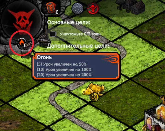 请注意,我们开始积累由这类元素组成的连击。当元素数量超过5个时,地图上所有单位的伤害都会增加50%,包括兽人。所以我们希望让这个机制对我们比对敌人更有利,建议在兽人前进的道路上设置各种障碍物,这样当他们破坏障碍物时,我们就能从远处射击他们。