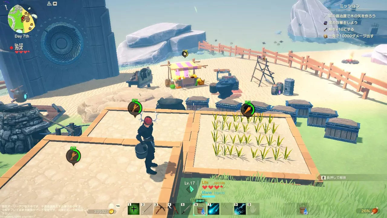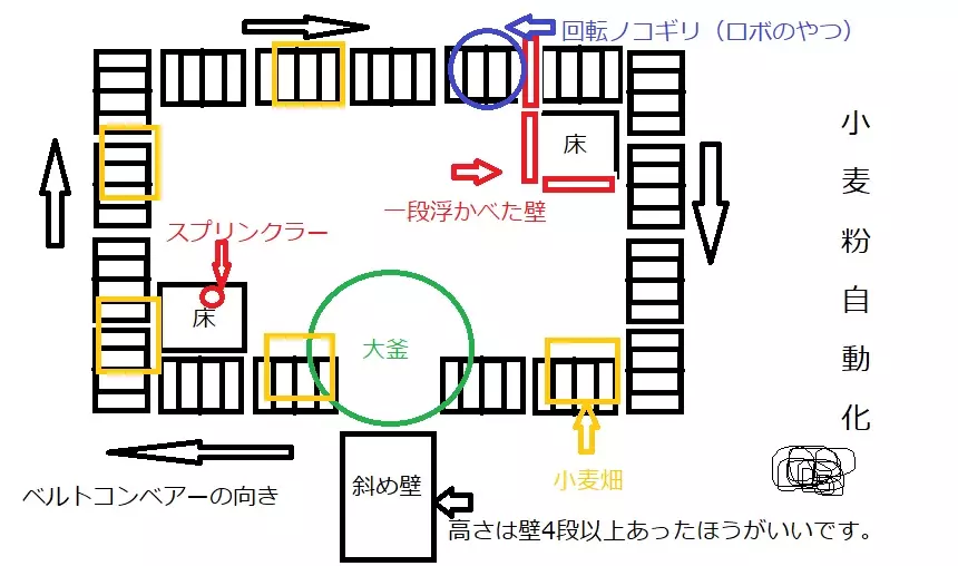 基地 在《创世理想乡》的游戏机制中,重生地点是固定的。 初始岛屿的重生点在栈桥深处,移动到其他岛屿后则在传送门附近。 建造基地有两种选址方式: 1. 在重生点附近搭建 2. 在重生点附近设置移动手段,在可快速到达的地方搭建 由于重生地点固定,能否立即投入工作以及前往其他岛屿的便利性就显得尤为重要。 此外,重生地点通常敌对生物较少,这也是一大优势。守护基地时,务必用墙壁或栅栏将基地围起来,并且把主要设施建造在稍高且敌人攻击不到的平台上,这一点非常重要。 尤其是营火这类设施,野生生物一旦踩踏就会变得狂暴,经常会发生它们一边焚烧周边设施一边肆意破坏的事故。 农业的基础是先开垦麦田,制作水桶打水、浇水,然后等待作物生长成熟后进行收获(通过击打)。不过,作为这款游戏特色的“工业化、自动化”系统其实极为重要。 小麦的需求量会达到数万之多,因此赚钱的关键在于品种改良和销售。如果能够实现自动化生产,那么时薪一亿也并非遥不可及。那么我来解释一下,即使一开始做不到那么好,也建议先做的事情。 先制作移动装置,让它生成水桶。 因为一次会生成10个,所以先收集两次共20个,在此之前不要使用。 用20个水桶制作洒水器。 有了洒水器就不用手动浇水了,而且它一次可以给9格(或者8格?)的田地浇水。 我觉得只要有了洒水器,舒适度就会提升到另一个次元。 关于自动化的部分会另外说明。 【不好的例子:被破坏的基地图片】