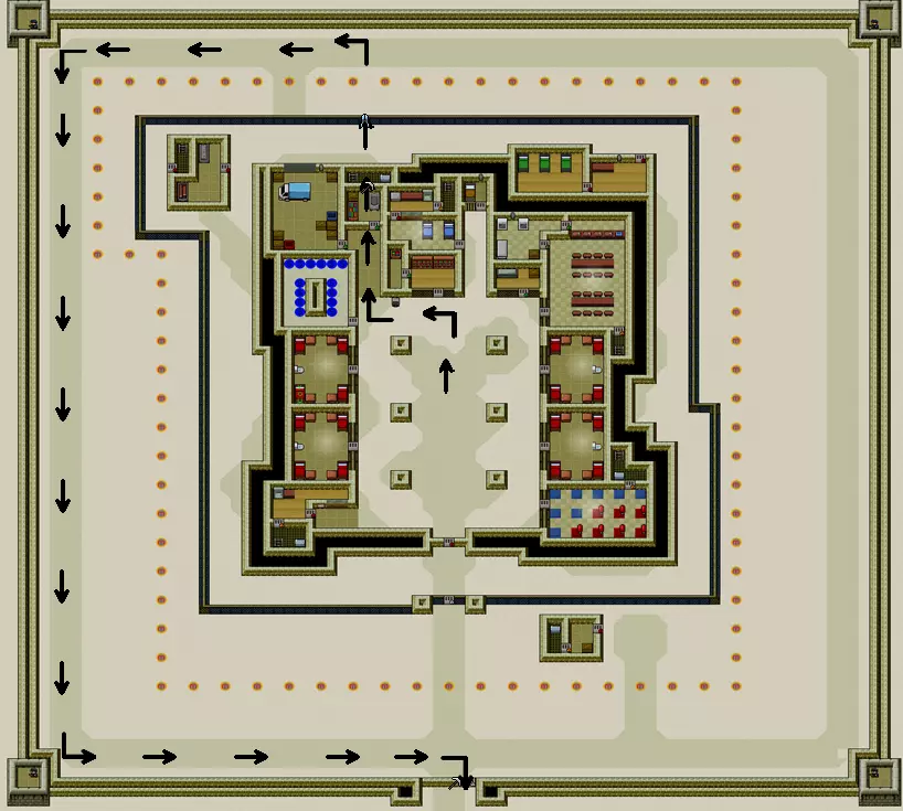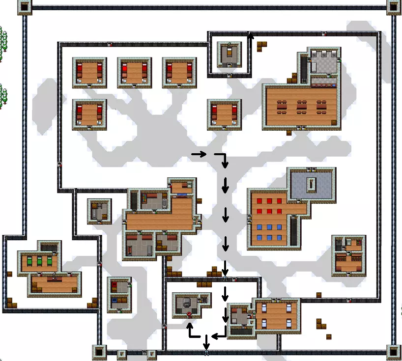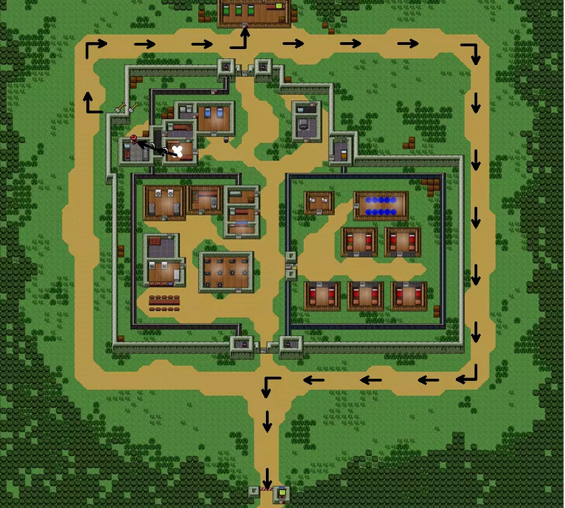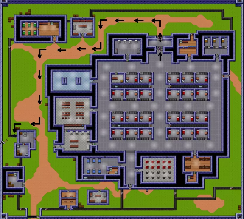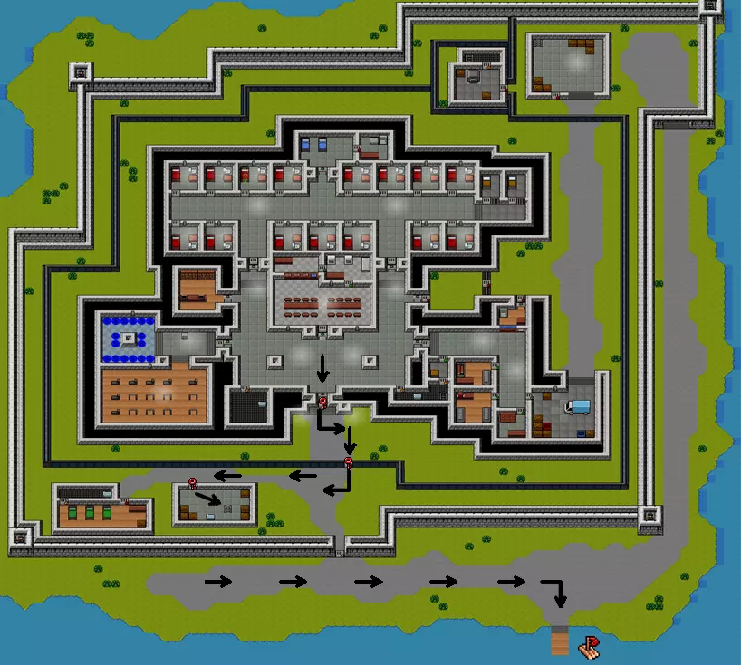 你需要准备: (建议用叉子破坏前两堵墙) -轻型或重型铲子 -重型鹤嘴锄 -墨水和羽毛笔 -警卫制服 -红色钥匙 -假人 同时建议制作多功能工具 进入我用白色十字标记的位置,开始破坏墙壁并放置海报(军官不会进入这个建筑),然后开始破坏通往仓库的墙壁,但要小心,那里偶尔会有军官进入。我们从那里偷木板和金属,然后用海报把洞堵上。制作一把坚固的铲子和任意一把鹤嘴锄。通过仓库再砸开一面通往街道的墙,并用海报堵上。等待警报解除后跑到街上。开始挖两个方块的地道(别忘了穿上狱警制服)。挖通后跑到【警卫室】,从桌子上拿未签名的文件,然后用钢笔、墨水和未签名的文件制作出已签名的文件。现在按照地图所示向下跑,把文件交上去,你就完成了4号监狱【圣潘乔】。