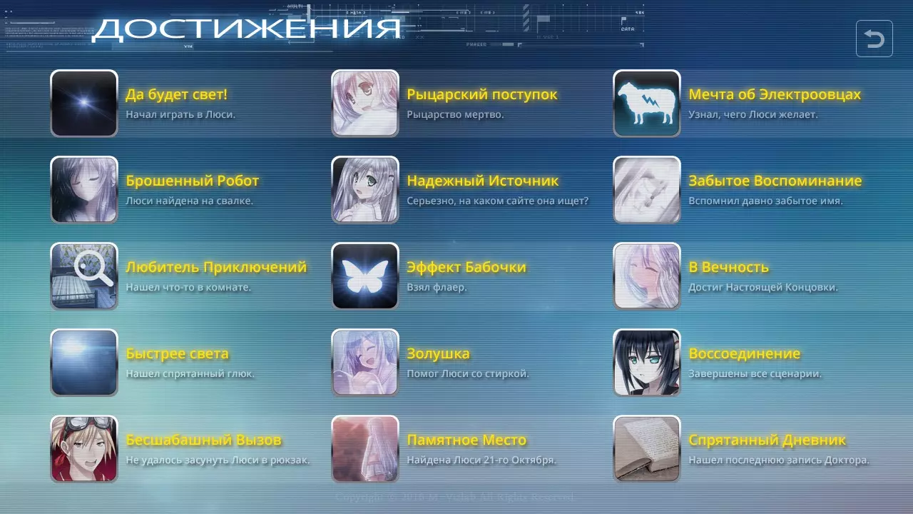1. 开始 2. 尝试插入 3. 自言自语 -> 和机器人交谈 4. 连续点击房间三次,然后点击露西 5. 尝试两次把她塞进背包 -> 背着她 6. 告诉他真相 7. 露西是一个制作极其精良的机器人 8. 当然,你很重! 9. 呸,太糟糕了 10. 留下传单 11. 帮助她 12. 去找她 -> 继续寻找选择两者 观看字幕,继续游戏 最后一个选择会影响结局。回答“我对此不后悔”可获得【真结局】,之后在菜单中点击“破碎的”字母,会开启“10月12日”内容。 回答“我对此感到后悔”可获得【替代结局】 完成上述所有步骤后,进入额外内容,依次通关每个提供的场景。要获取最后一个成就,在菜单中点击发光的“Lusy”字样。进入我们已知位于“额外内容”中的成就,即可解锁“开发者评论”。