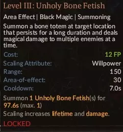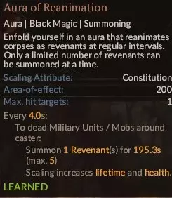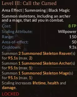 这是游戏前期的核心技能,后期则不再需要。它能召唤几个骷髅兵,这些骷髅兵能造成不错的打击伤害,并且对3级法术极为有效,因为它们可以充当肉盾(或者说骨盾?),这使得 necromancer(死灵法师)成为能同时有效输出魔法伤害和打击伤害的法师之一,而且在魔力消耗方面通常比虚空箭更具性价比。到了后期,你会遇到很多拥有范围攻击的敌人,而骷髅兵由于生命值较低,往往存活不了多久,难以发挥作用。投入一点技能点。