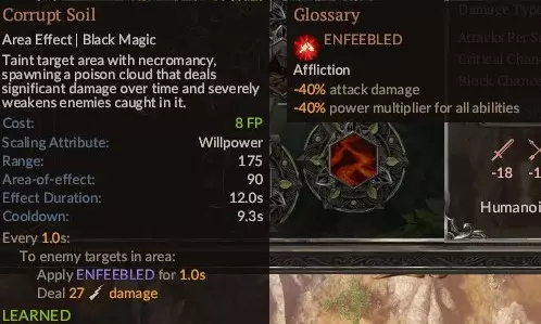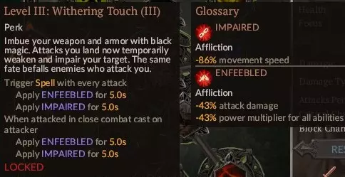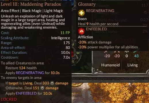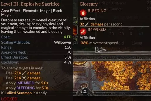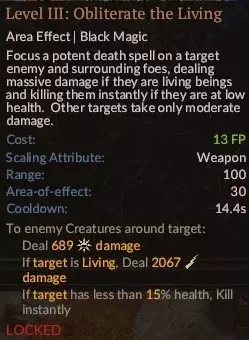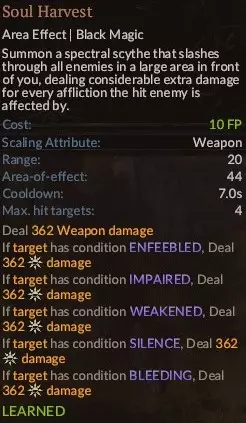 这是一个非常强大的法术,使用起来有点 tricky,但它也是你最强的单体法术,同时也能击杀多个敌人。最重要的是,使用前要确保目标敌人至少带有三种负面状态,负面状态越多,造成的伤害就越高,其中一种必须是【虚弱】。我个人喜欢搭配四种:【流血】、【衰弱】、【受损】、【虚弱】。如果目标是一些不太强的敌人,一到两种负面状态可能就足够了。该法术的伤害会随你的武器属性而变化。由于游戏中没有对此进行说明,我来解释一下:例如,你的角色使用斧头,斧头的伤害会随你的力量属性提升,那么【灵魂收割】也会随你的武器属性——力量而提升。如果你使用匕首(其属性随敏捷值提升),那么该法术的属性也会随敏捷值提升;如果使用魔杖(其属性随智力值提升),那么智力值将成为该法术的属性提升项。武器品质无关紧要,无论它是稀有、史诗还是仅仅是件垃圾装备。【提升至最高】。顺便说一下,【血之收割】的视觉效果非常棒。