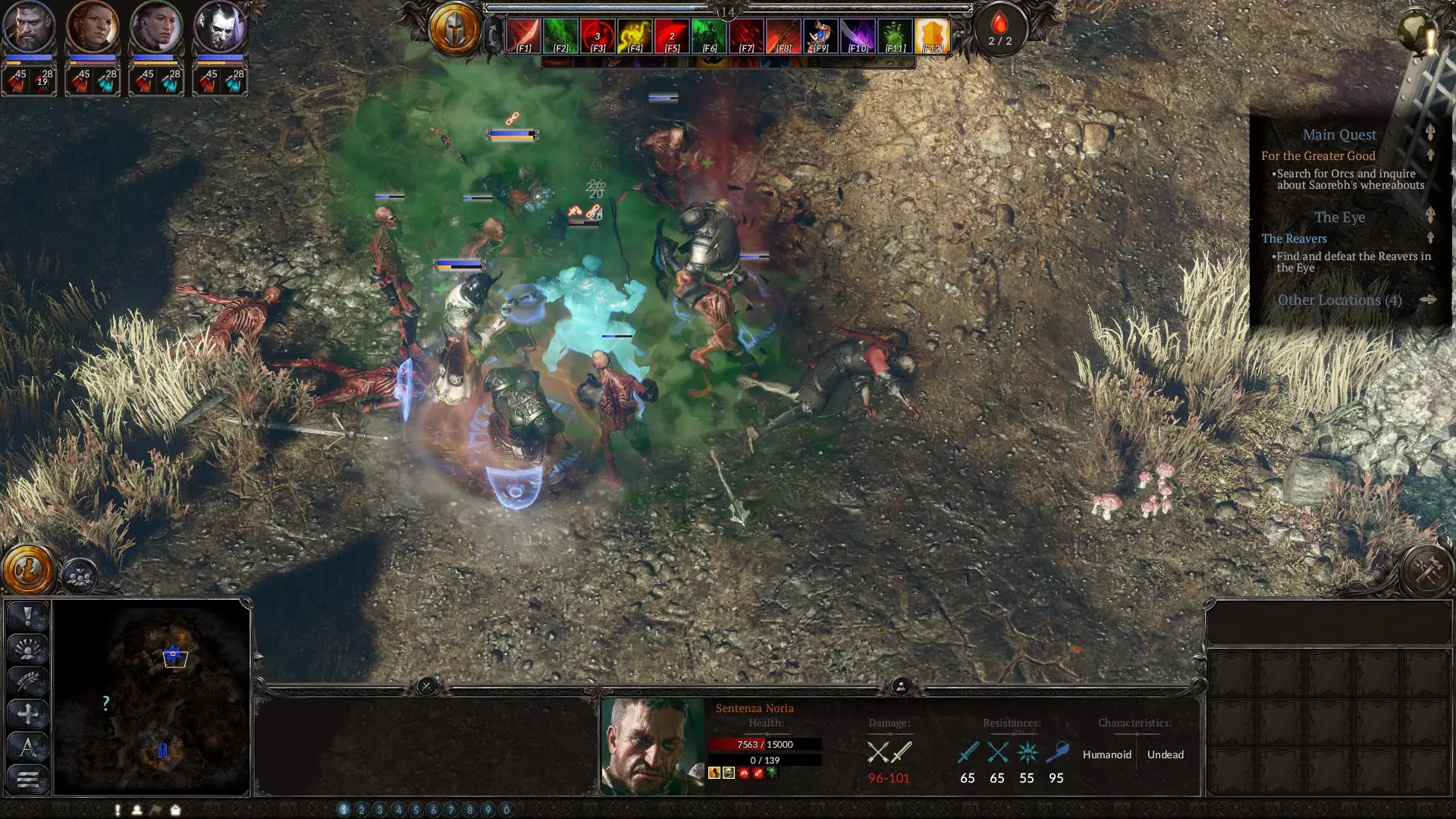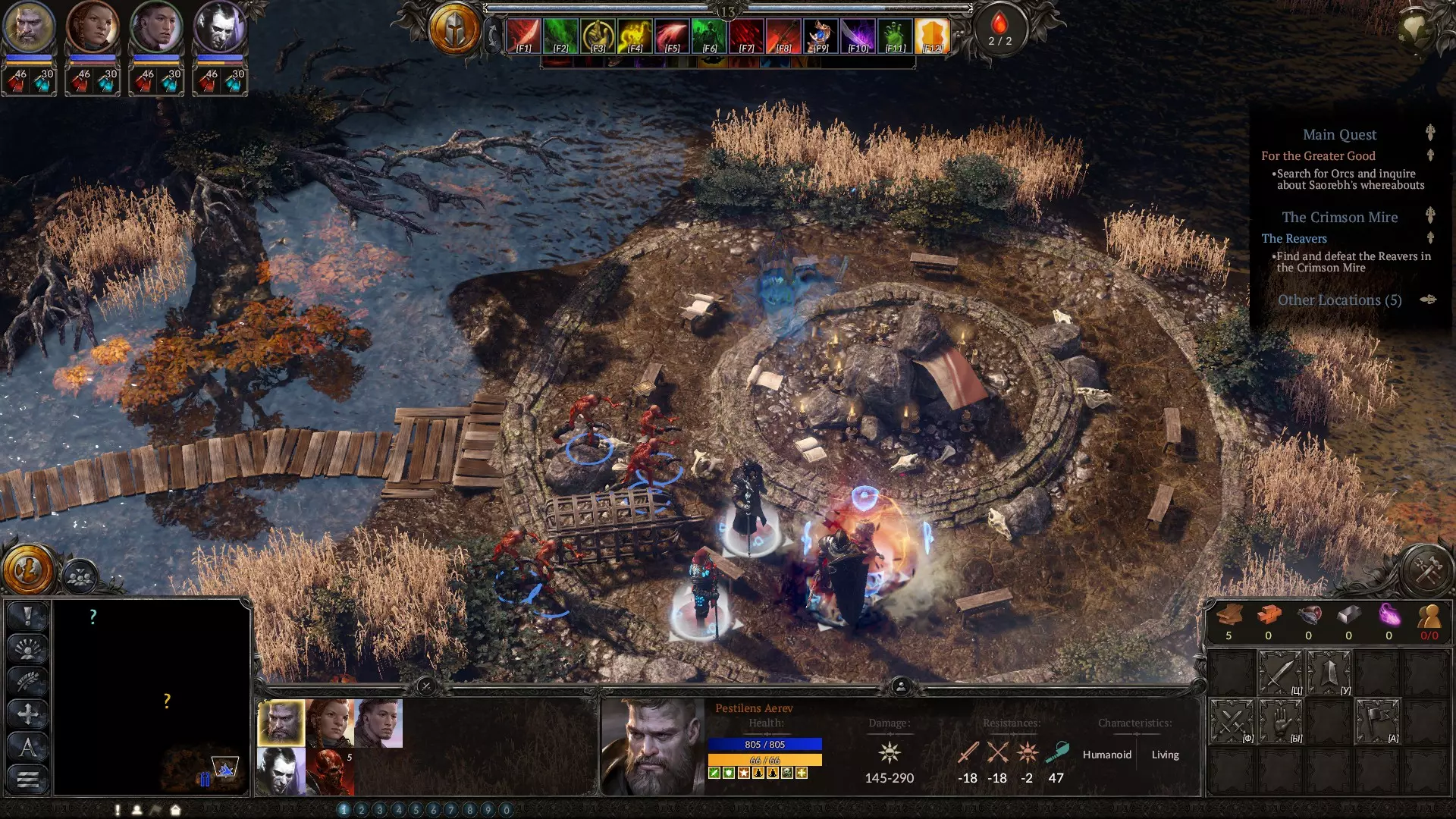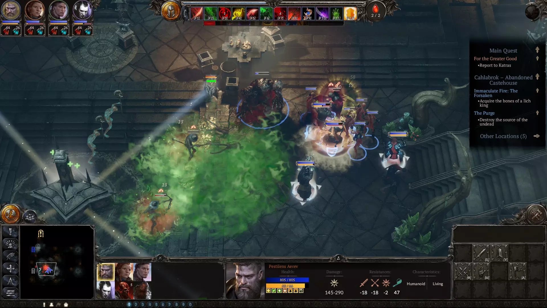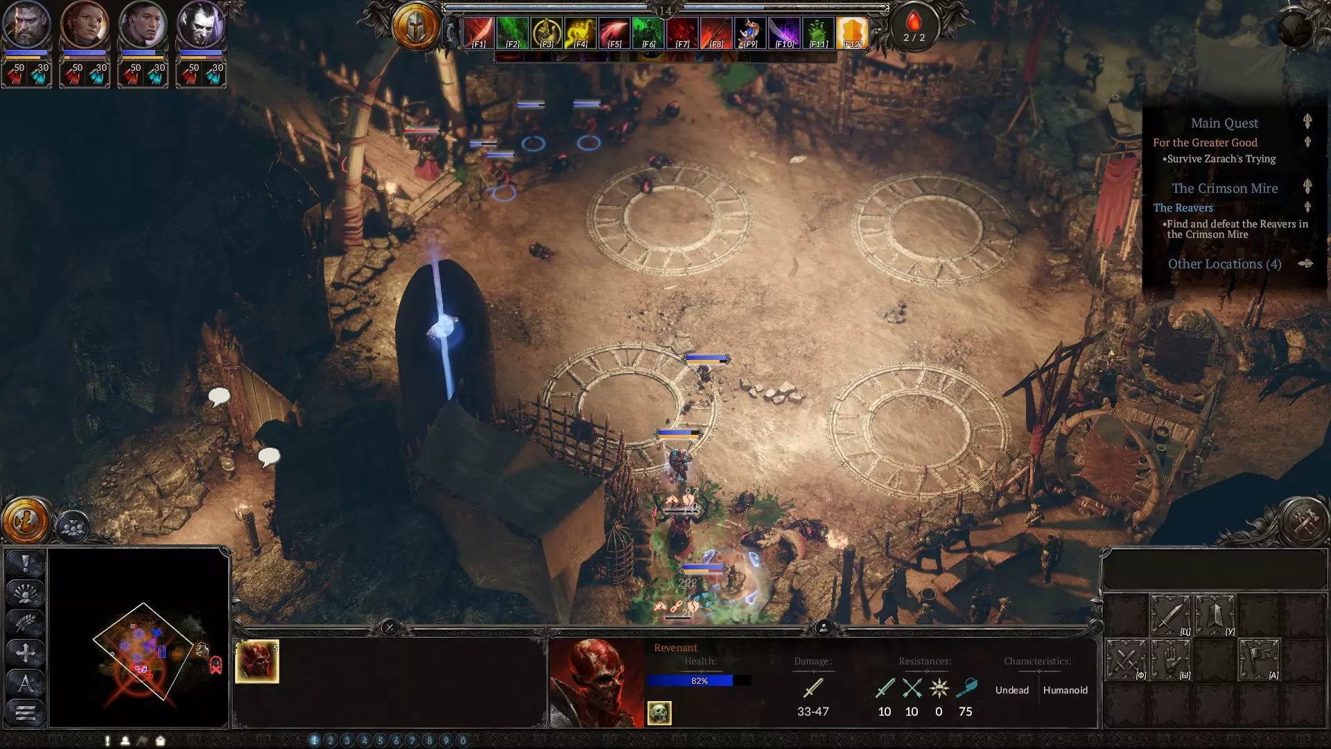 在策略阶段,当你需要应对数量众多但实力较弱的敌人时,这是你最出色的法术之一。该法术会召唤亡魂,它们虽然不擅长击杀敌人,但拥有相当不错的生命值,是你最佳的肉盾。务必升到满级。下方是血坑的截图,你在那里会受到来自多个方向的攻击。我的角色负责对付其中一组敌人,而亡魂则扛住另一组。