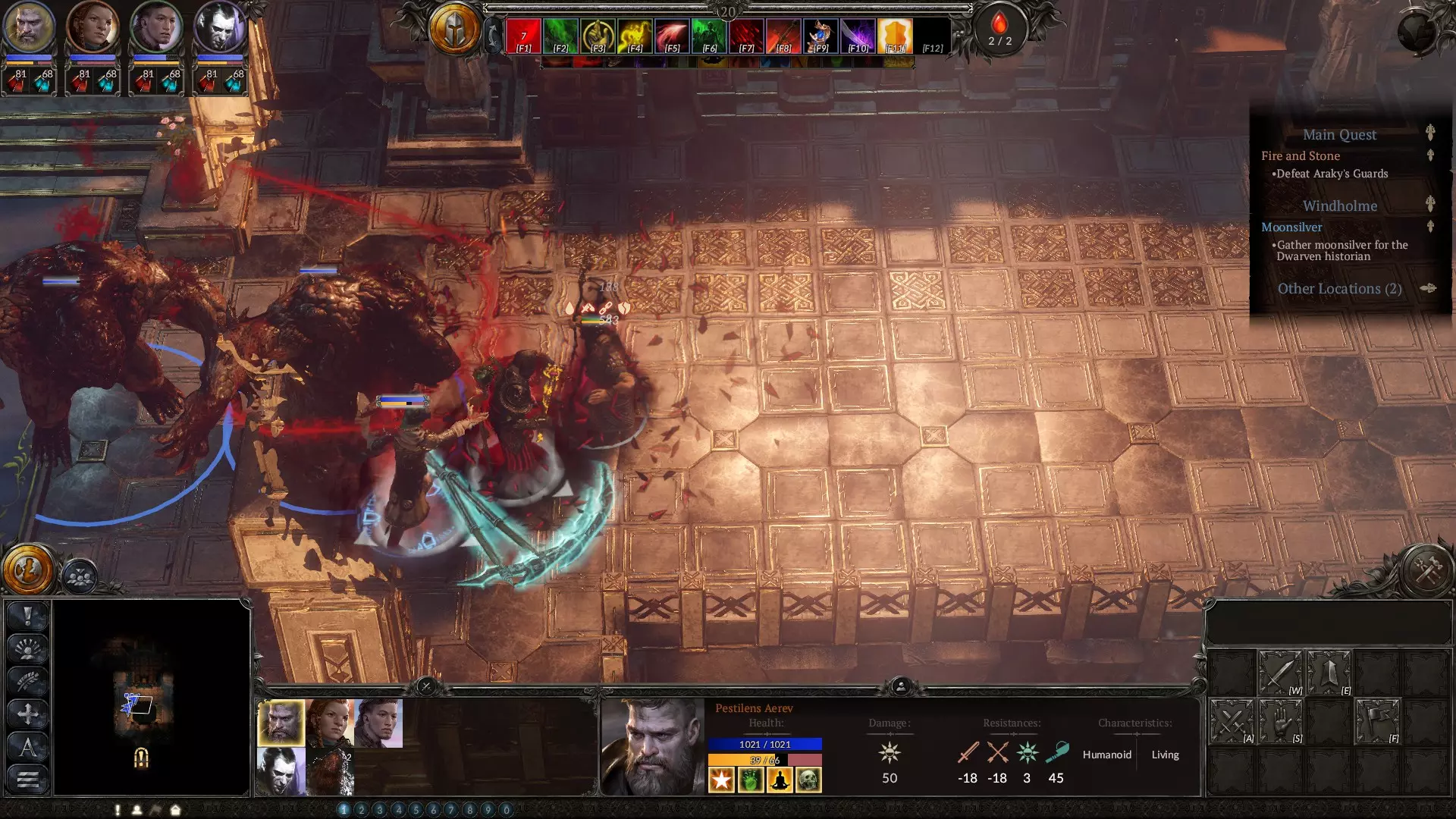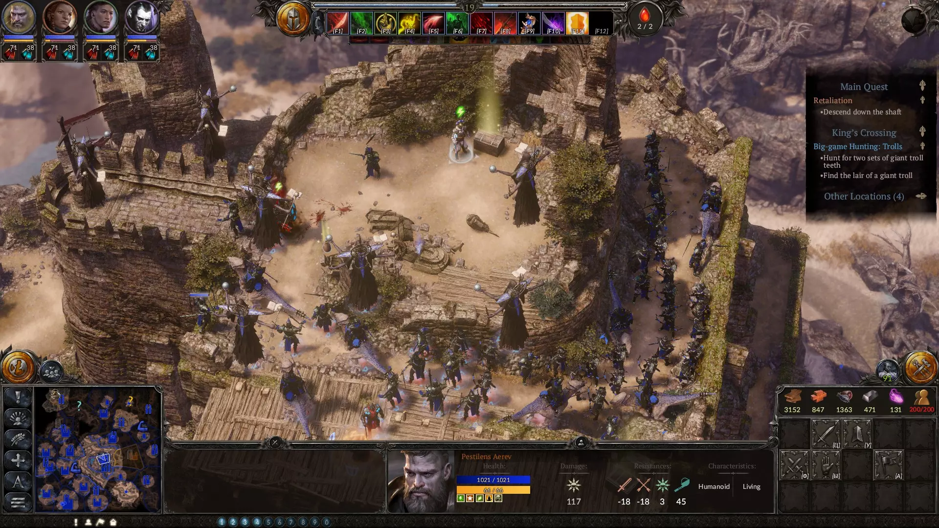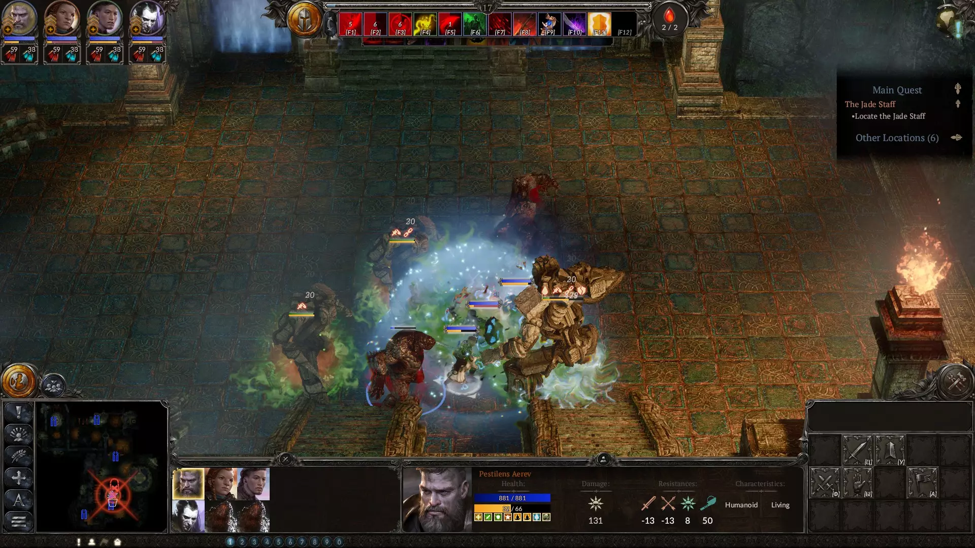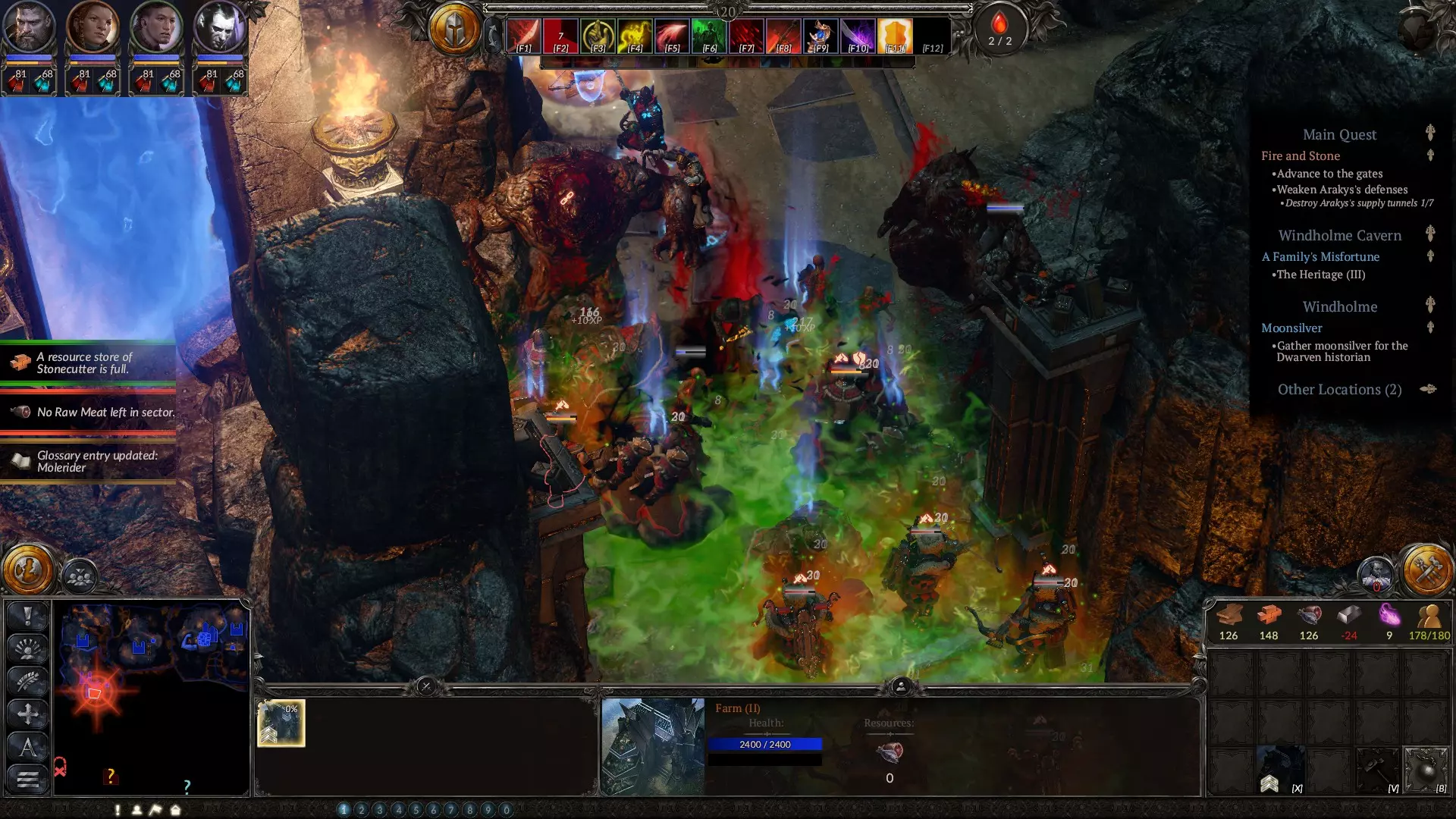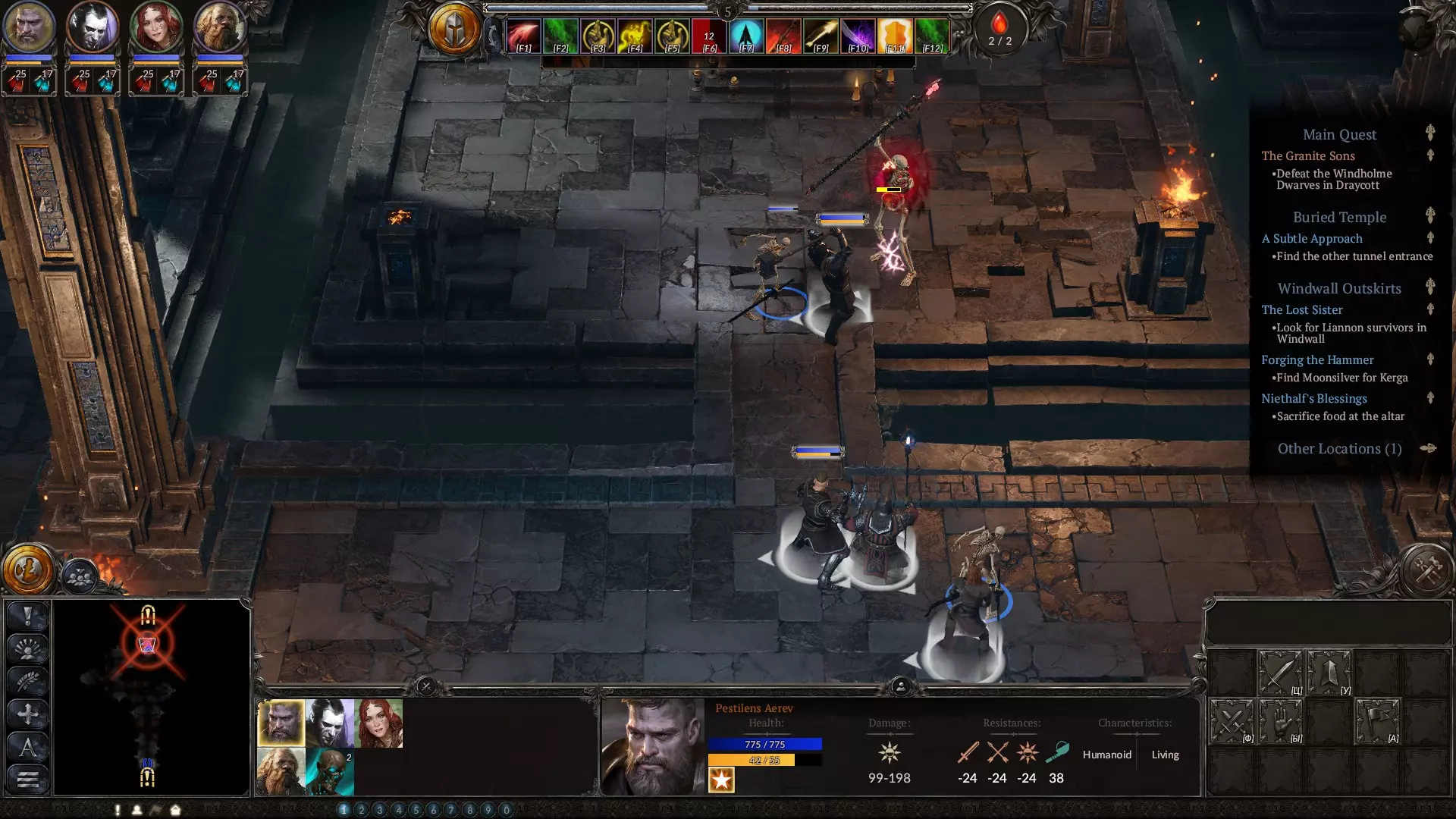 在策略阶段,当你需要应对数量众多但实力较弱的敌人时,这是你最出色的法术之一。该法术会召唤亡魂,它们虽然不擅长击杀敌人,但拥有相当不错的生命值,是你最佳的肉盾。务必升到满级。下方是血坑的截图,你在那里会受到来自多个方向的攻击。我的角色负责对付其中一组敌人,而亡魂则扛住另一组。