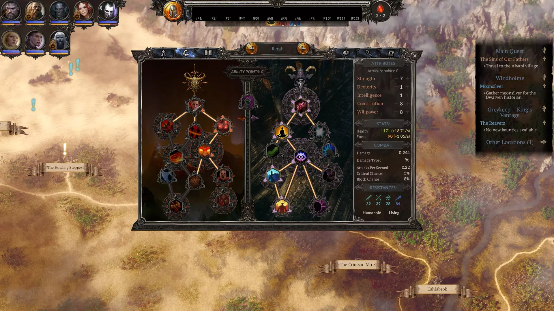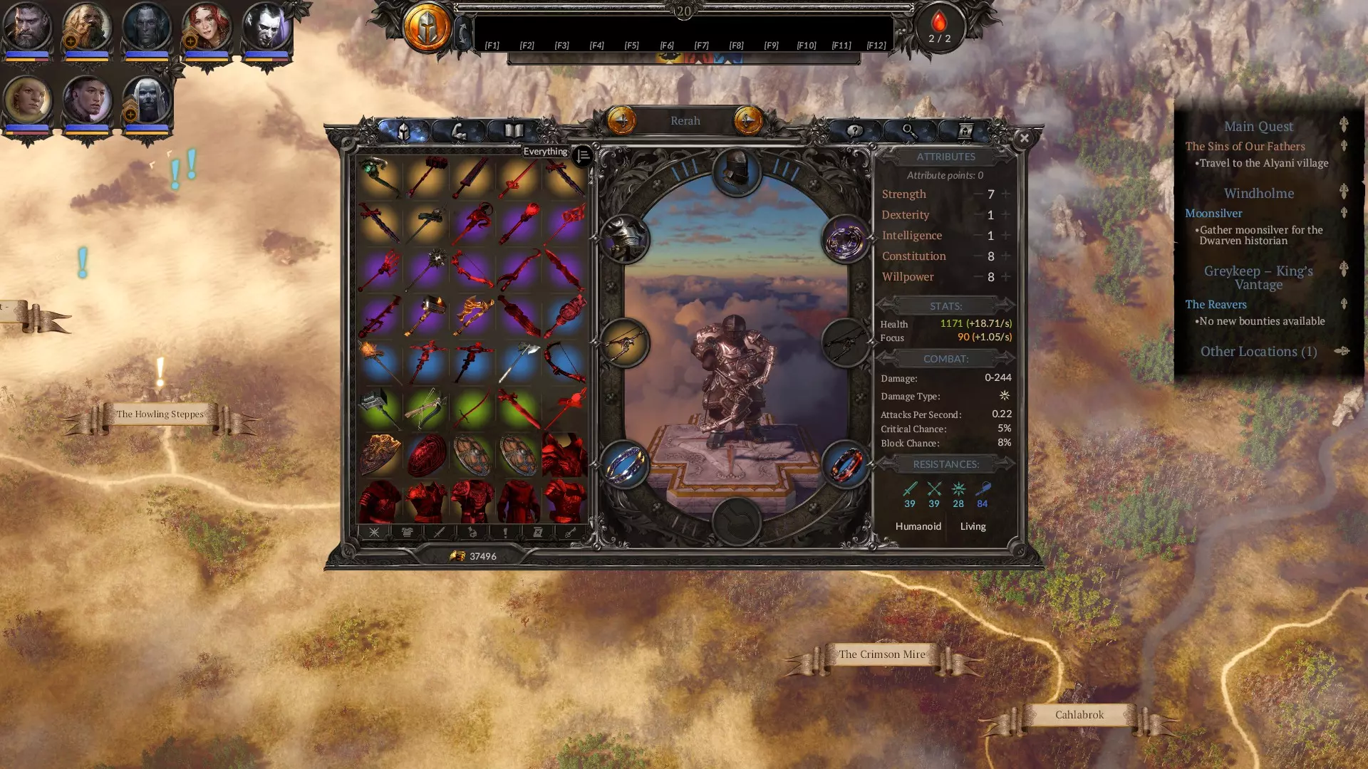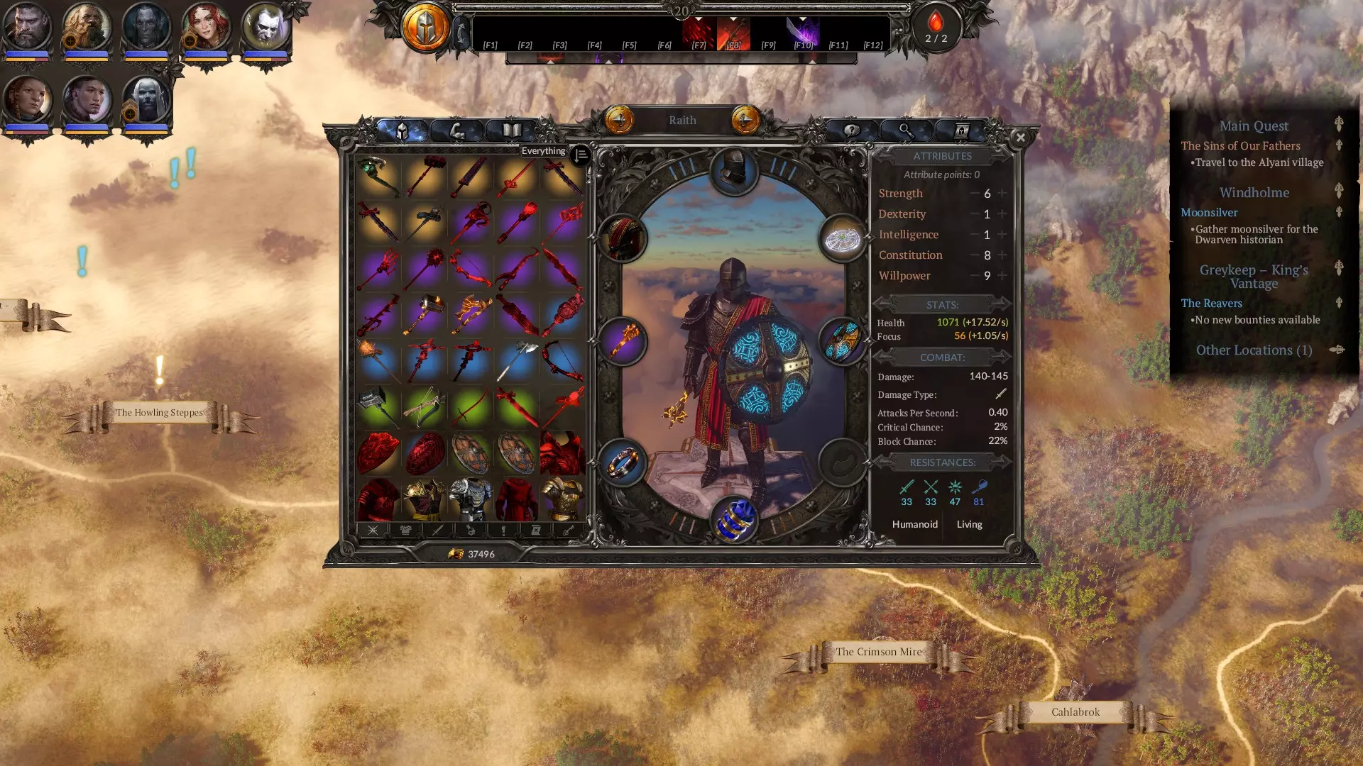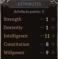 属性指南 游戏内已有清晰说明,因此我不会详述所有属性相关内容。以下是简要建议: 不要提升力量和敏捷,你并非真正需要它们。或许投入少量技能点到敏捷以进一步减少冷却时间是个不错的主意,但你更需要将技能点分配给智力以提升专注值恢复速度,以及意志力以增加专注值总量。此外,部分装备(如【神圣感知】)对属性要求极高。其余所有点数应投入体质以提升生存能力。创建艾瑞夫时,初始属性设为5点智力、3点体质、5点意志力,之后根据你想使用的装备调整属性即可。 我的最终属性。