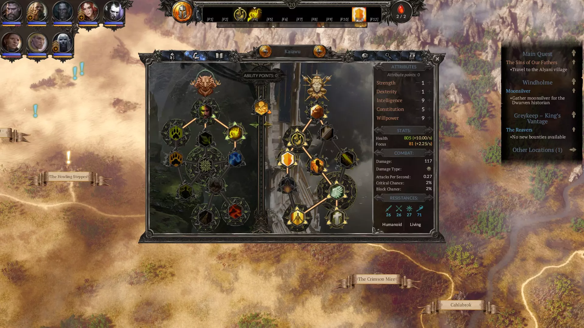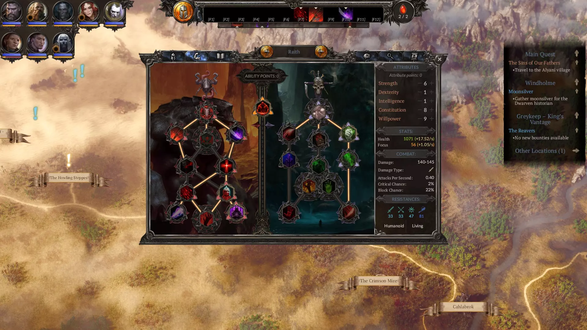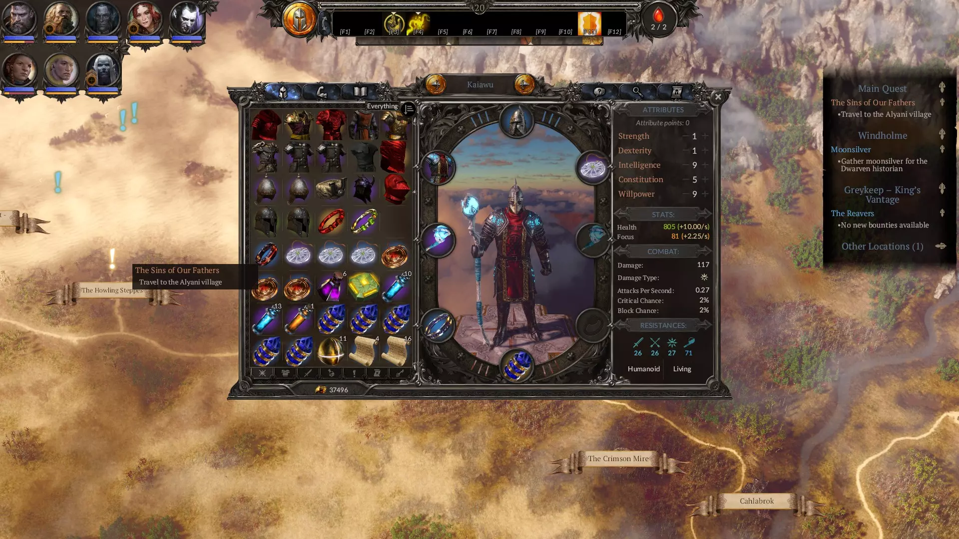 属性指南 游戏内已有清晰说明,因此我不会详述所有属性相关内容。以下是简要建议: 不要提升力量和敏捷,你并非真正需要它们。或许投入少量技能点到敏捷以进一步减少冷却时间是个不错的主意,但你更需要将技能点分配给智力以提升专注值恢复速度,以及意志力以增加专注值总量。此外,部分装备(如【神圣感知】)对属性要求极高。其余所有点数应投入体质以提升生存能力。创建艾瑞夫时,初始属性设为5点智力、3点体质、5点意志力,之后根据你想使用的装备调整属性即可。 我的最终属性。