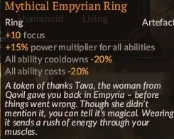 这并非针对你的角色,而是针对你的一名队友。当你使用【鲜血收割】时,传播痛苦状态确实很有帮助。 14. 最后要提的是一枚带有额外属性点的戒指,属性可以是智力、意志力或体质,实际上你喜欢上述任何一种都可以。