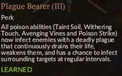 前期较弱,后期是核心技能之一。它的纯伤害不高,但能大幅削弱敌人,让你有更好的生存机会,减少治疗法术的使用。瘟疫使者专长能使其伤害翻倍。建议点满。以下是具体效果。