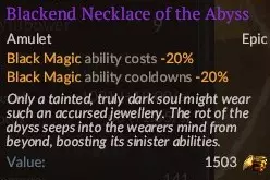 能降低法术专注消耗的 perk。【最大化】,【最大化】,【最大化】,尽你所能点满,至少当你的第二技能树是德鲁伊学时。 装备指南 死灵法师装备的目标是降低法术的专注消耗和冷却时间。如果你堆叠多件装备,就能以极低的消耗持续释放强力法术,造成毁灭性伤害。以下是我认为该流派的最佳装备。如果看到【SR】,表示这件装备是该流派的强烈推荐,其他装备可在未找到更好选择时使用。 1. 深渊焦黑项链。【SR】